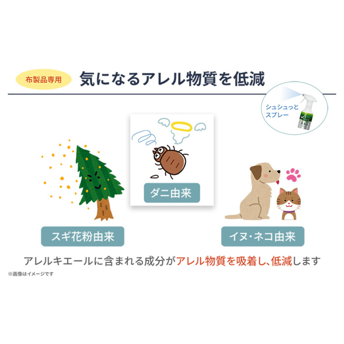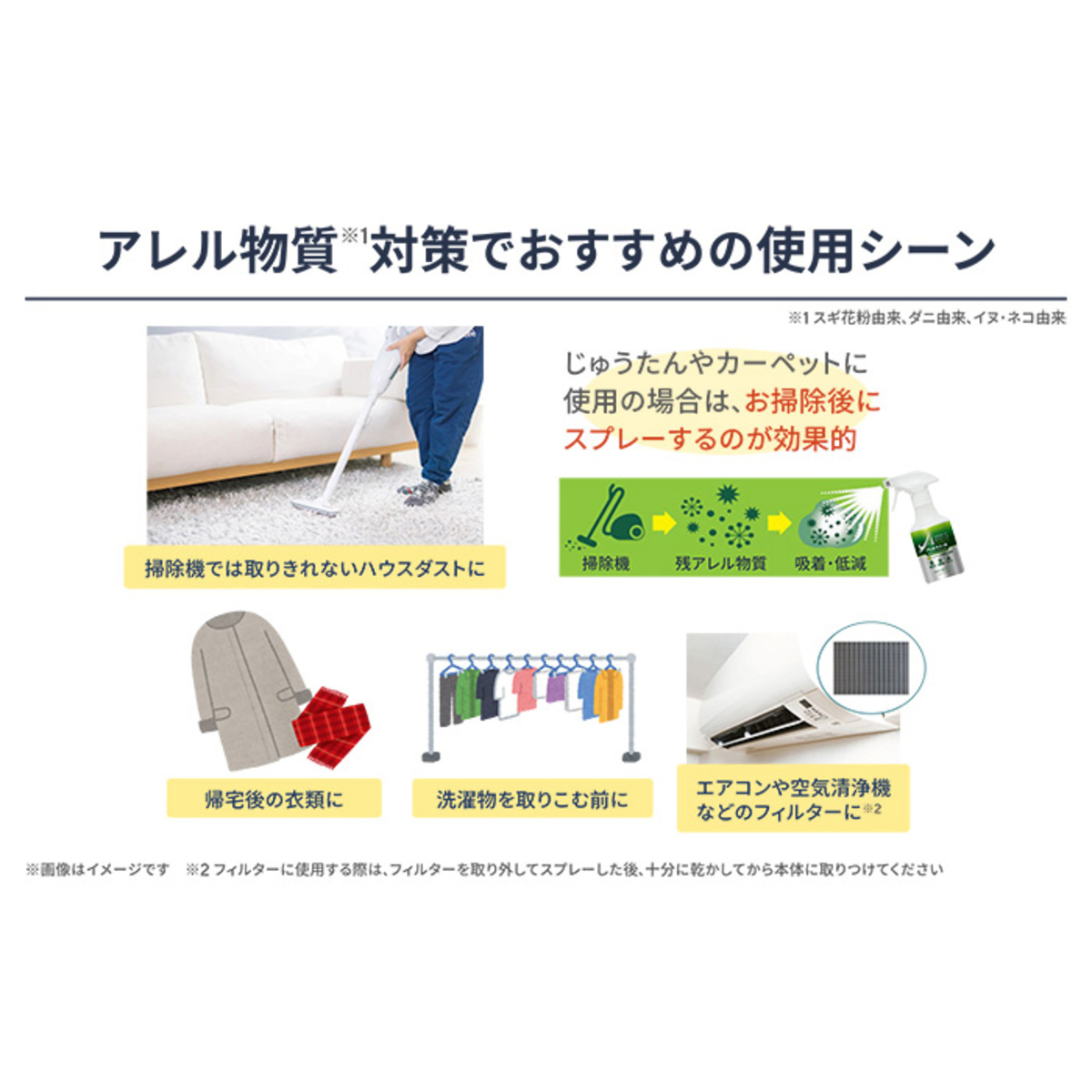 [用途] アレル物質低減化剤(布製品用) [使用方法] 1.先端部分をONに回してください。 2.対象物から20-30cm離して、表面が全体的に湿り気を帯びる程度にスプレーしてください 3.使用後は先端部分をOFFにし、立てて保管してください 4.スプレー後は充分に自然乾燥させてください [注意事項] ※皮・和装品へは使用不可 ※直射日光のあたる場所や温度差の激しい場所(車内、電化製品の上など)での保管は避ける ※子供の手の届く場所での保管は避ける ※皮・和装品へは使用不可。毛、絹・レーヨン・アセテート・キュプラなど水に弱い繊維、水洗い不可の表示があるもの、防水・撥水加工など特殊加工されたものは、シミになったり、風合いを損ねる恐れがあるので、あらかじめ目立たない部分で試す ※20cmより近づけたり、一度にスプレーしすぎたりしない。シミやべたつきの原因になることがある ※汚れのあるものは、汚れが原因の輪ジミを起こすことがある ※汚れが原因のニオイは、使用後、汚れから再びニオイが発生することがある ※トリガーを手早く最後まで引きスプレーする ※床や家具など布製品以外についた場合はすぐにふき取る ※食品、食器類、美術品、おもちゃ、電化製品、精密機器、ペット等にかからないようにする ※狭い空間で使用するときは、換気して使用する ※使用方法を守り、用途以外に使用しない ※火に向けてスプレーしない ※人やペットに向けてスプレーしない ※目に入った場合は、水で十分洗い流す ※飲みこんだ場合、吐かせずに水を飲むなど処置をする ※気分が悪くなったり身体に異常を感じた場合は使用を中止し、本品を持参して医師に相談する 【日本製】 [成分] 消臭成分、抗菌成分、アレル物質低減化成分