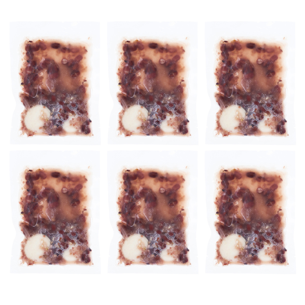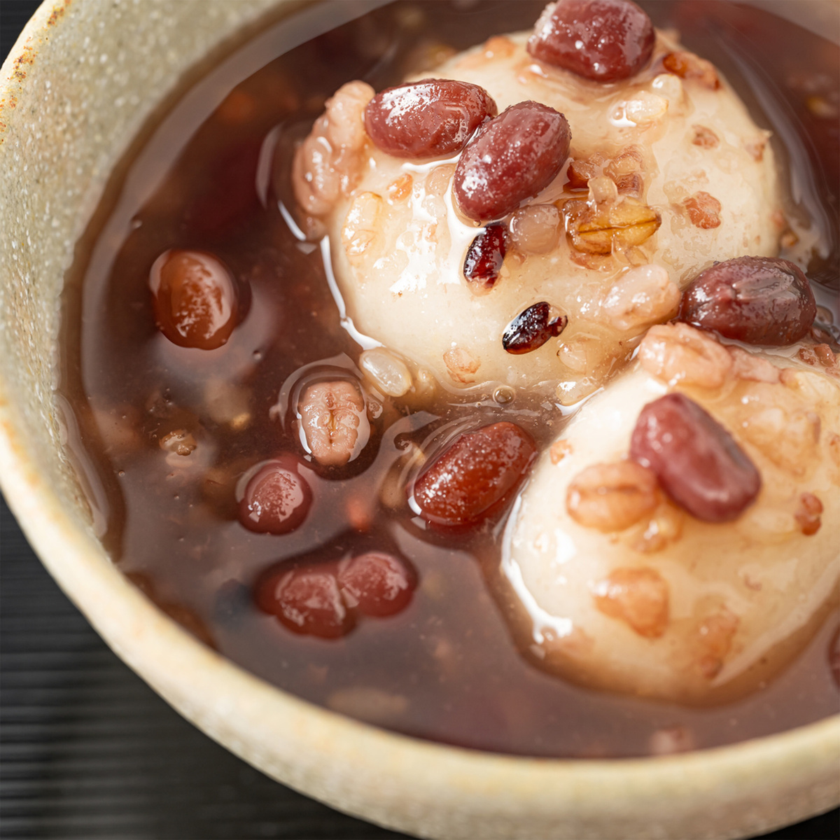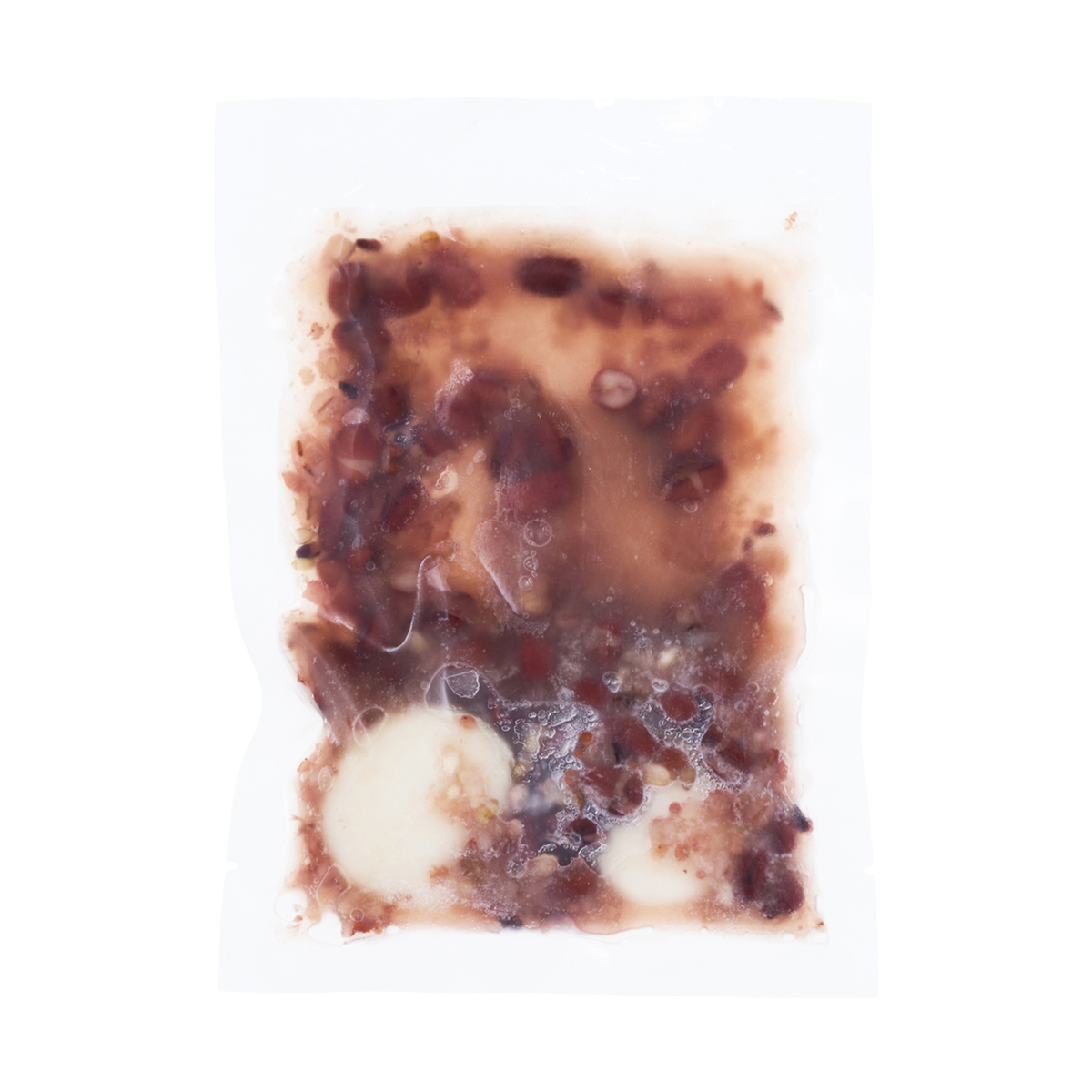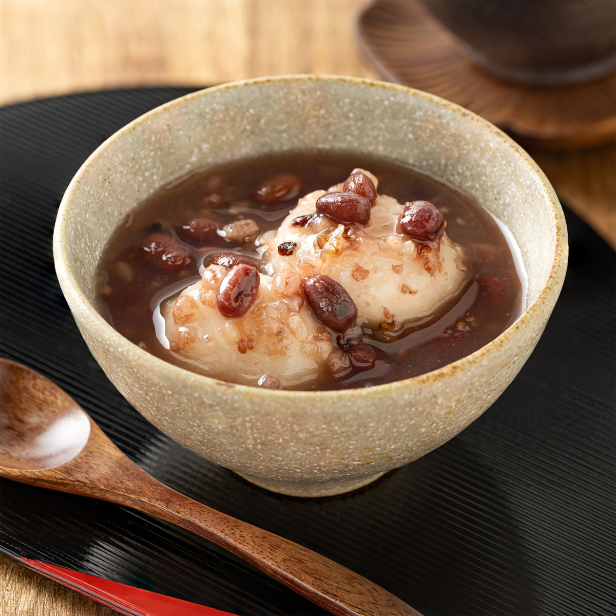 ぜんざいの味付けは砂糖に少量の食塩を加え、小豆が柔らかくなるまでじっくり炊き上げました。でき上がったぜんざいとお餅は1つの袋に入れて美味しい状態そのままに冷凍。食べたいときに湯煎で温めるだけで、いつでもお召し上がりいただけます