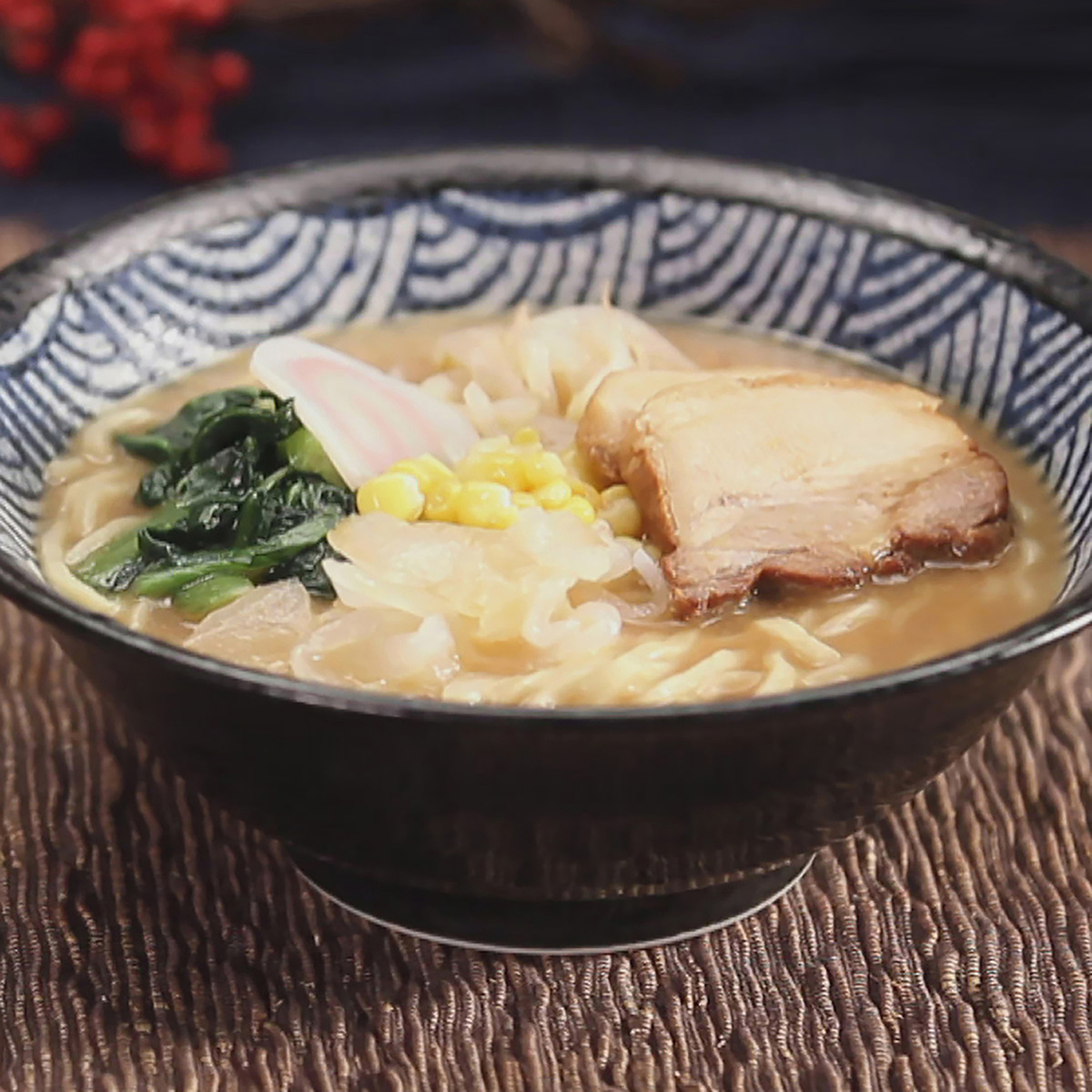 豚骨パイタンベースのスープは、パイタンのコクと味噌の味わいのバランスが絶妙。自慢は当社のレギュラーのチャーシューの約2倍の時間をかけて煮込んだ、厚切りチャーシュー。もやし(国産)、たまねぎ(国産)、小松菜(国産)、コーンと野菜もたっぷりです