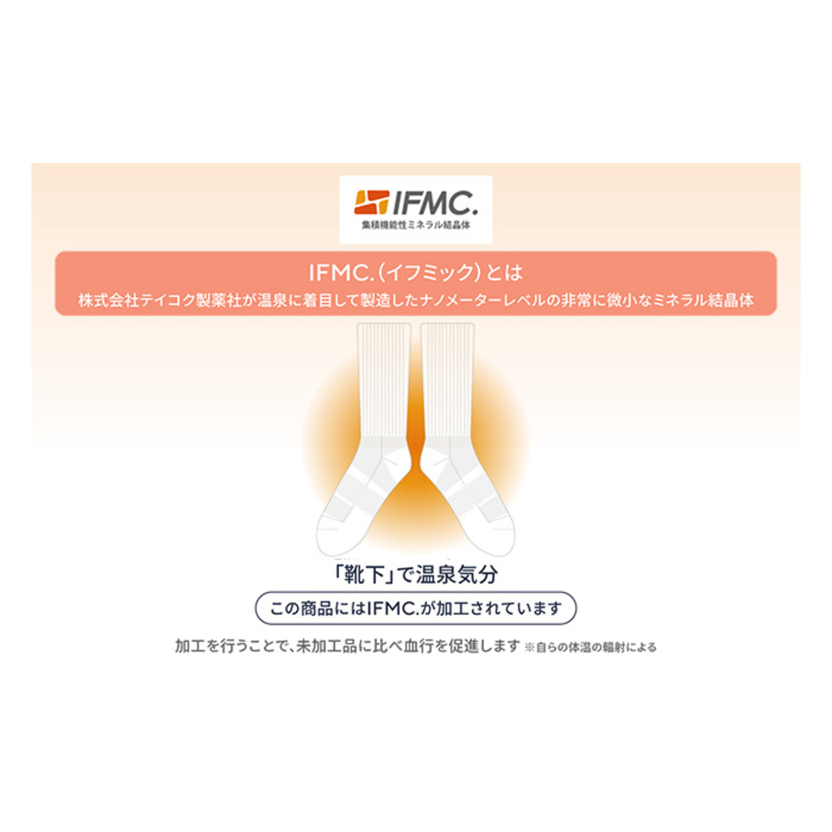 温泉に着目したミネラル結晶体「IFMC」加工を施した靴下。IFMCは、株式会社テイコク製薬社が温泉に着眼して製造した、ナノメーターレベルの非常に微小なミネラルの結晶体です。同素材による加工を行うことで、未加工品に比べ血行を促進します