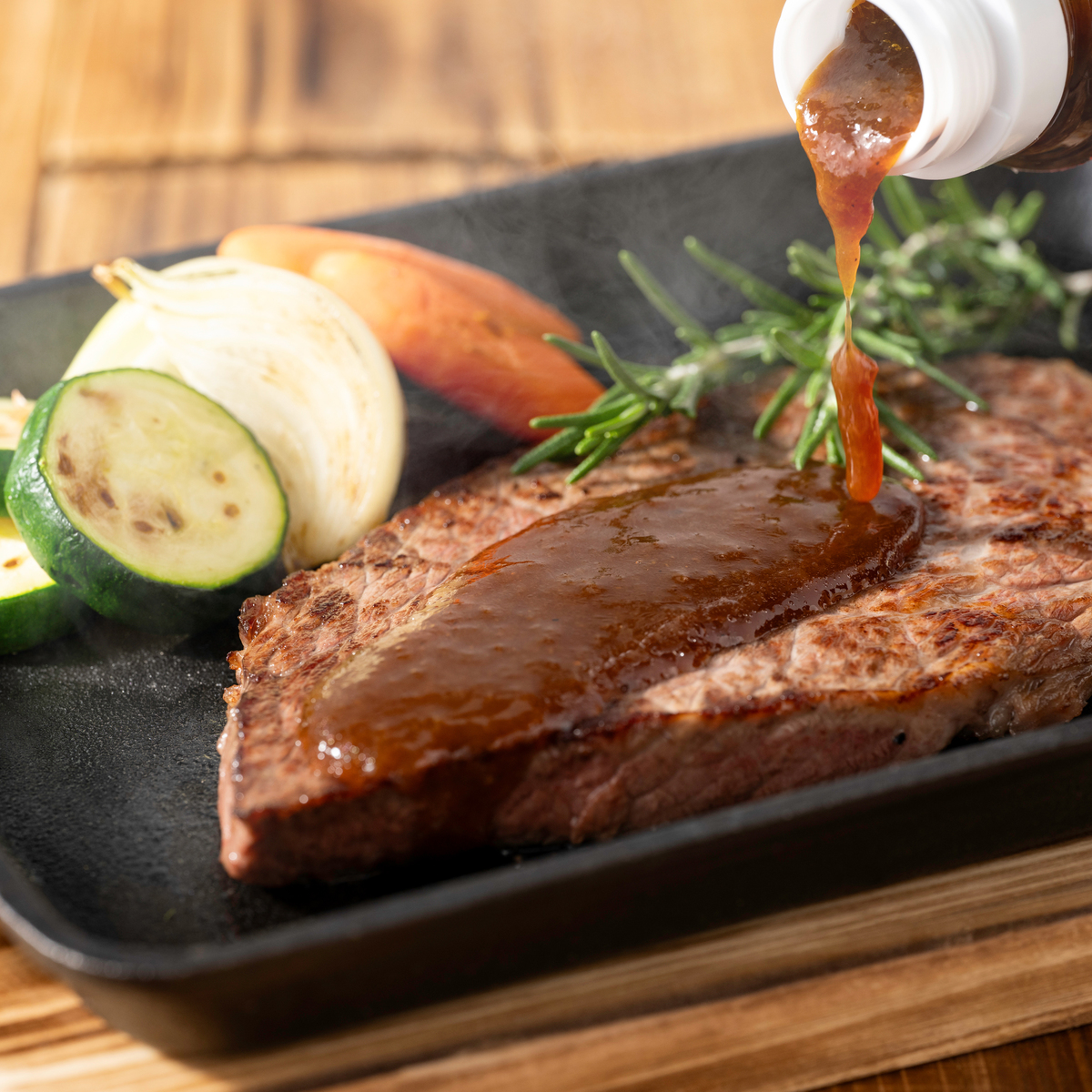 国産玉ねぎと九州で製造した醤油で仕上げたステーキソース。ジャポネソースをベースに、すりおろし玉ねぎや生姜、にんにくなどの香味野菜を合わせた和風の味わいが特長です。肉料理はもちろん、パスタやうどん、魚や野菜のフライなど幅広い組合せで楽しめます