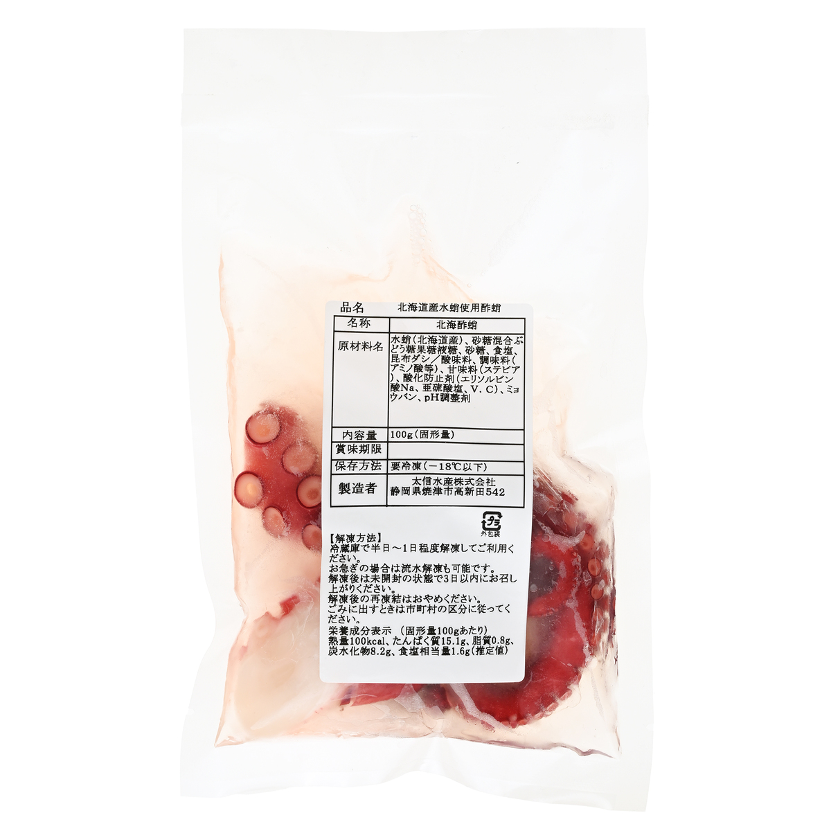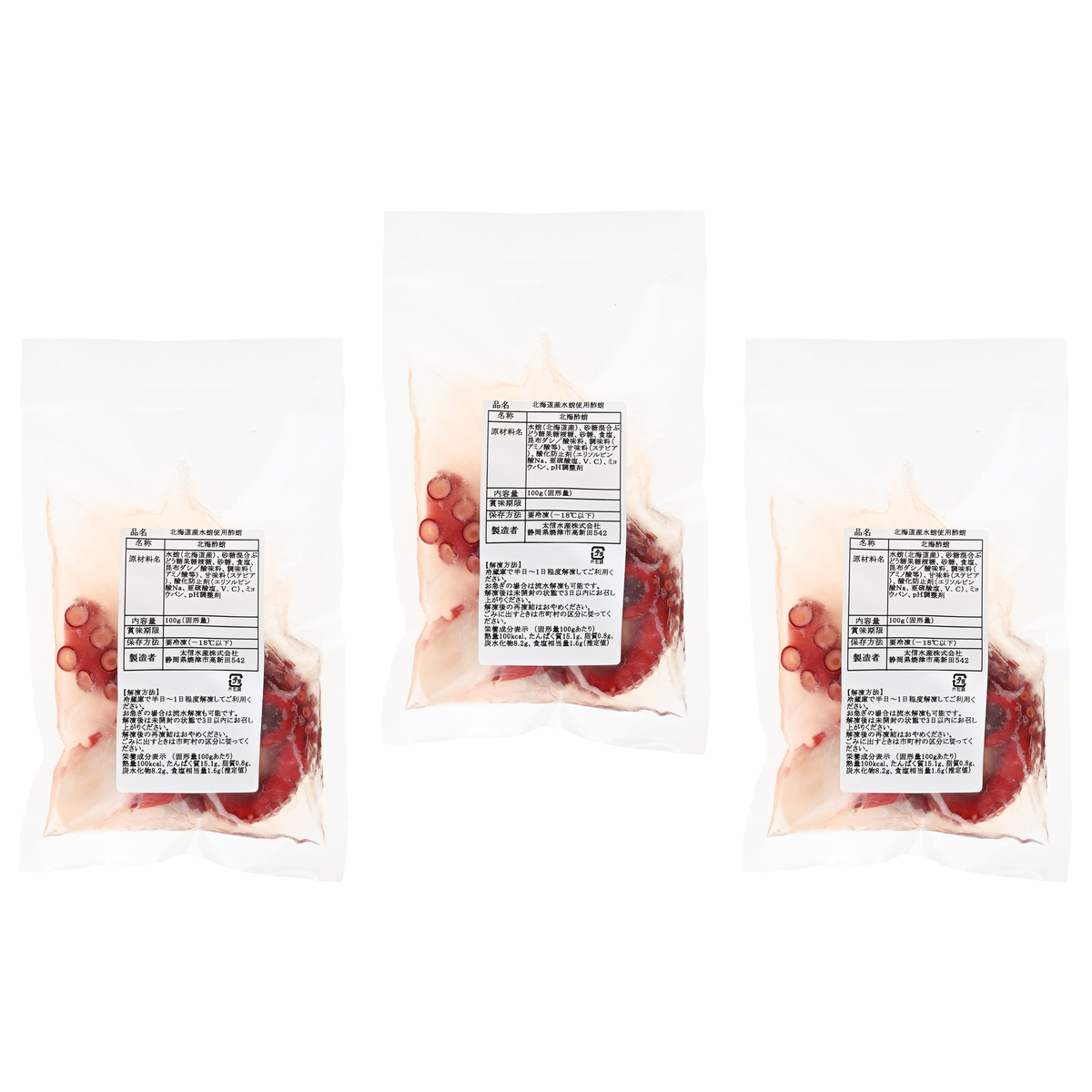 [アレルギー物質特定原材料8品目] なし [内容量] 100g(固形量)×3パック [賞味期限] 出荷時点で賞味期限まで60日以上ある商品をお届けします [保存方法] 開封前:要冷凍(ー18℃以下)で保存してください 開封後:解凍後は未開封の状態で3日以内にお召し上がりください [お召し上がり方] ・冷蔵庫で半日〜1日程度解凍してご利用ください ・お急ぎの場合は流水解凍も可能です [注意事項] ※解凍後の再凍結おやめください [原料原産地] 水蛸(北海道産) [原産国] 日本 [原材料]
