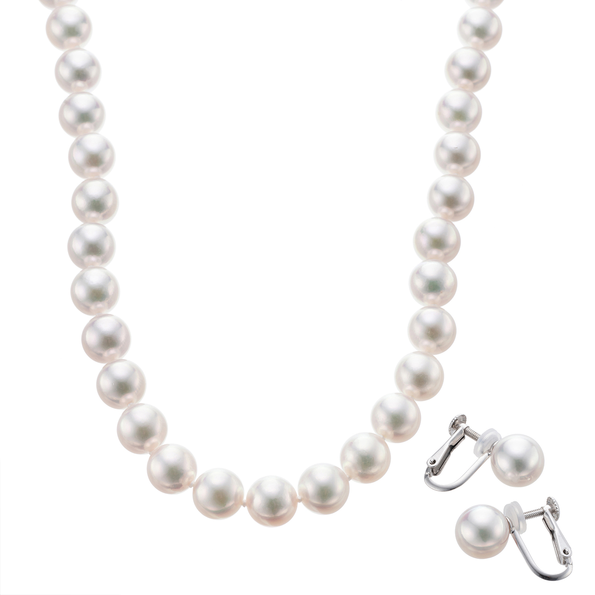 素材:<ネックレス> [アコヤ真珠] 8.5mmUP ラウンド 貫通(オールノット) <イヤリング・ピアス> [アコヤ真珠] 8.5mmUP ラウンド 芯立て/接着 2珠 [地金] ネックレス:シルバー、洋白 イヤリング:シルバー ピアス:14Kホワイトゴールド [メッキ] ロジウムメッキ <ネックレス> 総重量(約) 41.0g 長さ(約) 45.0cm 幅(約) 8.5mm 留具の形状 差し込み式 アジャスターの有無 無 <イヤリング> 縦×横(約):8.5×8.5mm(金具含まず) 総重量(約):2.6g 留具の形状:ミックス(シリコン付) <ピアス> 縦×横(約):8.5×8.5mm(金具含まず) 総重量(約):2.1g 留具の形状:ポスト&キャッチ(シリコン付) [付属品]鑑別書、パールキーパー、真珠てりクロス ■受注発注商品のためデザイン・価値に影響のない範囲で仕様が変わる場合がございます ■素材の大きさ・形・色合い、製品のサイズは1点1点多少異なります ■専用ケース付 【日本製】