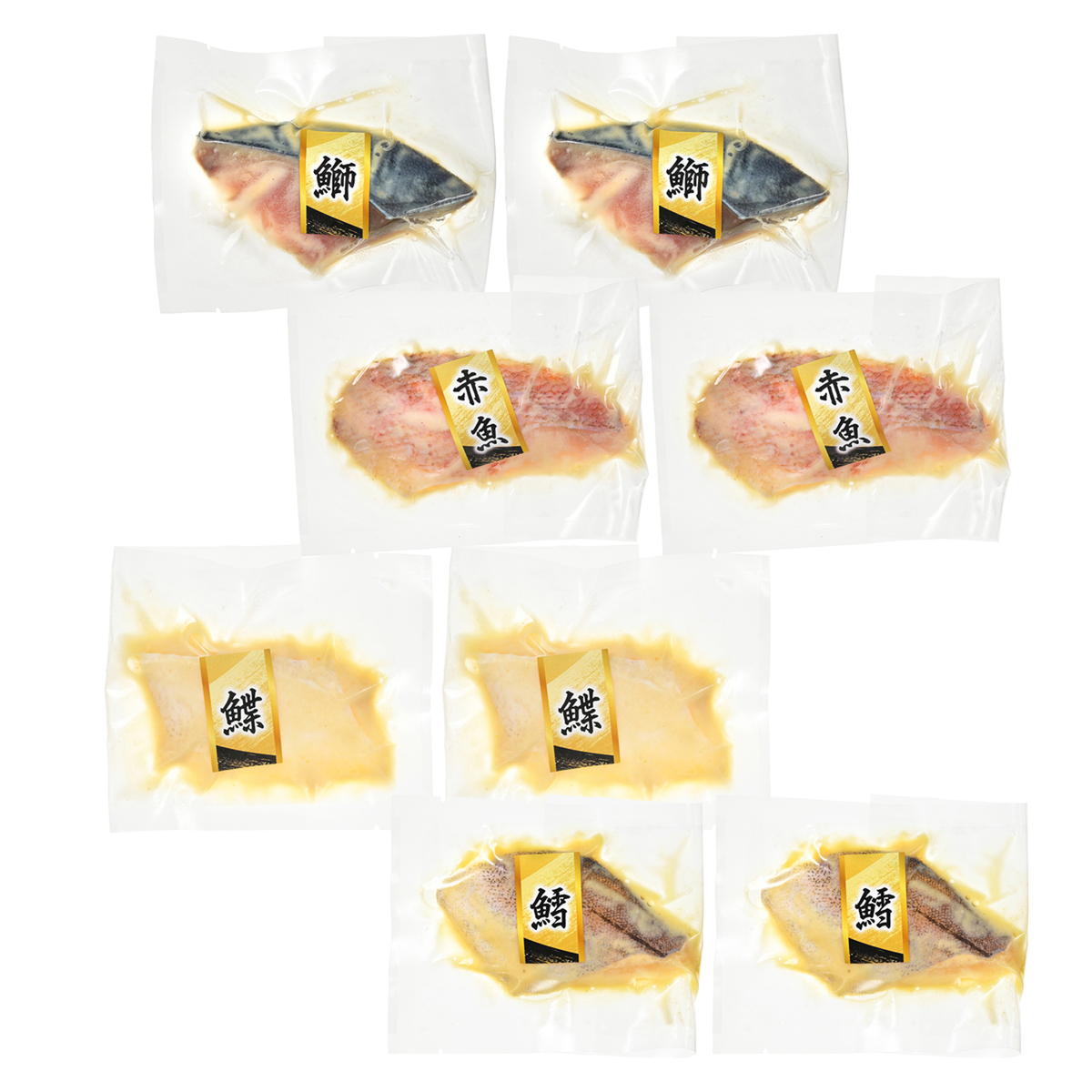 [アレルギー物質特定原材料8品目] なし [セット内容] ・赤魚西京漬け60g×2 ・鰤西京漬け60g×2 ・油ガレイ西京漬け60g×2 ・助宗ダラ西京漬け60g×2 [賞味期限] 出荷時点で賞味期限まで120日以上ある商品をお届けします [保存方法] 開封前:要冷凍(ー18℃以下)で保存してください 開封後:開封後は直ぐにお召しあがりください [お召し上がり方] 加熱してお召し上がりください 1、解凍 ・解凍は氷水解凍又は冷蔵庫解凍にて行ってください ・氷水解凍はボウルに水を張り、氷を入れて水温が0℃付近に保たれた状態で袋を浸して解凍します ・ドリップが出にくく、旨味と栄養を保ちながら解凍ができる為おススメです→解凍目安:2時間程度 ・冷蔵庫解凍は袋ごとバットやトレーに置いて解凍→解凍目安:6時間程度 2、拭う ・切り身表面の漬けタレが多く残っていると焦げやすくなるので適度にペーパータオル等にて拭ってください 3、焼く (フライパン) ・魚焼き用ホイルやクッキングシートをご利用されると身がくっつかずきれいに焼き上がります ・火加減は、中火より少し弱火に合わせて約5分くらい焼いたら裏返し、更に4分〜5分程度焼いたら完成です (オーブントースター) ・網の上によくもんだアルミホイルを敷いてください。身がくっつき難くなります。そして、脂などがこぼれ落ちないように回りを少し高くしてください。皮目を上にして入れ、上下火で約8〜10分加熱してください [注意事項] ※当該商品は 小麦・大豆・さば・さけ・いかを含む商品を同一ラインで製造しています ※加熱時間は目安となります。魚の身の厚さや消費電力などにより焼き上り時間が異なる場合がありますので、焼き加減を確かめながら焼いてください ・常温での自然解凍はしないでください ・冷蔵庫での解凍は長時間かかります ・不完全な状態で調理しないでください ・電子レンジでは解凍しないでください [原料原産地] 赤魚西京漬け:赤魚(アメリカ産) 鰤西京漬け:鰤(日本産) 油ガレイ西京漬け:油ガレイ(ロシア産) 助宗ダラ西京漬け:助宗タラ(アメリカ産) [原産国] 日本 [原材料] 【赤魚西京漬け】赤魚(アメリカ産)、米、大豆、食塩、米こうじ、醸造アルコール、糖類、もち米、原料糖/酒精、ビタミンB2 【鰤西京漬け】鰤(日本産)、米、大豆、食塩、米こうじ、醸造アルコール、糖類、もち米、原料糖/酒精、ビタミンB2 【油ガレイ西京漬け】油ガレイ(ロシア産)、米、大豆、食塩、米こうじ、醸造アルコール、糖類、もち米、原料糖/酒精、ビタミンB2 【助宗タラ西京漬け】助宗タラ(アメリカ産)、米、大豆、食塩、米こうじ、醸造アルコール、糖類、もち米、原料糖/酒精、ビタミンB2