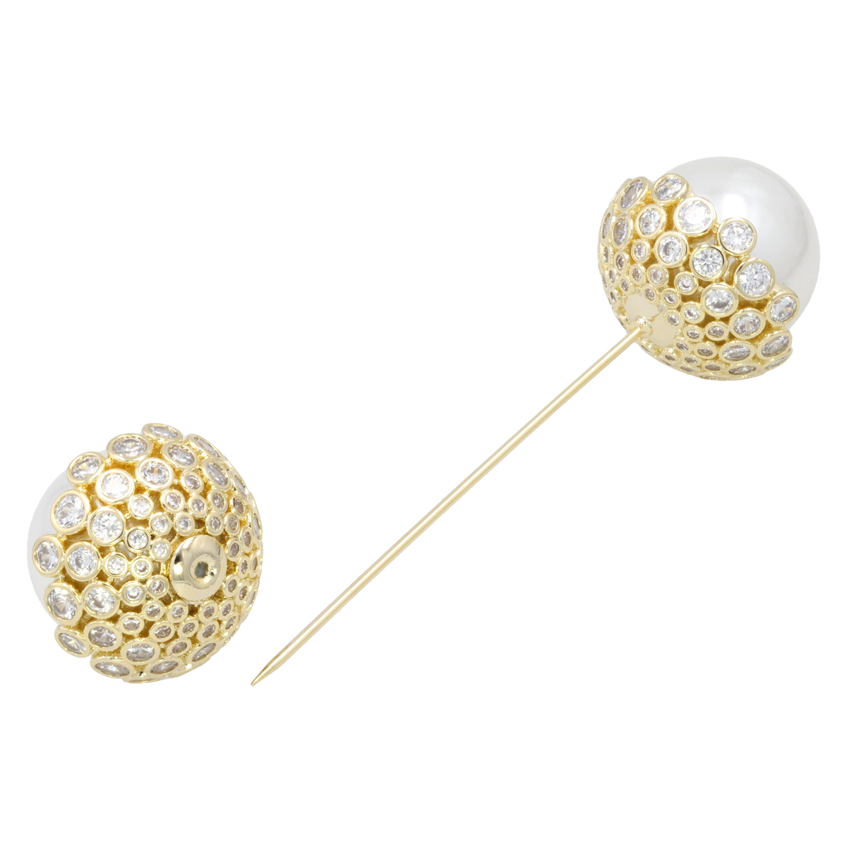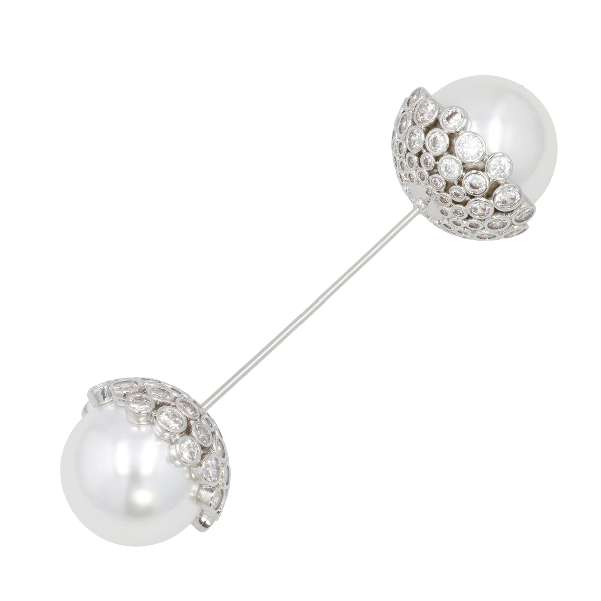 大粒のビジューパールが両端にあしらわれたスティックピンタイプのブローチ。ビジューパールの下部にはドーム型キャップを施し、小粒のキュービックジルコニアを密に敷き詰めました