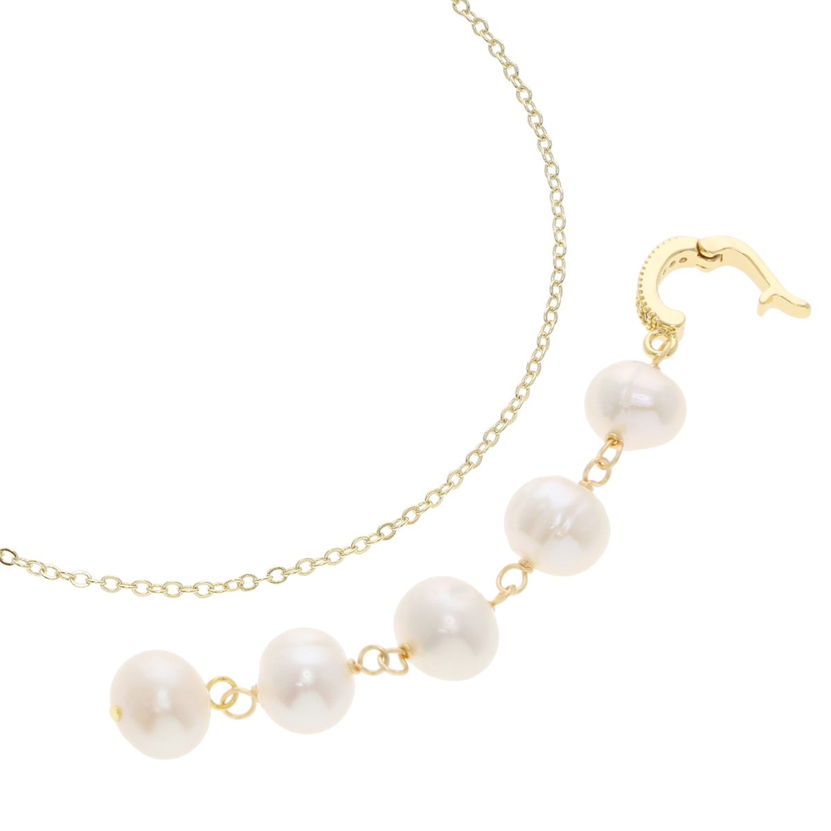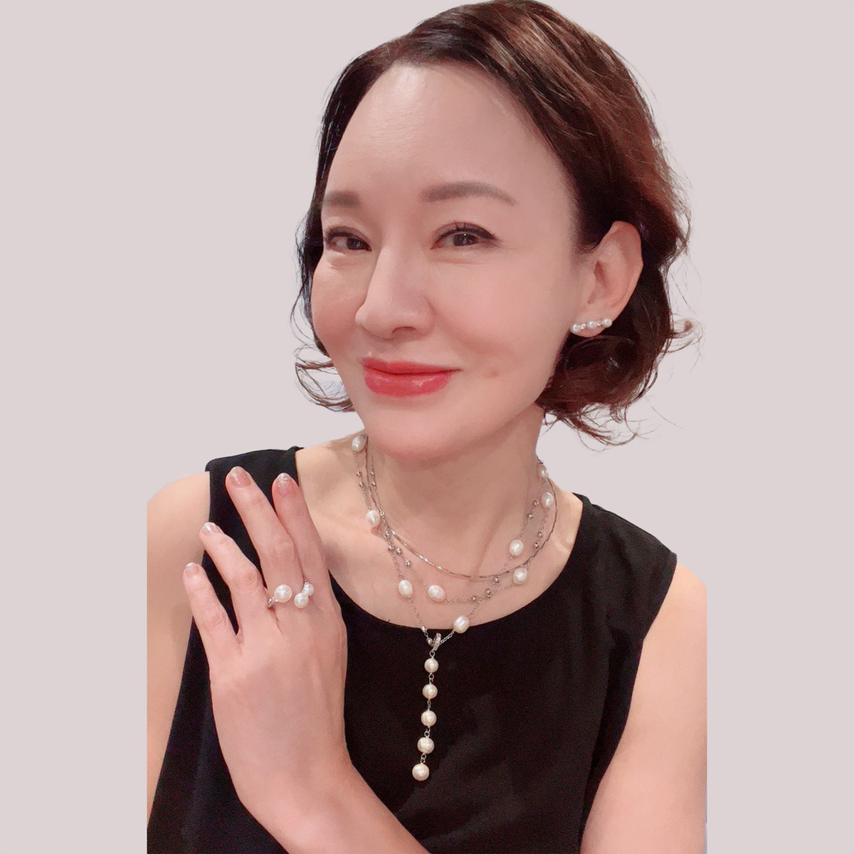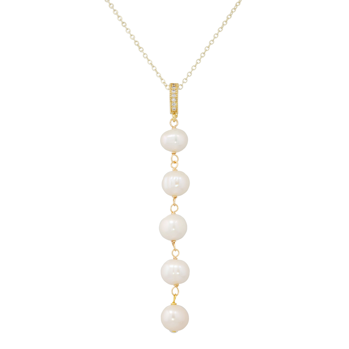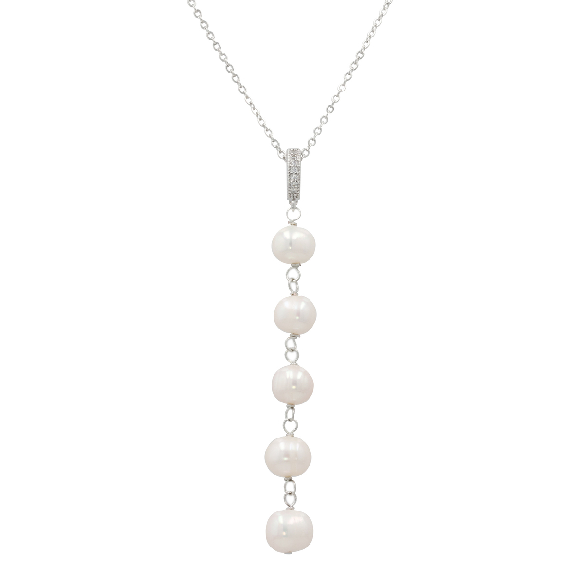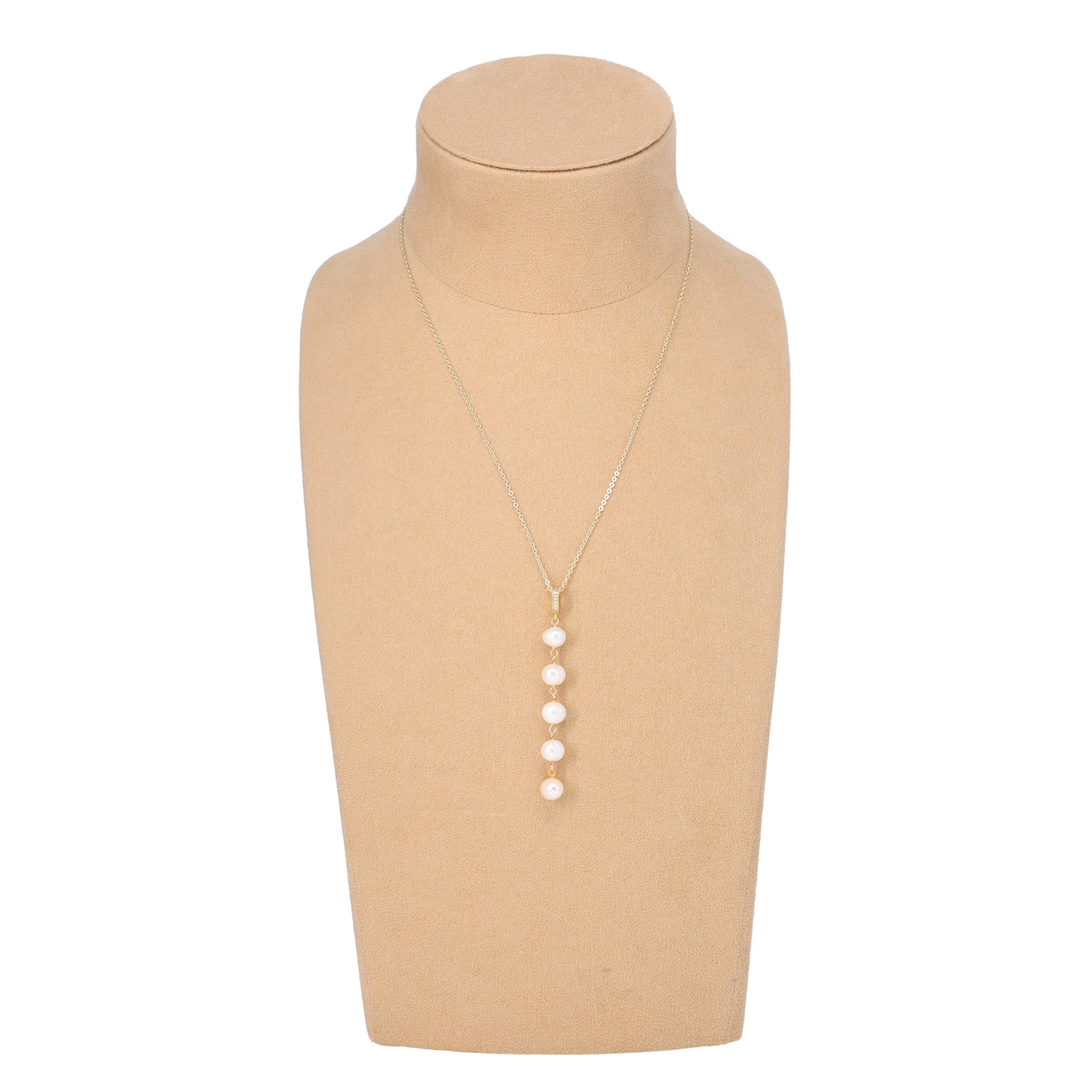 5粒の淡水パールが縦に並ぶ、ラインデザインのペンダント。トップからボトムへ向かって連なるパールが自然と視線を集め、首元に優雅な縦のラインを演出します