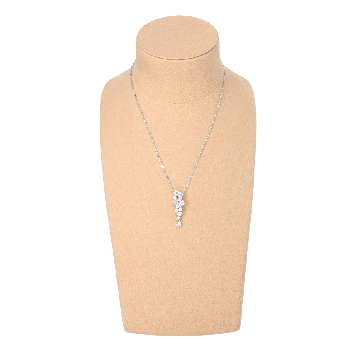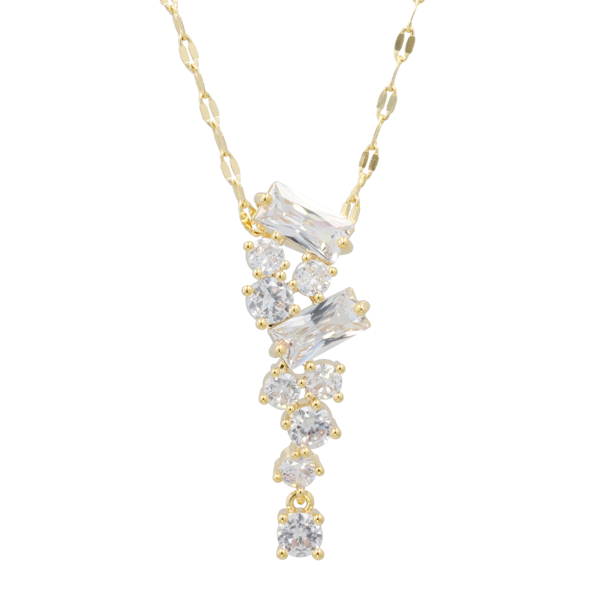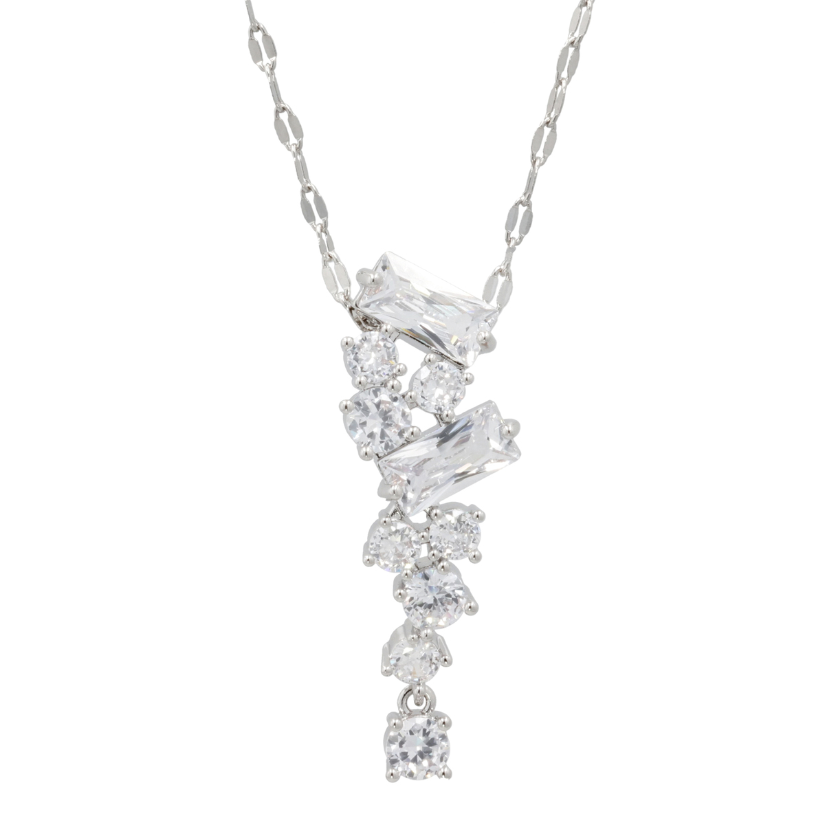 縦に連なるバゲットカットとラウンドカットのキュービックジルコニアが、繊細なペタルチェーンとともに首元を美しく飾るペンダントです。動きに合わせてきらめき、立体感のある輝きを楽しめます