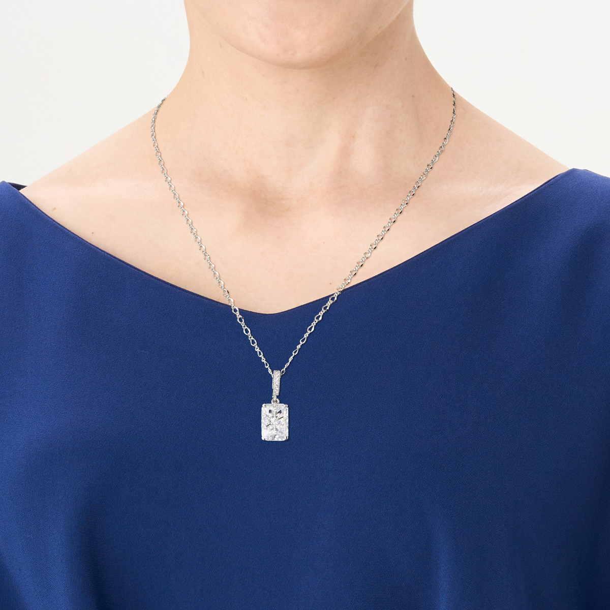 縦長の長方形フォルムに、大粒のキュービックジルコニアをセット。ファセット加工が施された石は、光を多方向に反射し、透明感と煌めきを演出します。洗練された輝きが、胸元に上品なアクセントを添えます