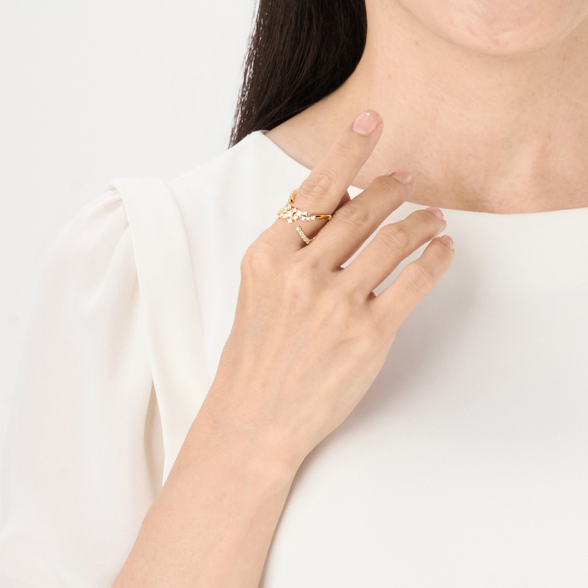合計で25石以上のキュービックジルコニアが繊細に煌めき、普段使いから華やかなシーンまで幅広く活躍。シンプルな装いに合わせるだけで、存在感のある華やぎを放ちます