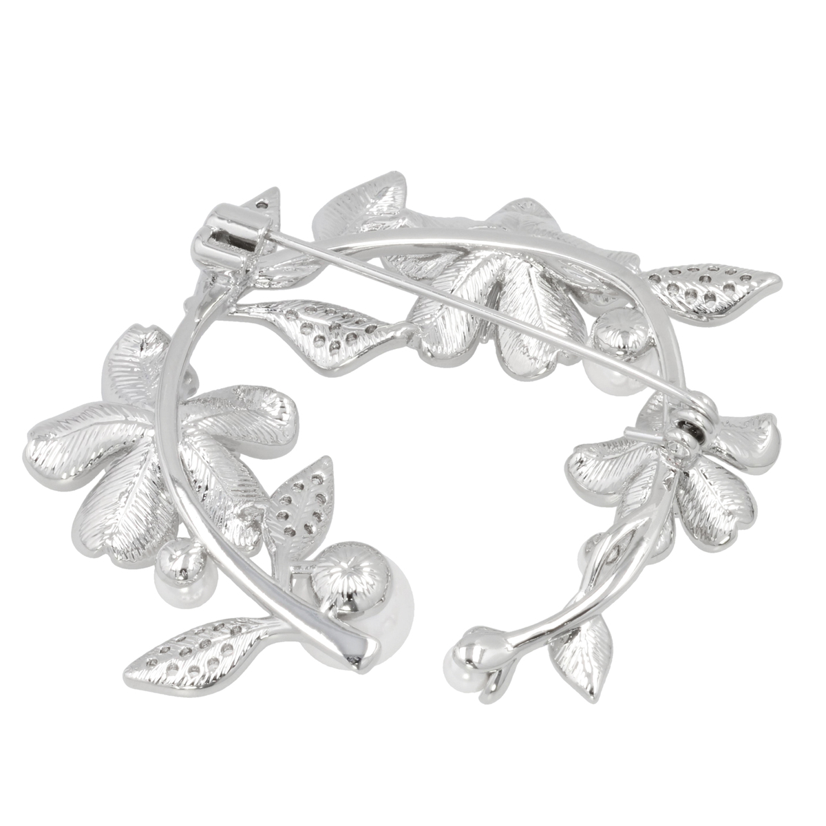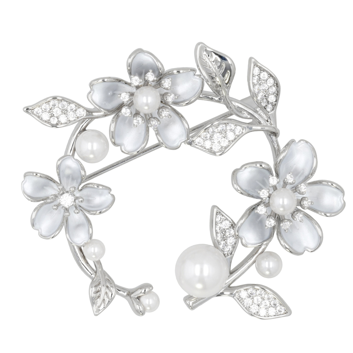 可憐な花をリース状にデザイン。繊細な美しさと上品な輝きが魅力のブローチです。3輪の花が中心に咲き、ふたつの花の中心には艶やかなパールをセッティング。クラシカルな美しさと洗練さが融合しています