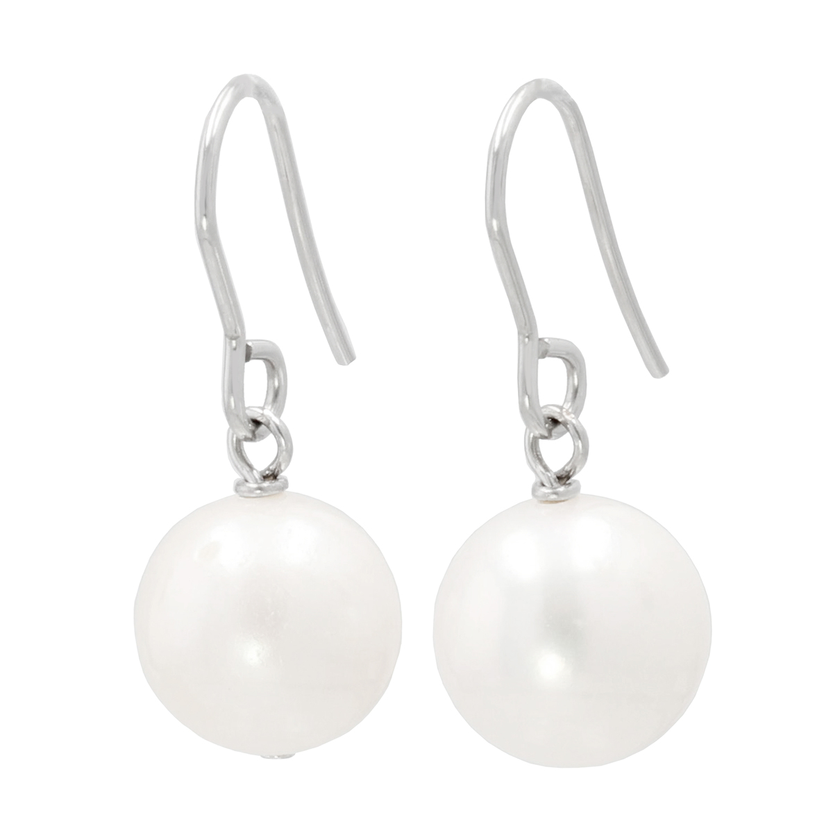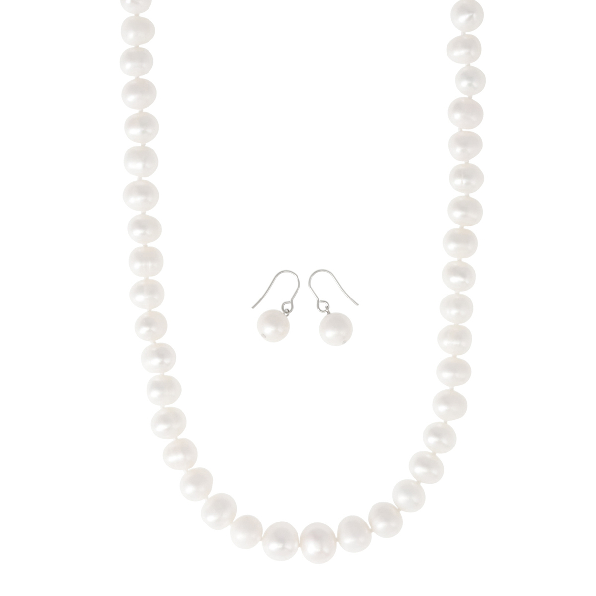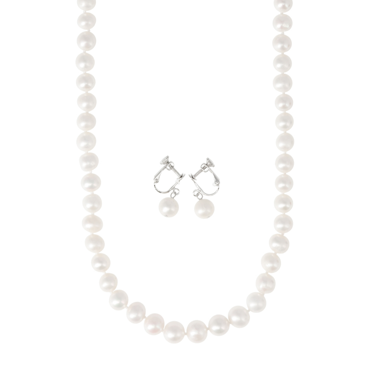 大粒の淡水パールをあしらったネックレスと、イヤリングまたはピアスの2点セット。胸元、耳元を上品に彩るシンプルなデザインです