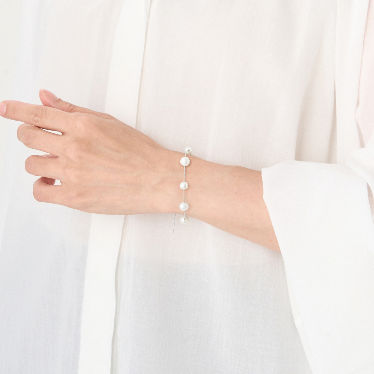 繊細な美しさと洗練されたミニマルデザインが魅力のブレスレット。7粒の淡水パールを極細ワイヤーに並べ、自然なフォルムと柔らかな光沢が手元に上品さを添えます。マグネット式クラスプで着脱も簡単。カジュアルにもフォーマルにも馴染む、タイムレスな一本です