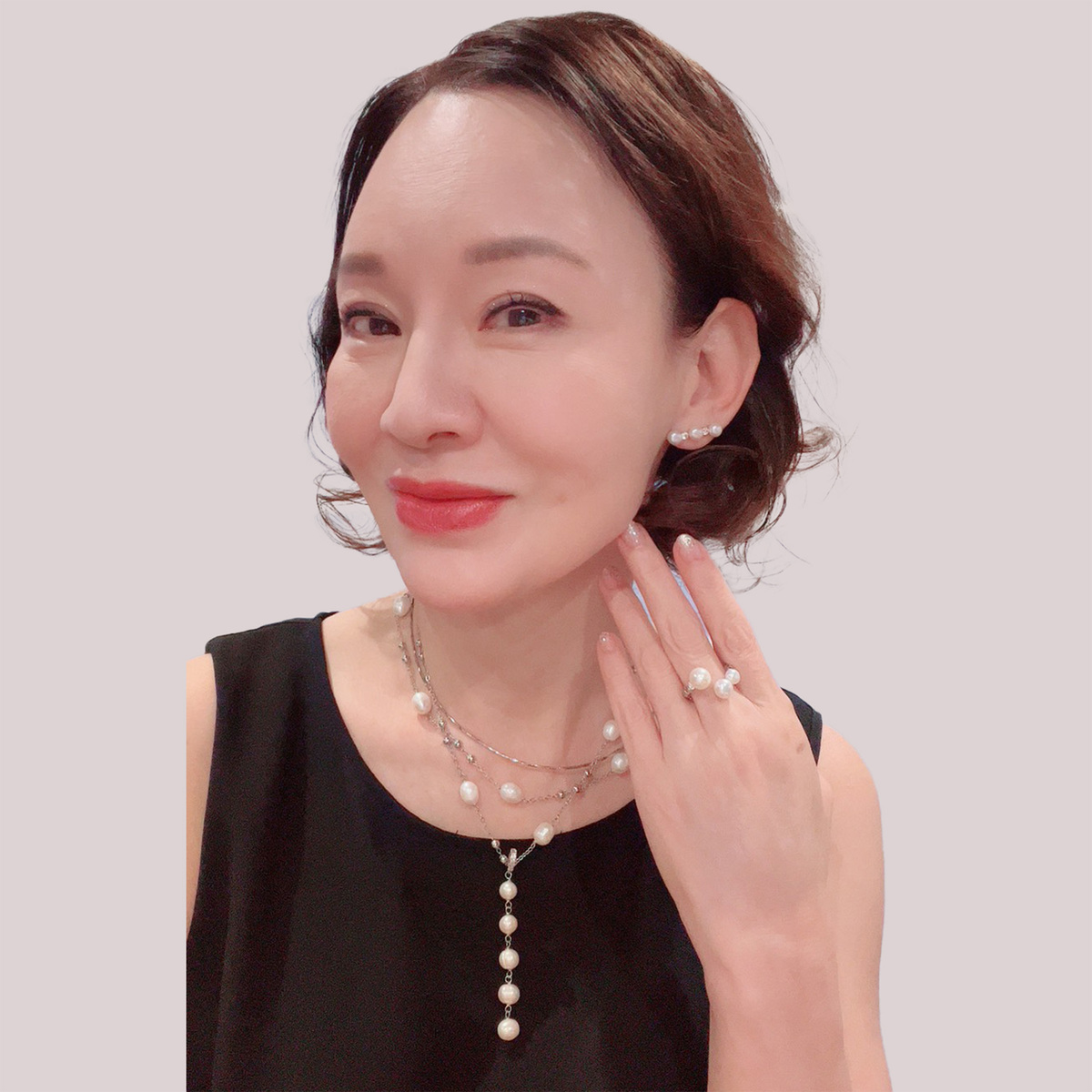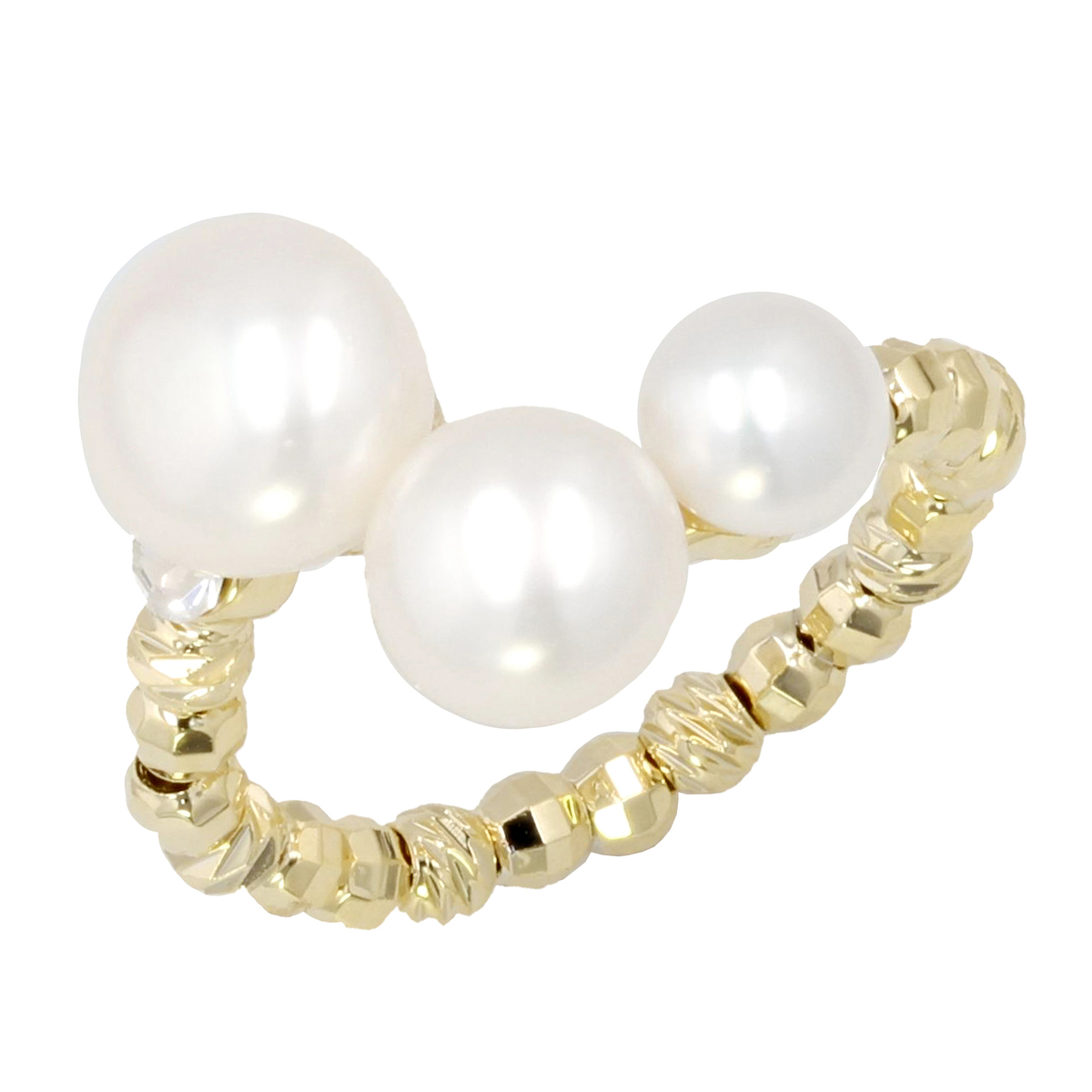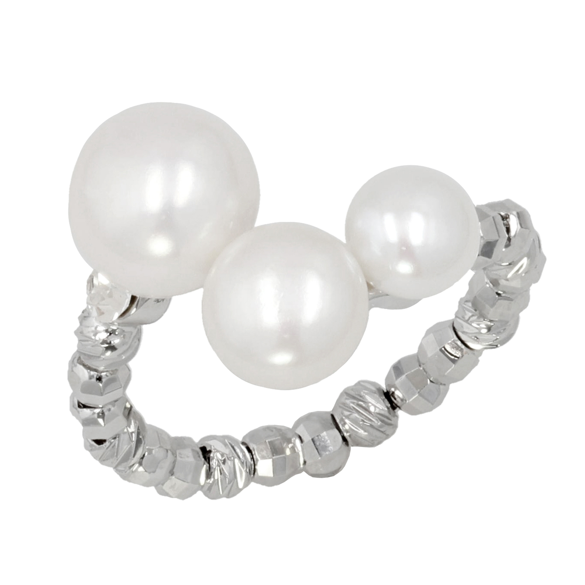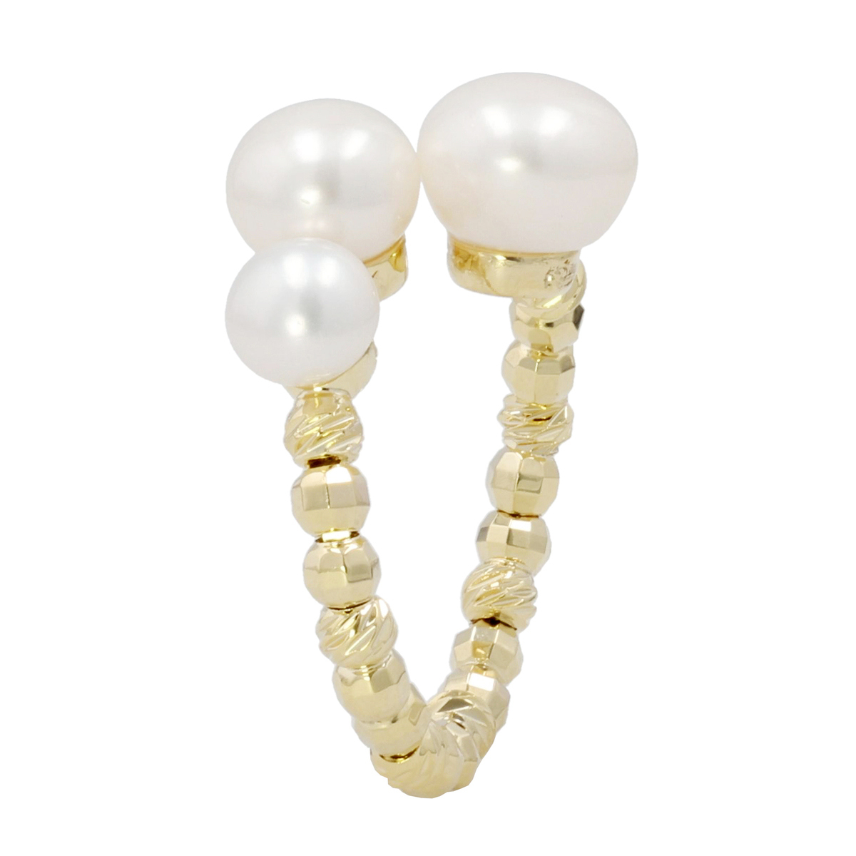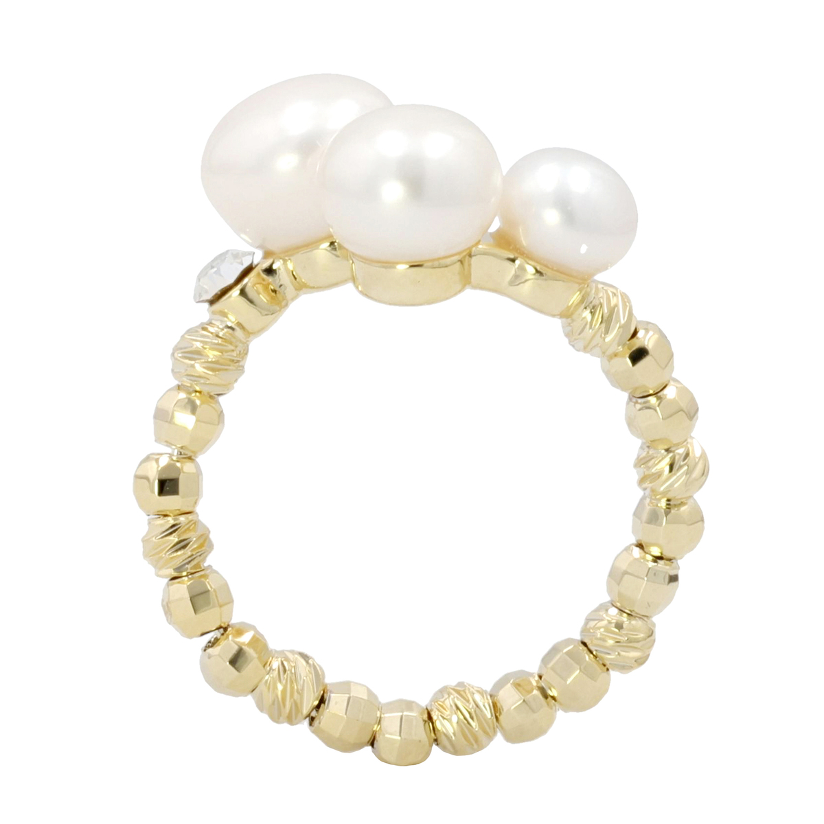 サイズの異なる3粒の淡水パールをあしらったコイルリング。片側に大粒、反対側に小粒を並べることで、バランスの取れた美しいフォルムを演出します。リング部分にはカットボールパーツを施し、光の加減でさりげなく輝き、手元に上品なアクセントを添えます
