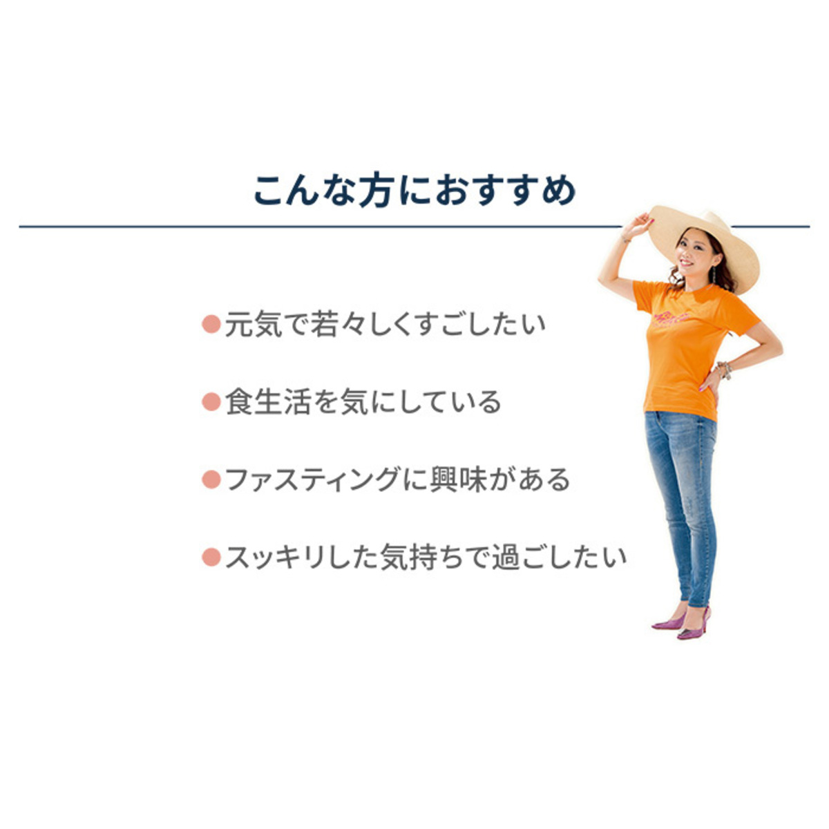 食習慣を見直すファスティングや1食置き換えにも**。1日1回30mlを目安に、そのままお召し上がりになるか、水または炭酸水など、お好みの飲料で3倍〜5倍(約90ml〜150ml)に薄めてお飲みください