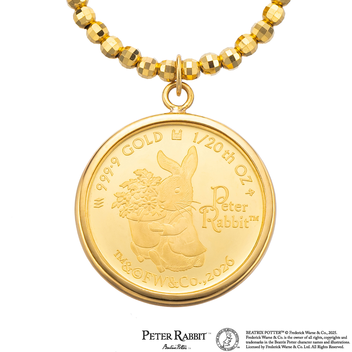 100年以上前から親しまれ、今でも世界中で愛され続けているピーターラビット。中芯に形状記憶合金を使用したリングにメダルをぶら下げました。両面に絵本から飛び出てきたようなピーターラビットが描かれています