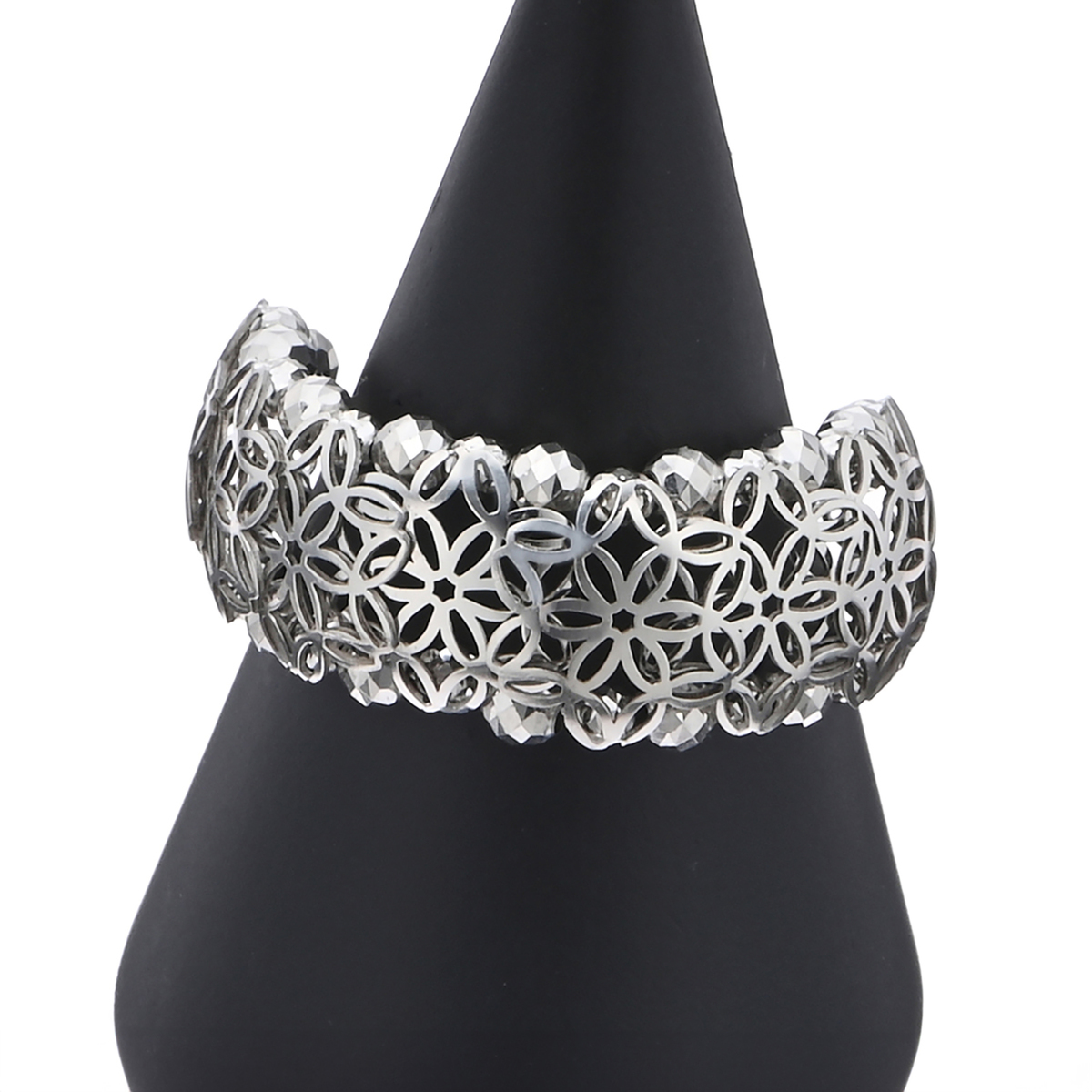 透かしのさくらモチーフを重ねるように配置した華やかなリングです。ボリューム感を持たせたフォルムがコロンと可愛らしいデザイン。淵にはダイヤモンドカットを施したカットボールをあしらい、多方面から光を受け止めて煌めくリングに仕上げました