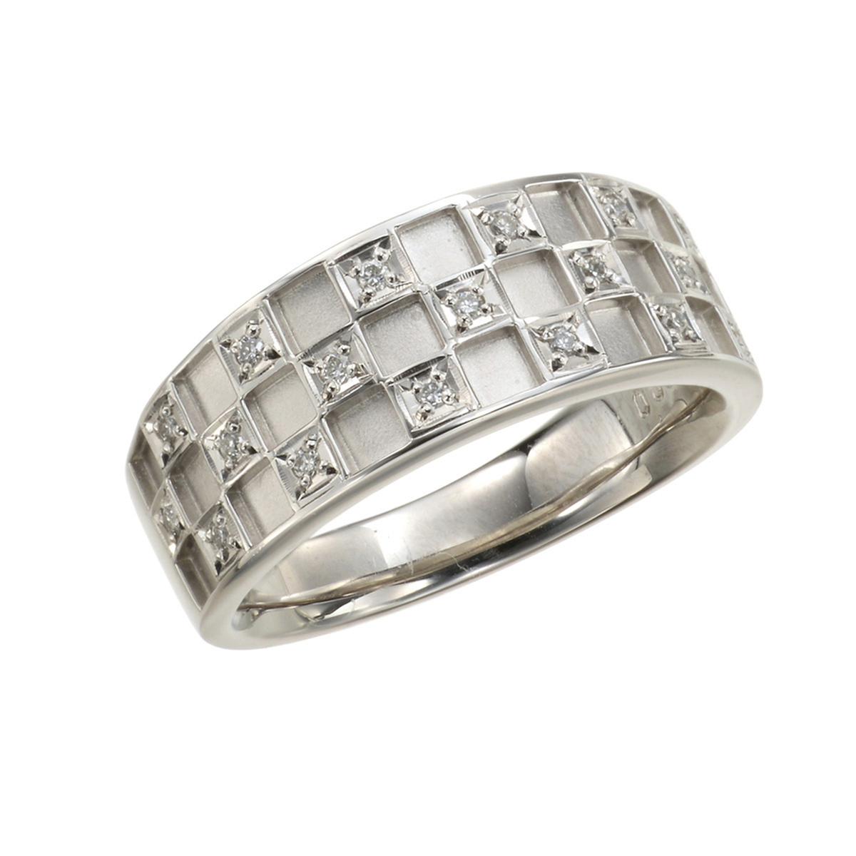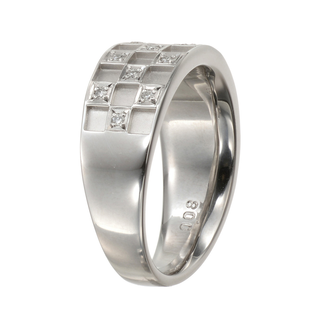 ダイヤモンドと純プラチナで市松模様を描いたリング。模様部分の地金はつや消しにして、シンプルでスタイリッシュな雰囲気に仕上げました