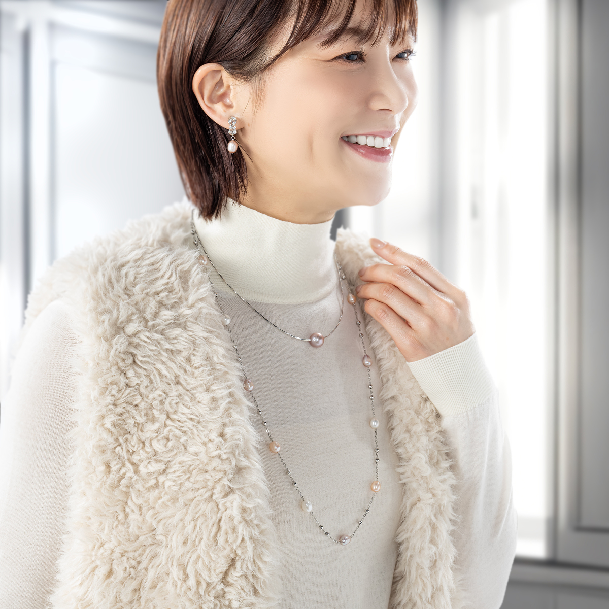 ステーションネックレスは一つ一つが微妙に異なる色合いの珠をランダムに配置。オメガネックレスはパープル系の雰囲気で仕立てました。ひと珠ごとに異なる色味が織りなす色合いは、人工では再現できない唯一無二の美しさです。一点一点異なる色味のアクセサリーとしてお楽しみください