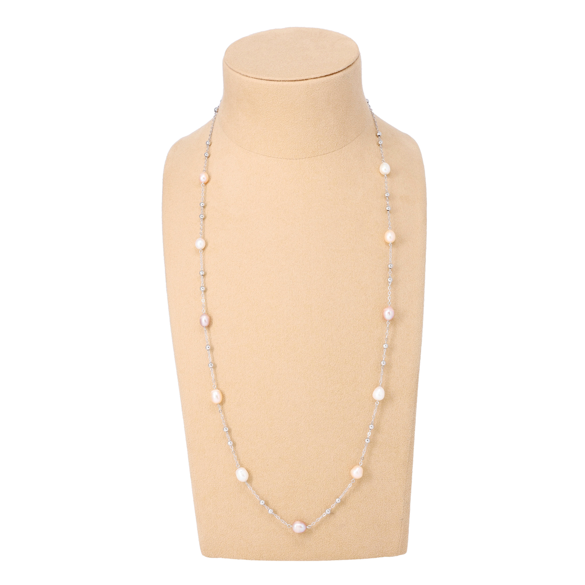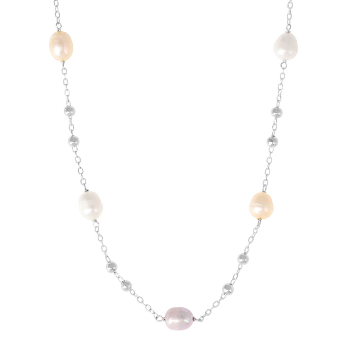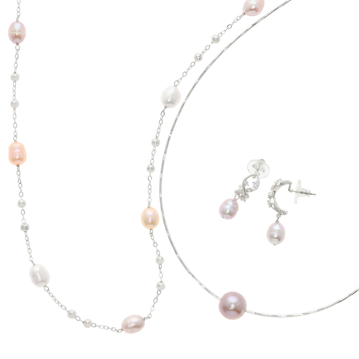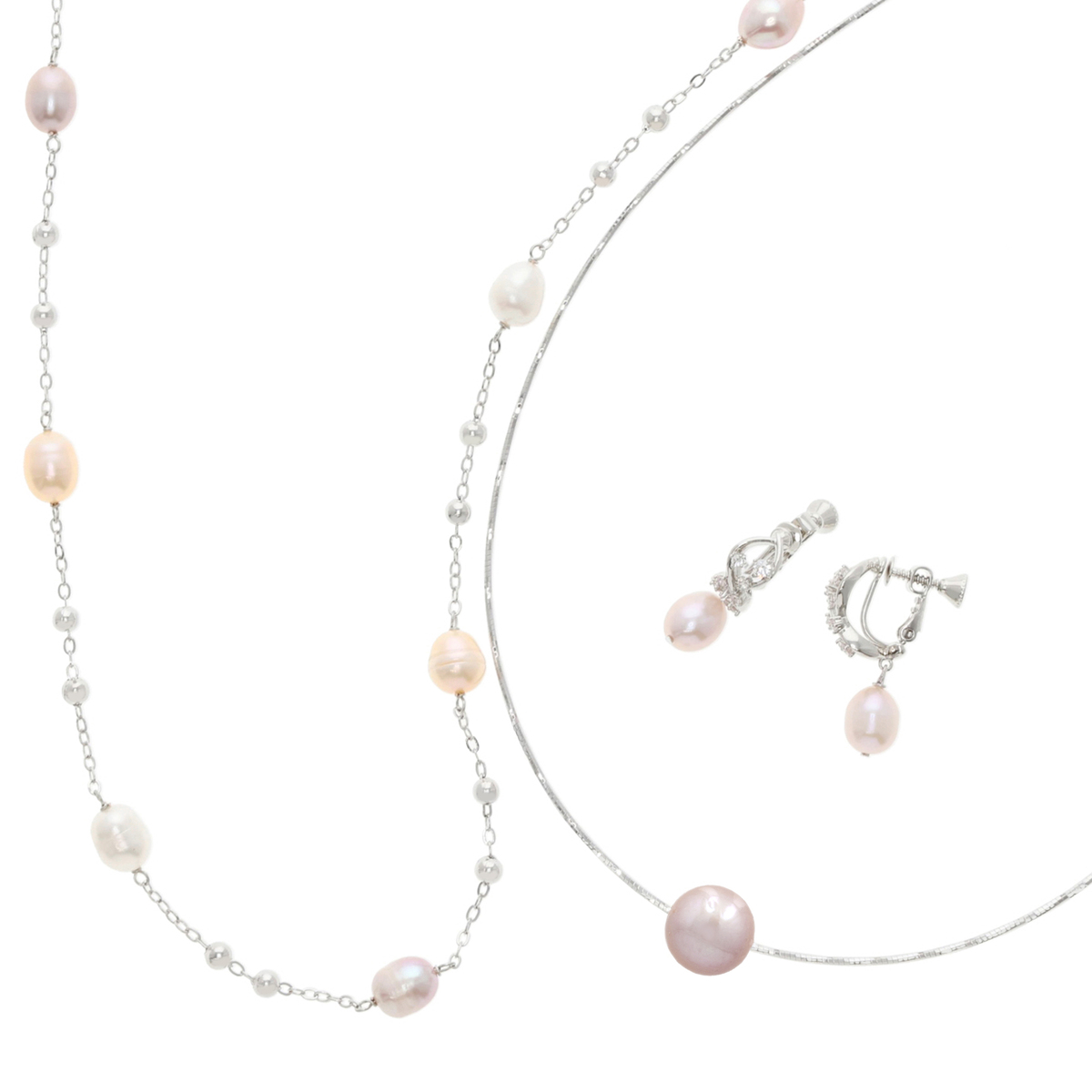 ピンクマルチカラー淡水パールのステーションネックレス、オメガネックレス、イヤリングまたはピアスの3点セット。淡水パールならではの柔らかな光沢と自然な色合いで、ピンク系やパープル系の雰囲気も持ち合わせたマルチカラーの色合いは肌なじみがよく上品な印象に。華やかさと実用性があり、ギフトにもおすすめです