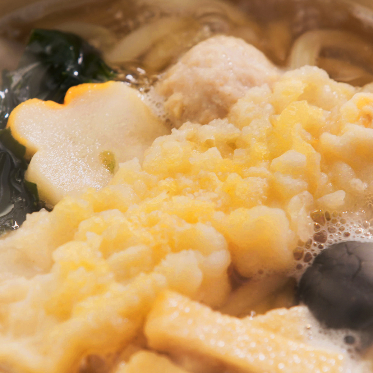 えび天、とり団子、きざみ揚げ、椎茸、わかめ、花麩の計6種類の具材が楽しめる煮込みうどん。麺に使用している小麦は香川県産さぬきの夢100%。つゆはかつおエキスと昆布エキスをきかせた、和だしの優しい香り立ちが特長です