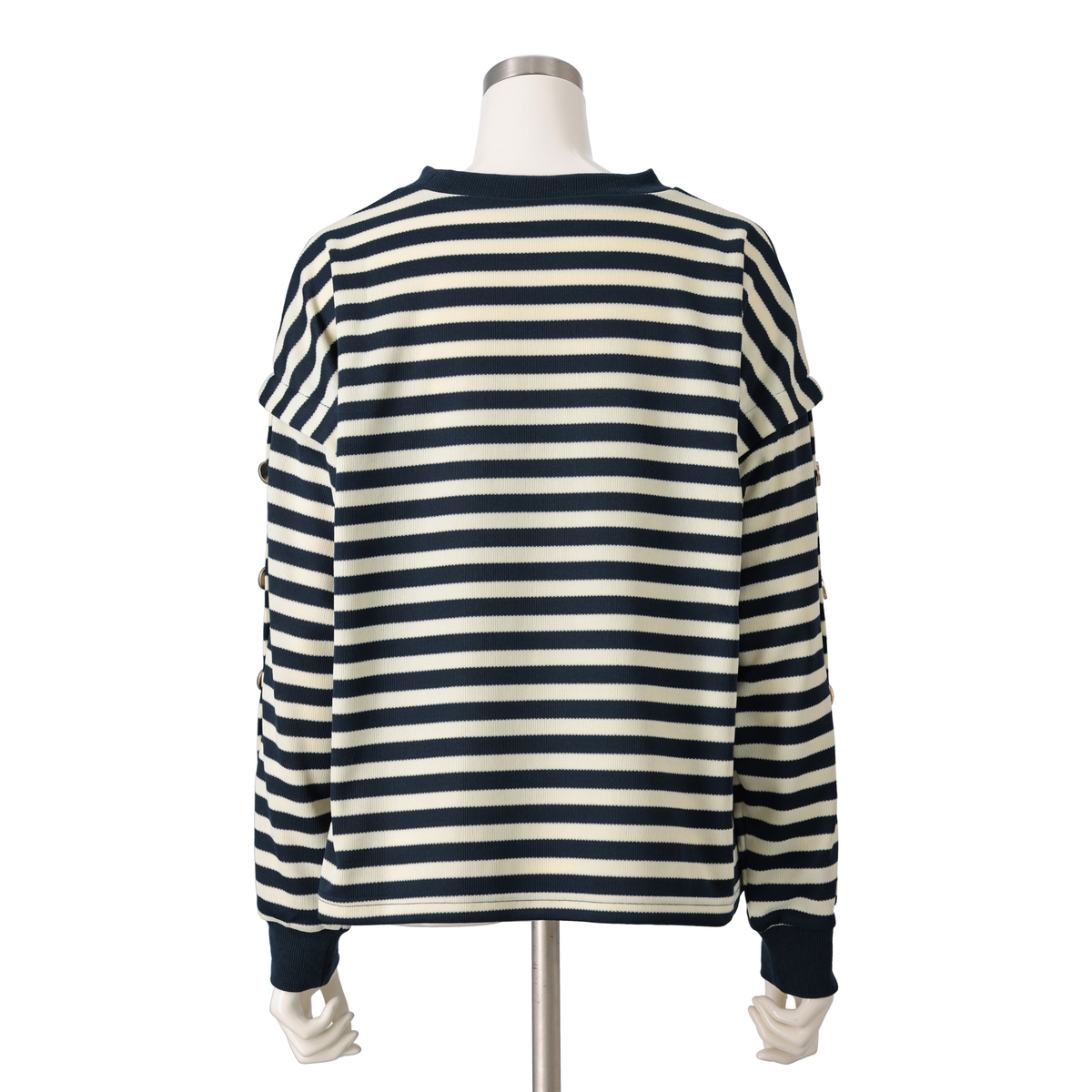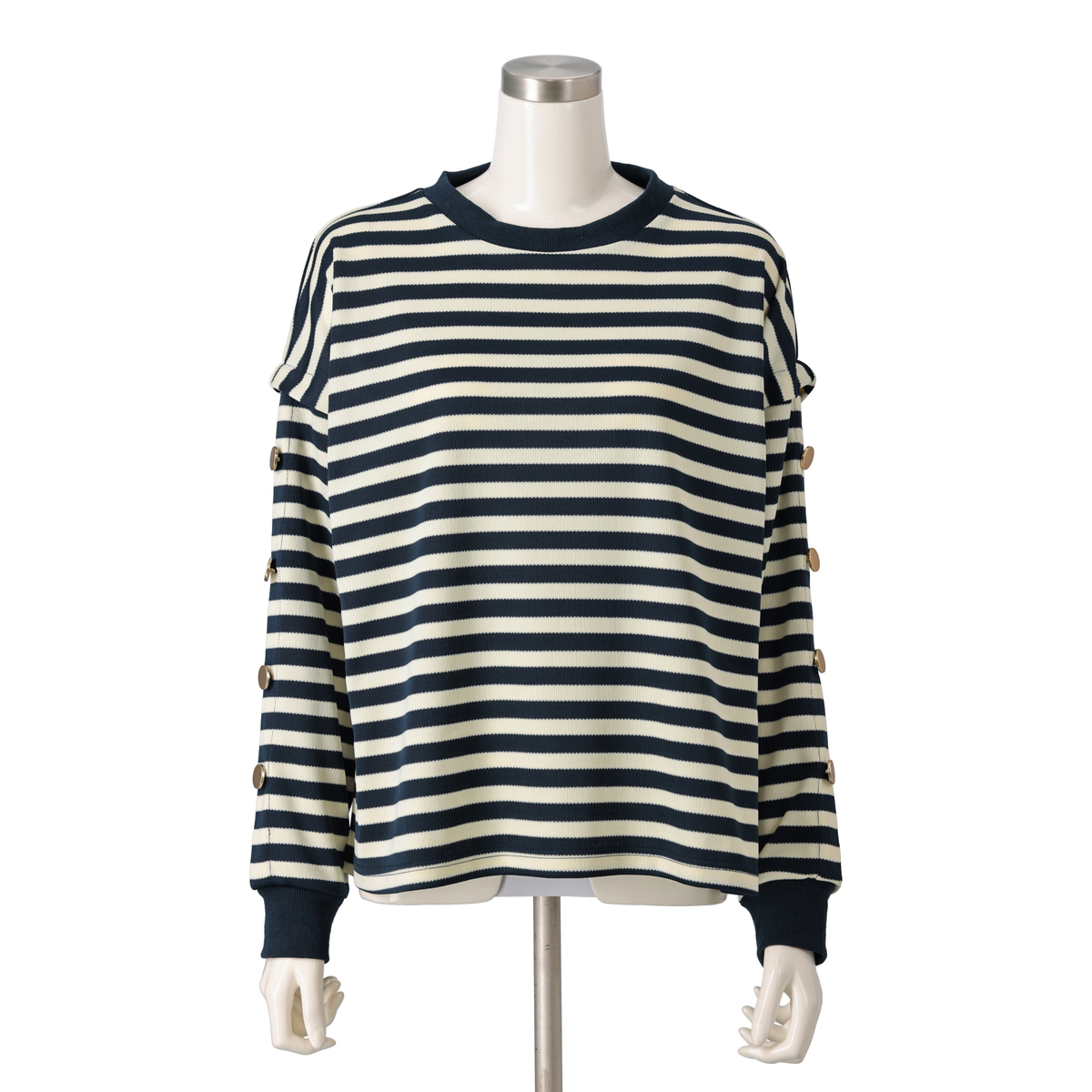 表面がなめらかできれいな目面のスムースジャージー素材で、柔らかく肌触りも良く。ストレッチ性も。袖のタック上にはゴールドカラーのボタンでポイントをつけて、マリンテイスト感を出しています