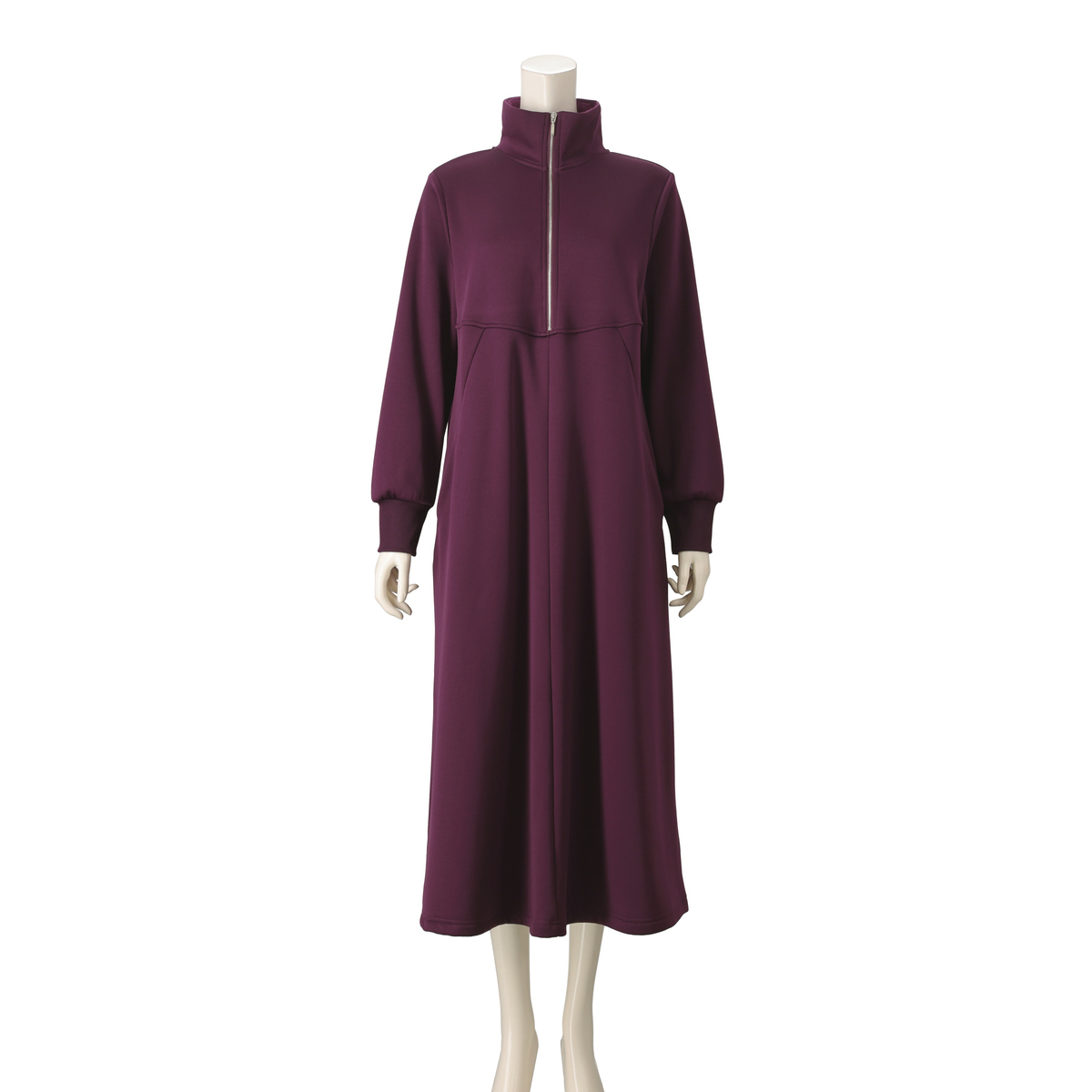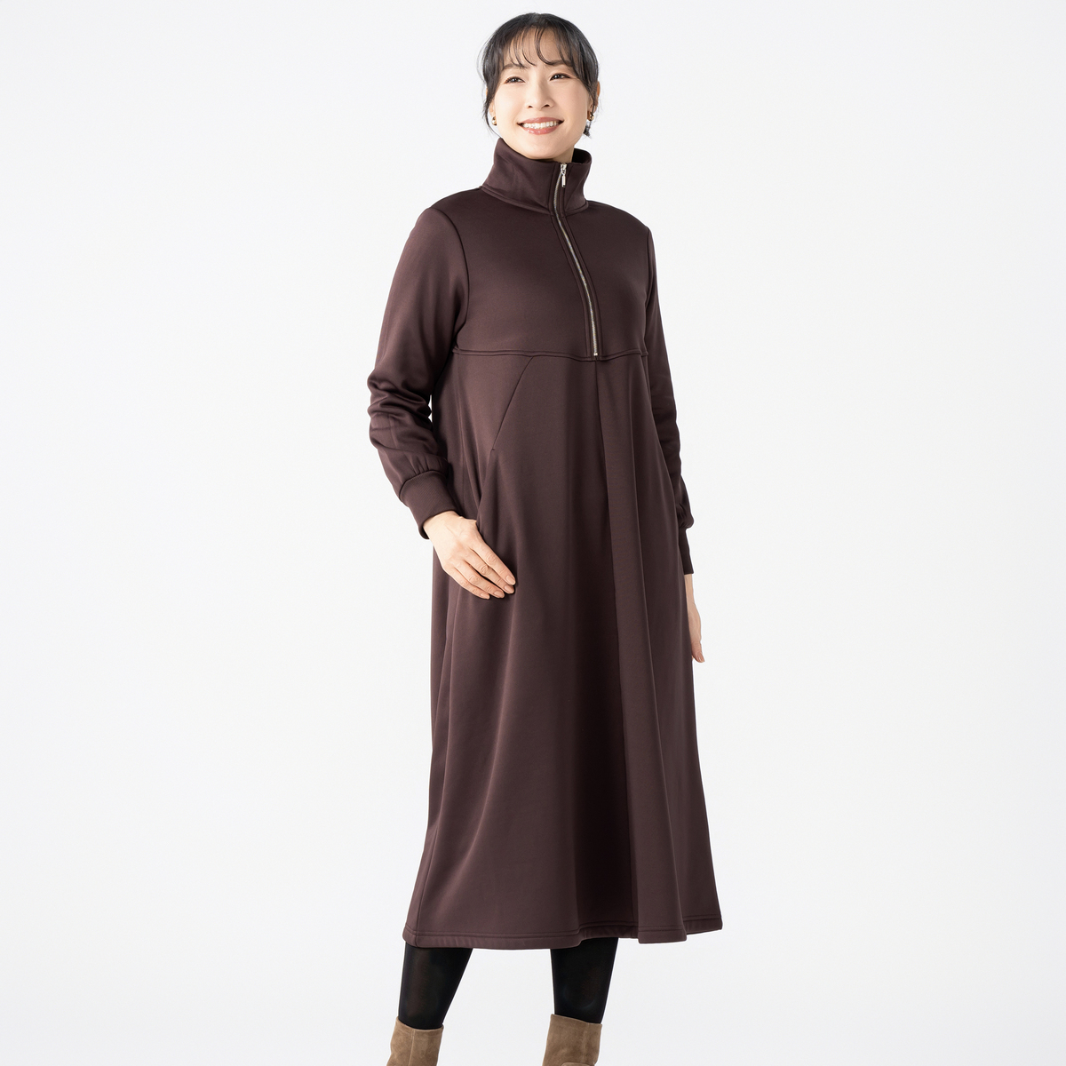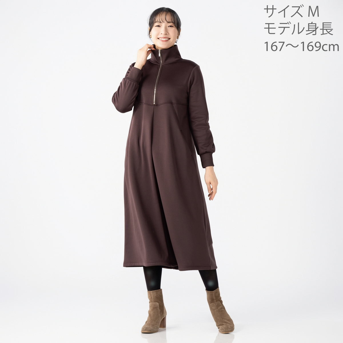 ふくらはぎまで隠れる裏シャギー起毛ワンピース。程よいゆとりのAラインと裾に広がるフレアで、体のラインを拾いにくく快適な着心地です。前中心はスタンド衿先から胸下までシルバーカラーのメタルファスナー仕様で、被りやすいデザイン。衿は起毛面を内側にして、肌触りが柔らかく暖かです