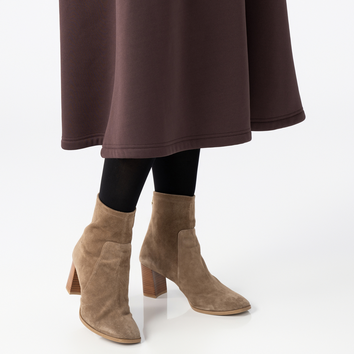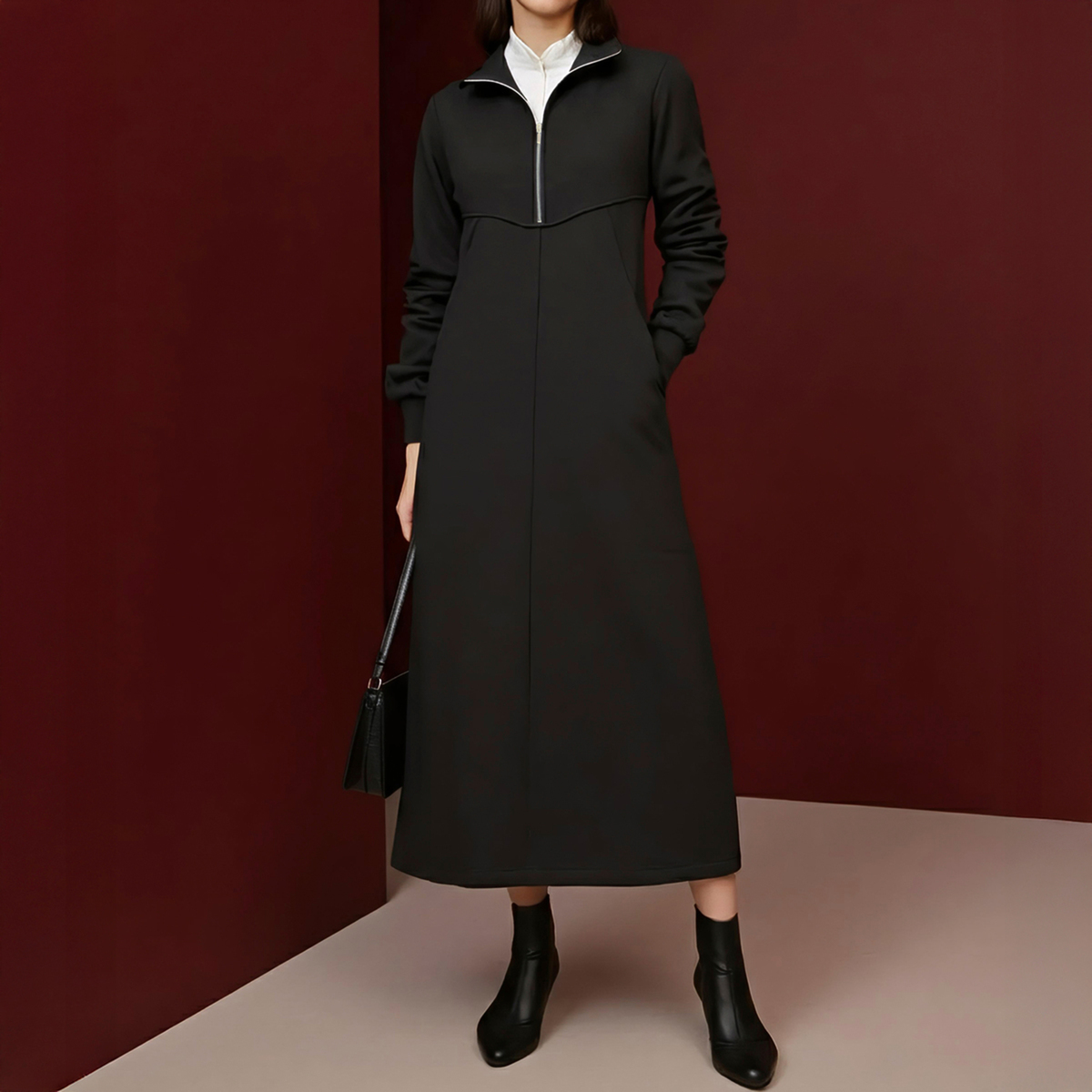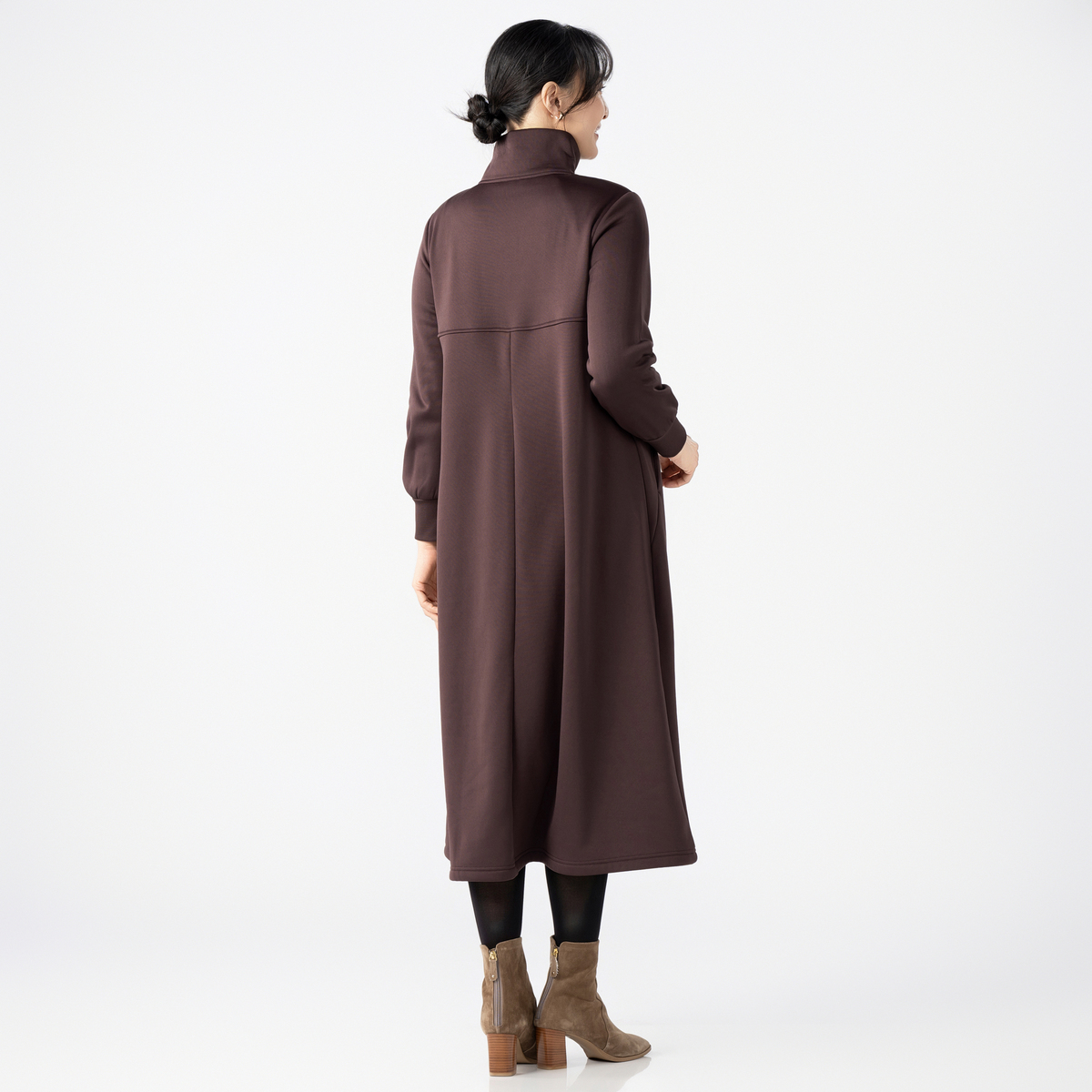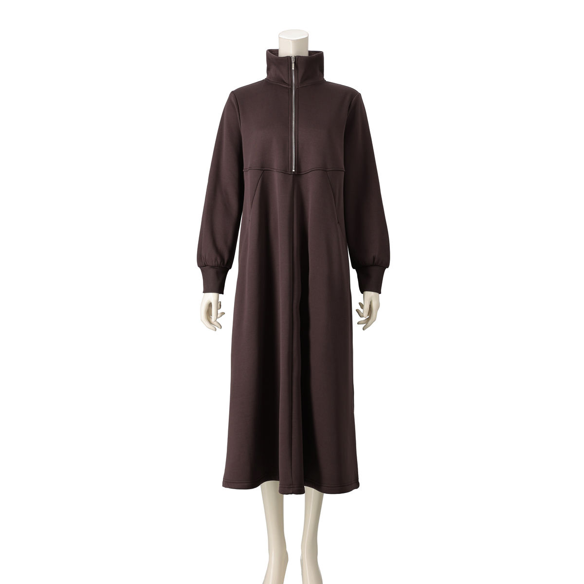 ふくらはぎまで隠れる裏シャギー起毛ワンピース。程よいゆとりのAラインと裾に広がるフレアで、体のラインを拾いにくく快適な着心地です。前中心はスタンド衿先から胸下までシルバーカラーのメタルファスナー仕様で、被りやすいデザイン。衿は起毛面を内側にして、肌触りが柔らかく暖かです
