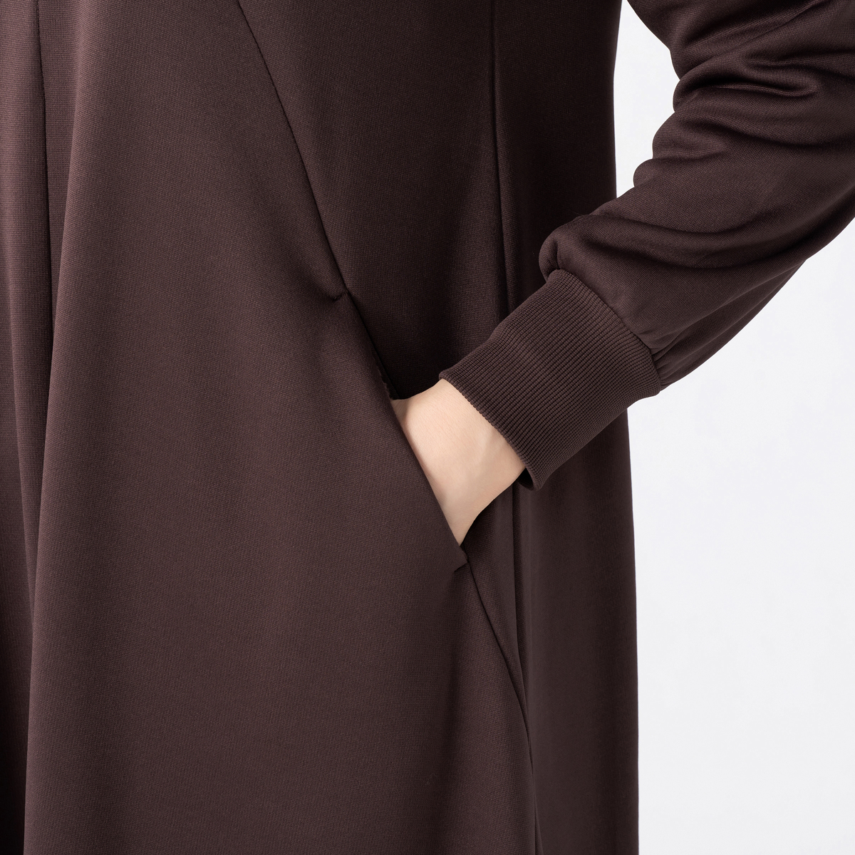 ウエスト切替えは少し高めで、前は中心下がりのゆるVラインがスタイルアップを演出。前身頃の斜め切替え線で、ゆったりサイズでもすっきり見せます。切替えを利用したスラッシュポケットは、手の甲にあたる部分を起毛面にして暖か。袖口はリブ仕様でスポーティさを添え、冷気の侵入も防ぎます
