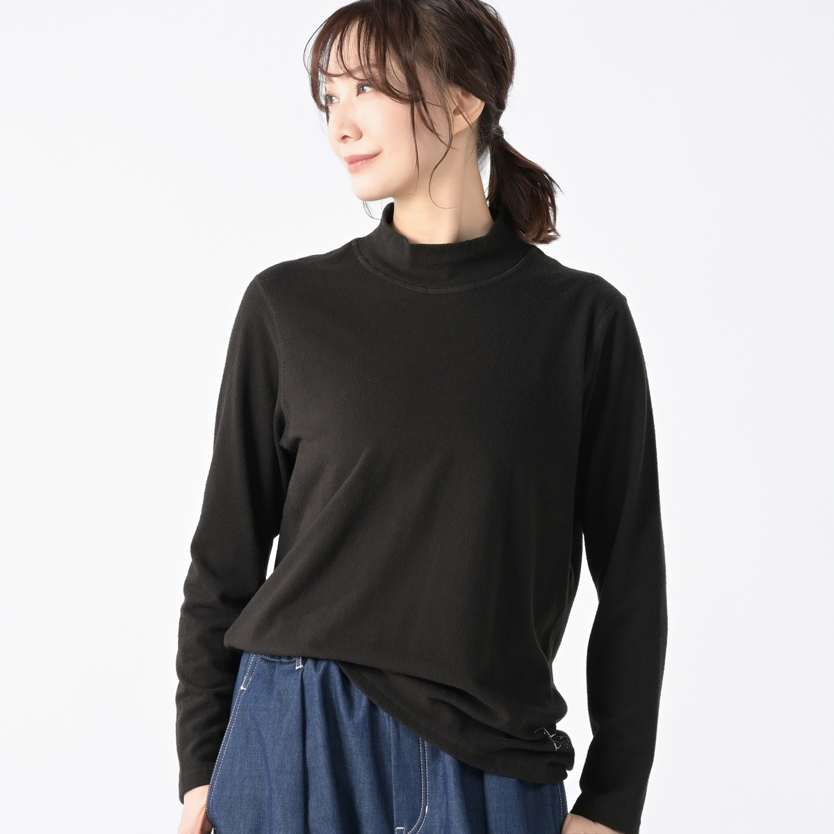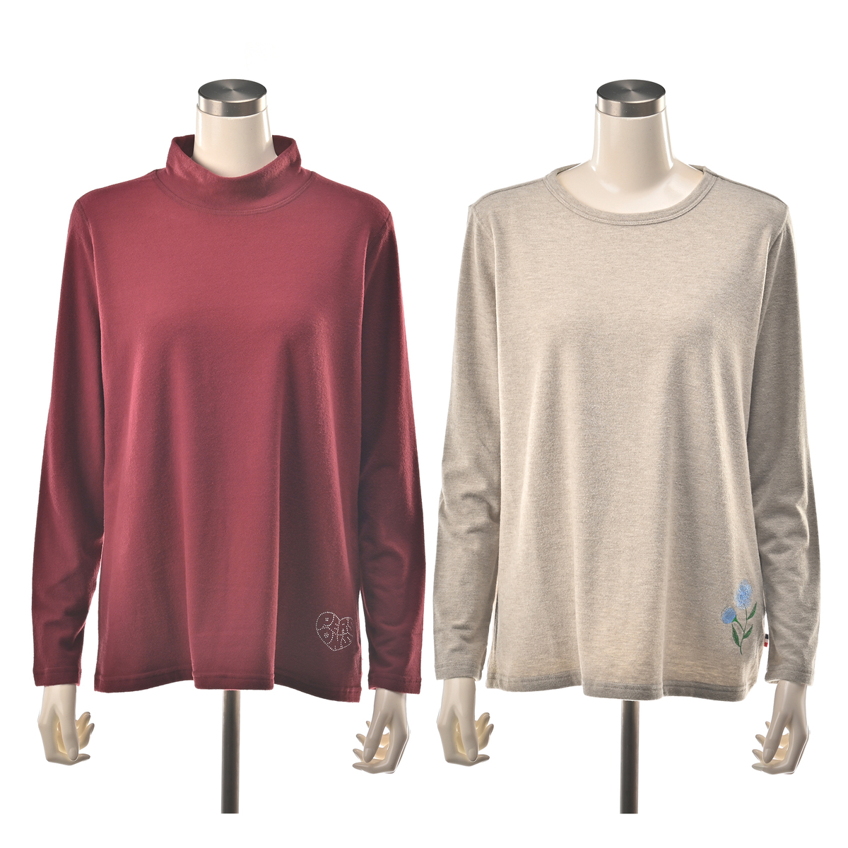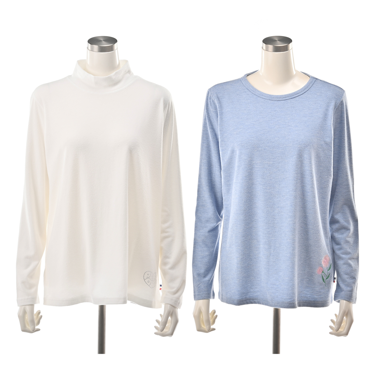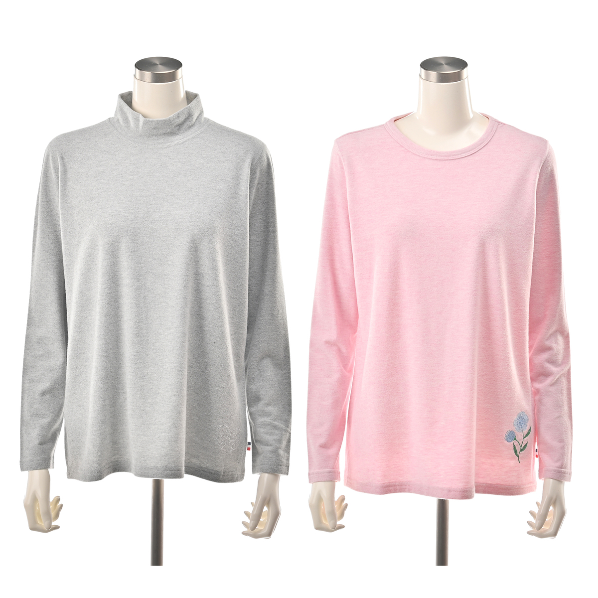 もちっとした柔らかな風合いの起毛素材のTシャツ。クルーネック長袖Tシャツとハイネック長袖Tシャツの2枚セットです。ベーシックカラーと優しい色味のニュアンスカラーの組合せで、毎日の装いに便利に着回して頂けます