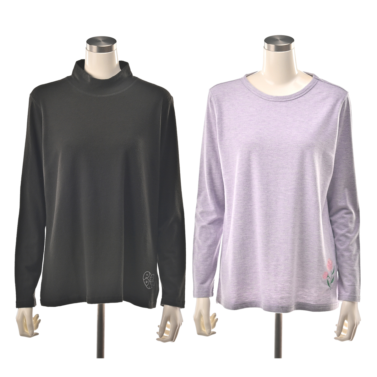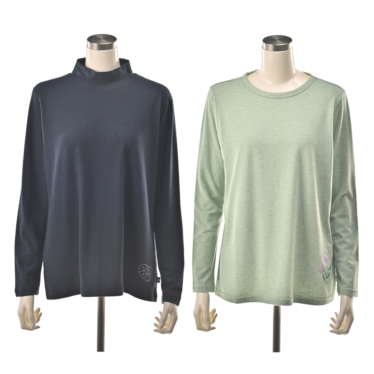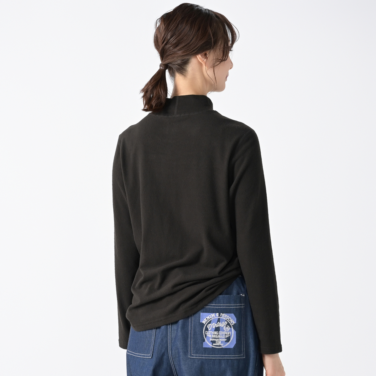 もちっとした柔らかな風合いの起毛素材のTシャツ。クルーネック長袖Tシャツとハイネック長袖Tシャツの2枚セットです。ベーシックカラーと優しい色味のニュアンスカラーの組合せで、毎日の装いに便利に着回して頂けます