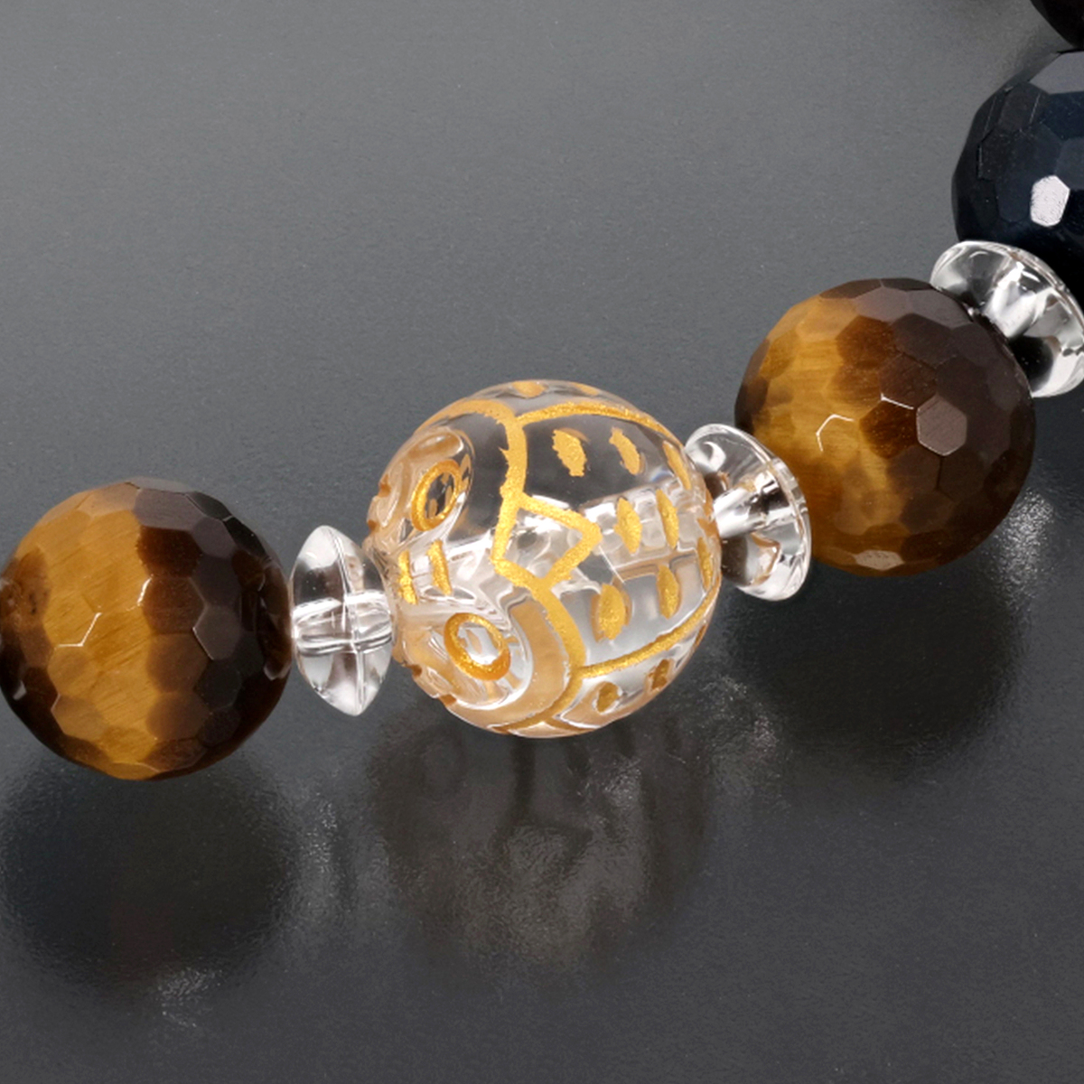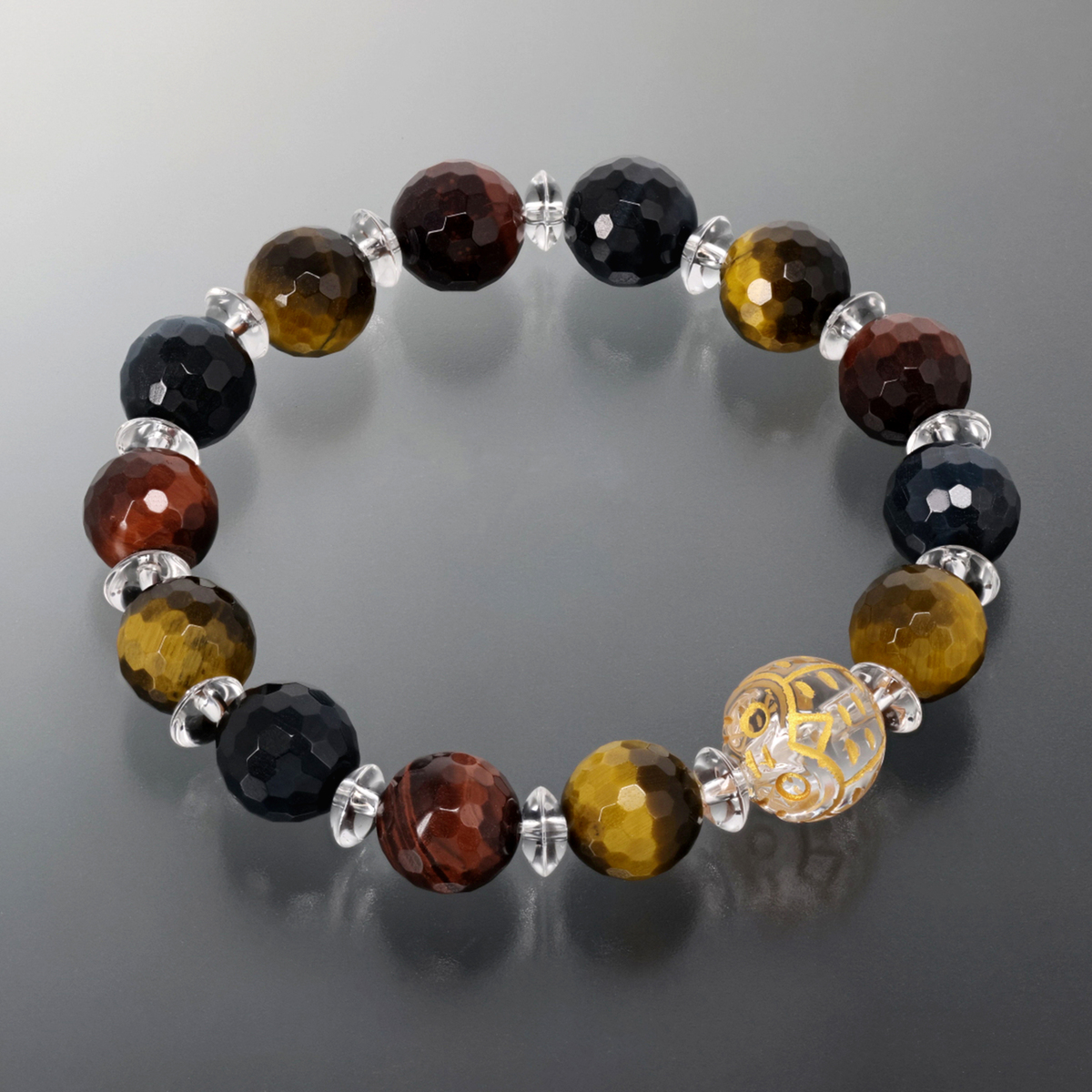 水晶にふくろうを彫刻。カッティングを施した虎目石、赤虎目石、青虎目石でマルチカラーにデザインしたサークルブレスです