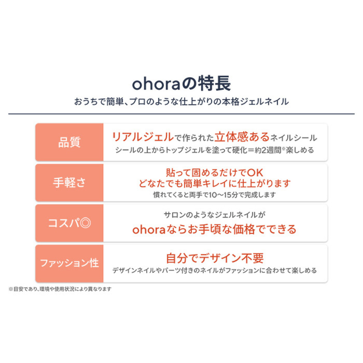 プロのような仕上がりの本格ジェルネイルをおうちで簡単に。サロンのようなジェルネイルが、「ohora」ならお手頃にご自宅でできます