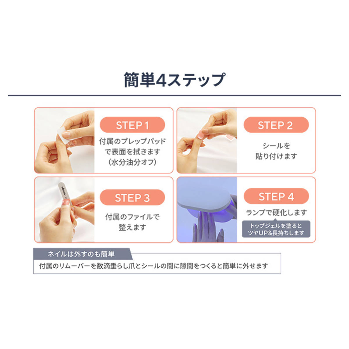 [商品内容] ・ジェルネイルシート(シート2枚(30ピース)、ネイルファイル、プレップパッド)×2 ・LEDポータブルジェルランプ(USBケーブル付属) ・トップジェル10ml ・リムーバー50ml ・ウォッシャブルネイルファイル3種セット(種類:ソフト、サイド、ネイル)(プレゼント) <LEDポータブルジェルランプ> [サイズ] 13×8×2.5cm [重量] 約46g [充電時間] 120分充電で40分使用可能 [使用方法] 1:爪表面をきれいに 事前に手を洗い、付属のプレップパッドで爪表面と手指をしっかりと拭いてください 2:シールを貼り付ける 爪のサイズに合うネイルシールを選び、キューティクルラインから少し離してはります 3:余った部分を切り取る 付属のネイルファイルで余分な部分を切り取ります。爪切りやはさみを使ってもOK 4:ランプで硬化する ジェルランプで1〜3回硬化後、ネイルファイルできれいに整えて仕上げます ネイルの外し方: 1:リムーバーを垂らす 爪のまわりにリムーバーを数滴垂らし、爪とネイルシールの隙間に浸透するまで待ちます 2:爪との間に隙間をつくる 付属のウッドスティックにリムーバーを染み込ませ、爪とシールの間にゆっくりと押し込んで隙間をつくります 3:ゆっくりと取り外す 爪とシールの隙間に追加でリムーバーを流し入れ、十分に浸してから取り外してください 【韓国製(LEDポータブルジェルランプは中国製)】 [注意事項] ※ 直射日光(紫外線)に当たると、ジェル成分が固まって使えなくなります。セミキュアジェルの保管やUVLEDジェルランプを使用する際は、セミキュアジェルが日光に直接当たらないようにご注意ください ※気温が下がるとセミキュアジェルが一時的に硬くなることがありますが、その際は温めて柔らかくしてからお使いください ※手の汗、水気、ハンドクリーム、オイルなどは接着力を低下させる主な原因になりますので、ご使用の前は石鹸などで手をきれいに洗い、油水分を完全に取り除いてください ※手足の爪やその周りの皮膚に異常を感じた場合は、直ちにご使用をおやめください ※使用後の交換・返品はお受けできかねますので、予めご了承ください ※パッケージの画像は理解を助けるためのものであるため、実際の商品の色と異なる場合がございます ※付属のスティックの先端は機能上、尖っていますので危険です。取り扱いにはご注意下さい <LEDジェルランプ> ※ランプの使用前に使用説明書を熟知してください ※定められた用途以外には使用しないでください ※子供の手が届かないところに保管してください ※使用しない時はUSBケーブルを分離して保管してください ※USBケーブルを強く引っ張らないでください ※任意で製品の変更や改造及び分解しないでください ※湿気、ほこり、火気や水気のある場所では使用しないでください ※落下及び本体に衝撃が加わる場合、故障の原因となります ※製品をアセトン、アルコール、ベンゼンなどの化学薬品で拭くと、製品に損傷の恐れがあります ※使用中や使用後、又は充電中に本体が熱くなったり、異常を感じたときは使用を中止してください ※肌が赤く腫れ上がったり、火傷などの異常を感じた場合は、すぐに使用を中止してください ※健康に以上がある方、肌が敏感な方、妊娠中の方は使用前、担当医者にご相談した後、ご使用ください ※電源が故障したり、正常に作動しない場合、製品が破損された場合には使用せず、ご購入先へお問い合わせください ※点灯中にUV LEDランプを直接見ないでください ※製品仕様に表記されている正確な電圧を使用してください ※硬化直後はランプが熱い恐れがありますので、ランプの中にある電球に触れないでください ※長時間充電せず、放置する場合は内臓バッテリーの使用寿命が短縮されますので、未使用の時でも3ヵ月に一度はフル充電をしてください ※内臓バッテリーから漏水が発生した場合、手で直接触れず、肌に触れた場合、流水などできれいに洗い、赤み、腫れ、かゆみなどの症状や副作用がある場合、皮膚科の専門医とご相談してください [成分] トップジェル:ジカルバミン酸ジHEMAトリメチルヘキシル、メタクリル酸エステルアクリエステル、HEMA、(アクリレーツ/アクリル酸エチルヘキシル/HEMA)コポリマー、メタクリル酸ヒドロキシプロピル、ヒドロキシシクロヘキシルフェニルケトン、ポリジエチルシロキサン、ダイシロキセイン リムーバー:炭酸プロピレン、水、エタノール、香料、リナロール、リモチン、サリチル酸ベンジル、加水分解コラーゲン、パンテノール、パントテン酸Ca、ビオチン、トリペプチド-1銅