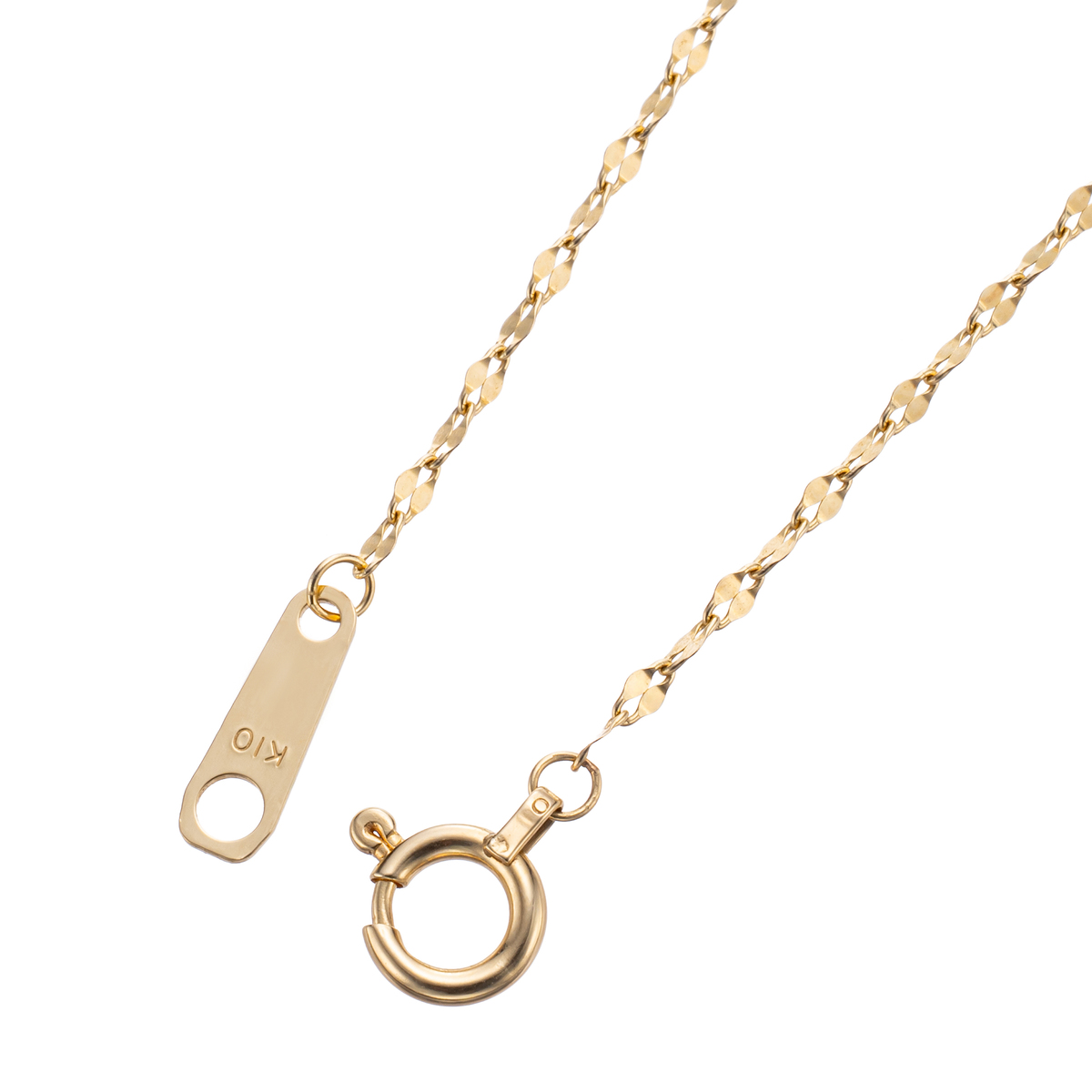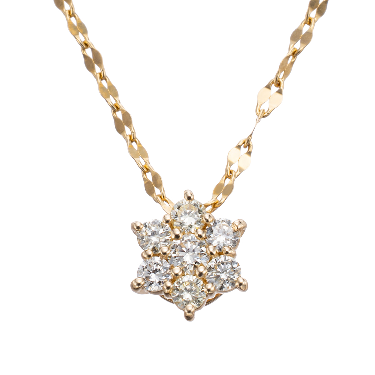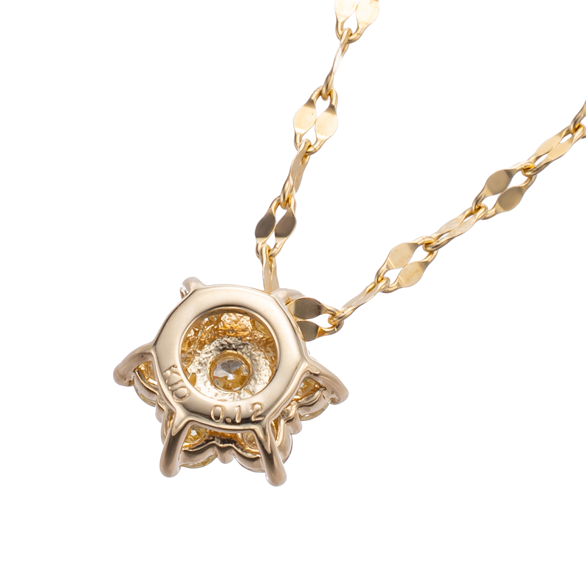 10Kイエローゴールドにダイヤモンドをあしらった、華やかで上品なペンダント。花をイメージした繊細なモチーフが、日常の装いから特別なシーンまで幅広く活躍します
