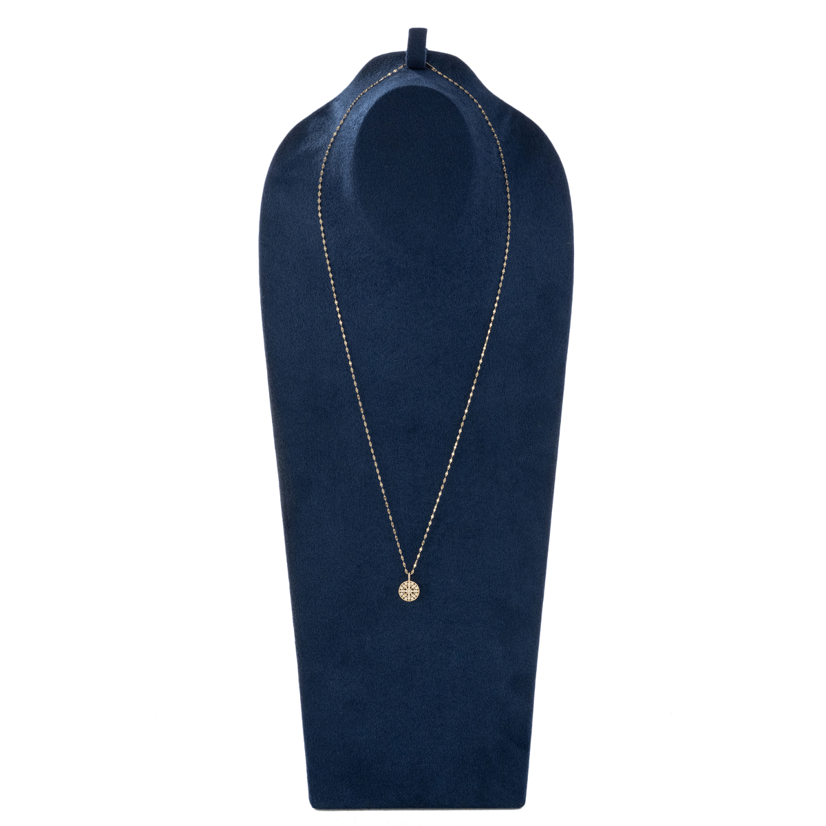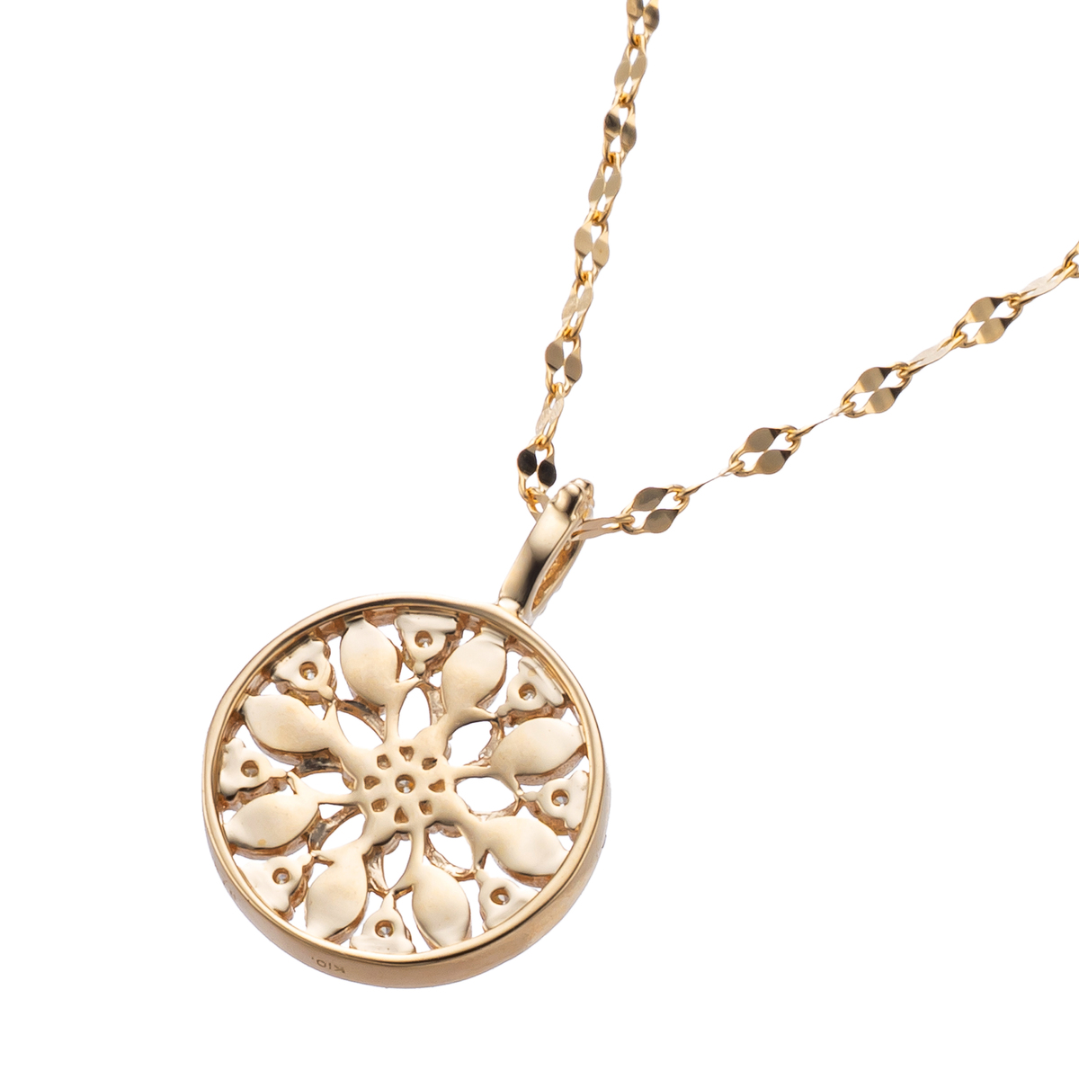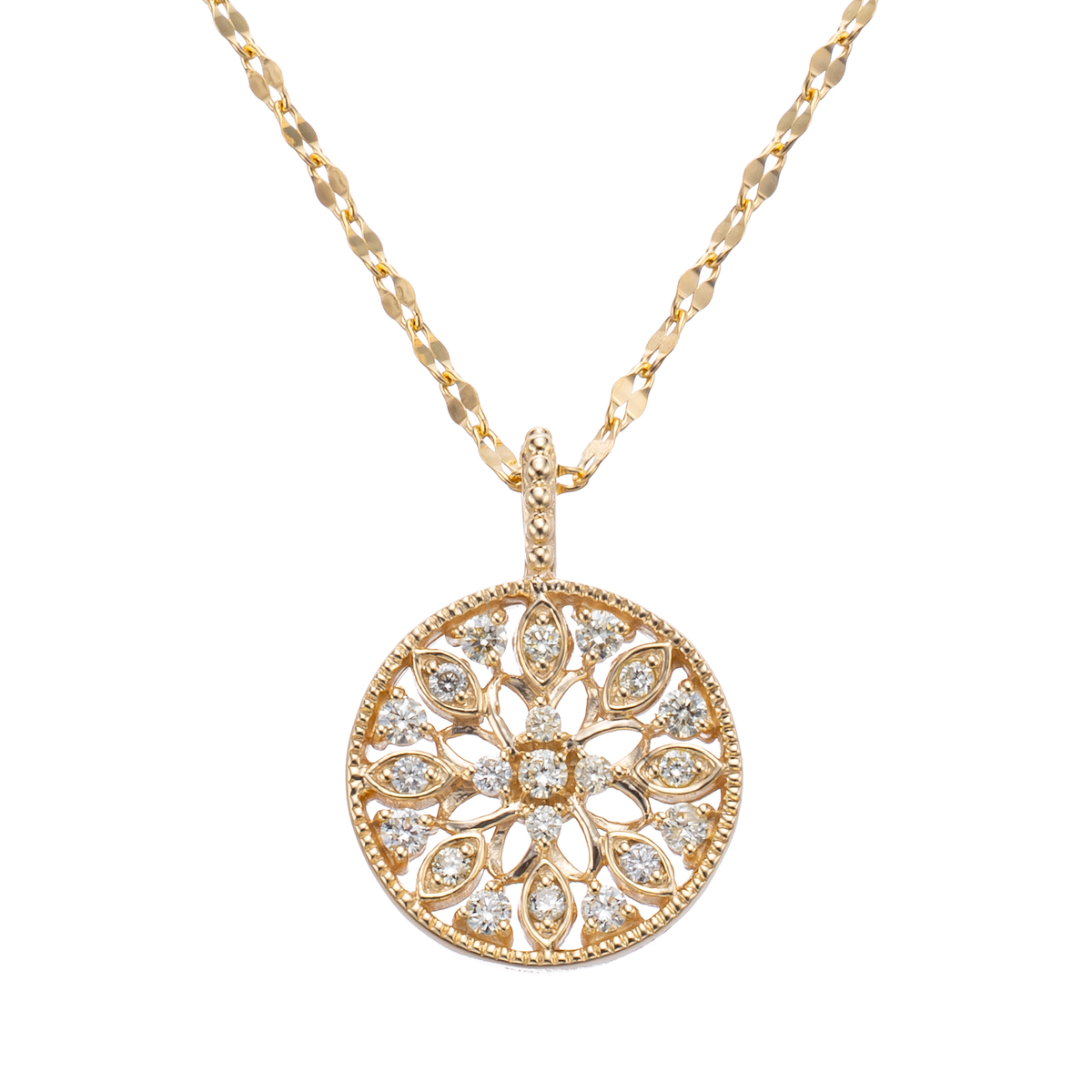 複雑に絡み合う繊細なラインと多彩な角度から輝きを放つダイヤモンドが、まるで万華鏡のような幻想的なデザインのペンダントです