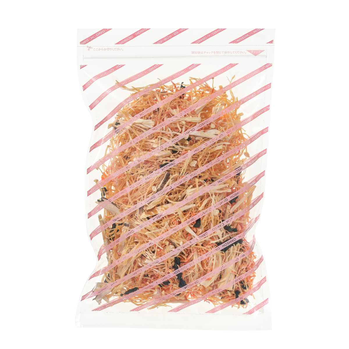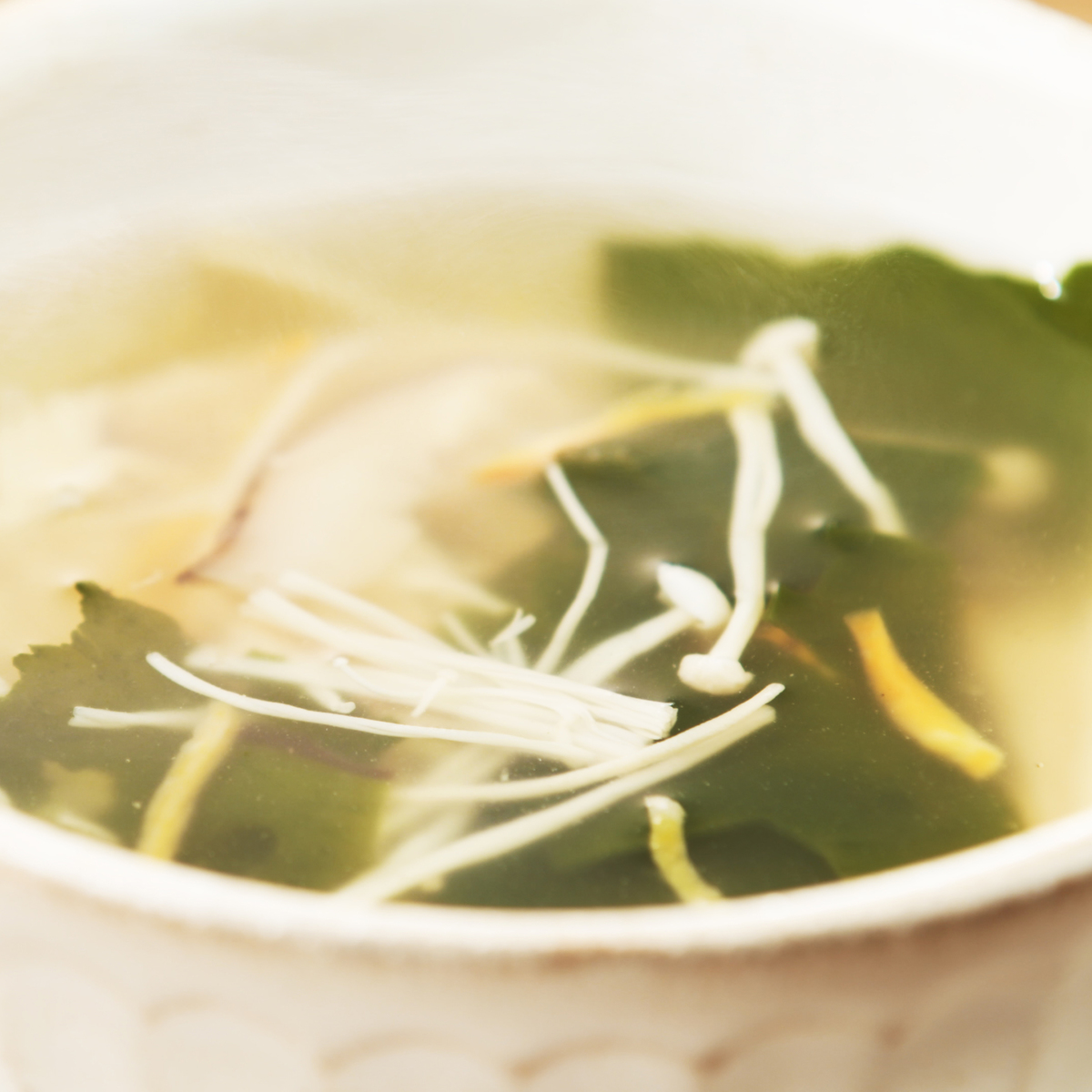 そのまま入れるだけで、具沢山のお味噌汁やスープになるキノコ入り乾燥ミックス。配合率はえのき55%、人参千切り31%、椎茸3mm7%、わかめ7%。汁物以外にもうどん・ラーメン・雑炊・炊き込みご飯などにも活躍します