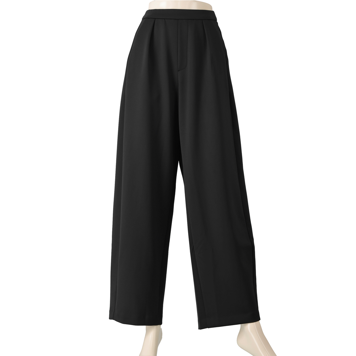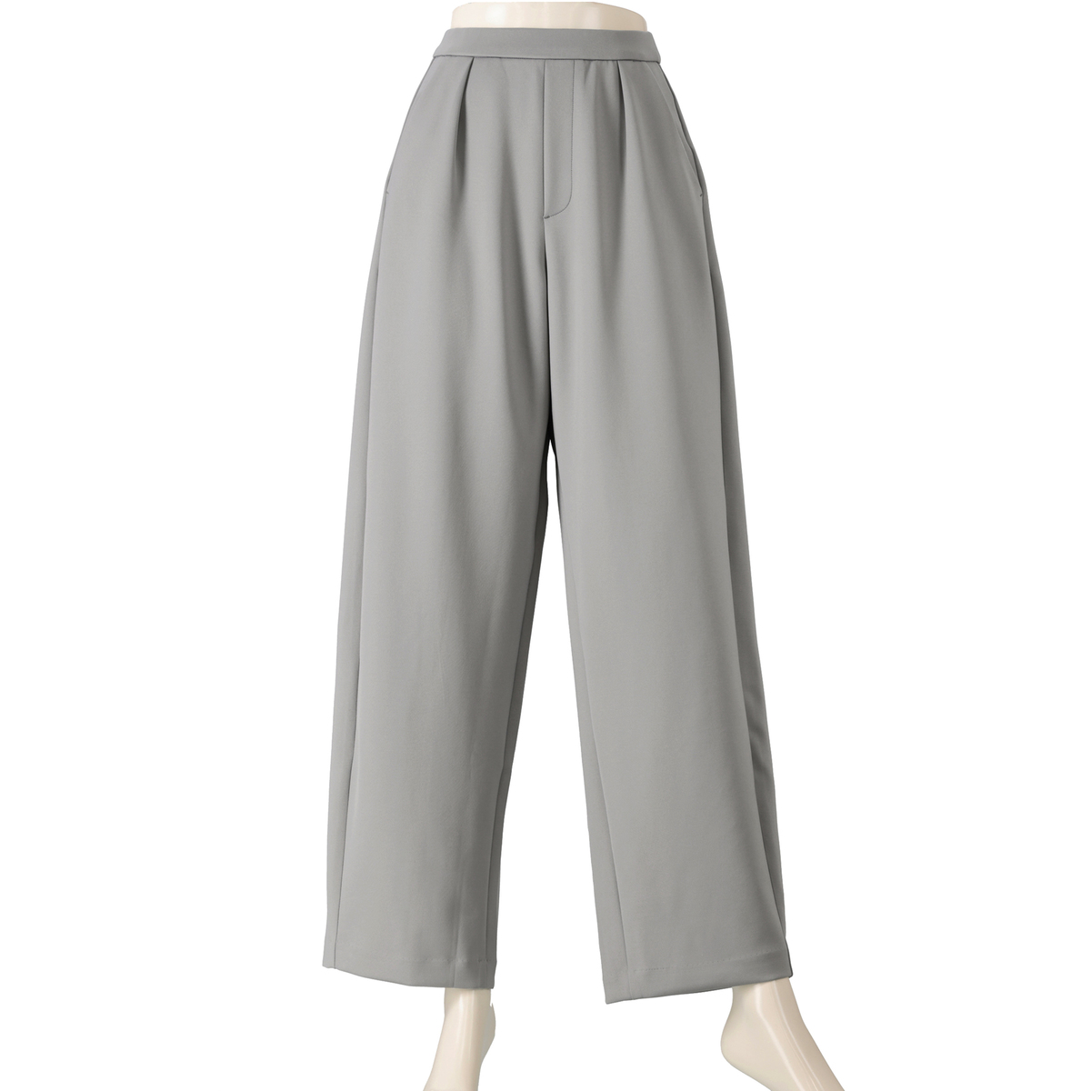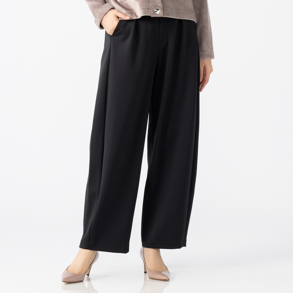 腰周りにタックを入れ、裾に向かって自然なカーブを描くパンツ。丸みのあるフォルムで身体のラインを拾いにくく、程良いボリューム感でこなれた印象を演出できます