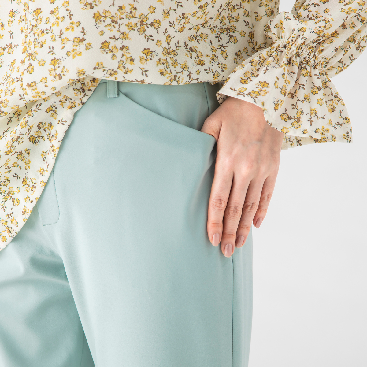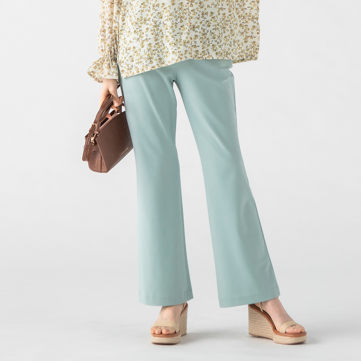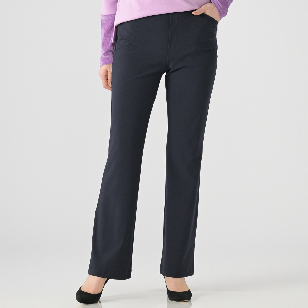 すっきりとスタイリッシュに見えるブーツカットシルエット。前はフェイク開きのステッチ入りできちんと感も。後ろはダーツで立体的なヒップを設計し、飾り片玉縁ポケットはヒップを高く見せる位置に。ウエストは総ゴム仕様の立体的な作りで、お腹周りをすっぽり包んでくれます
