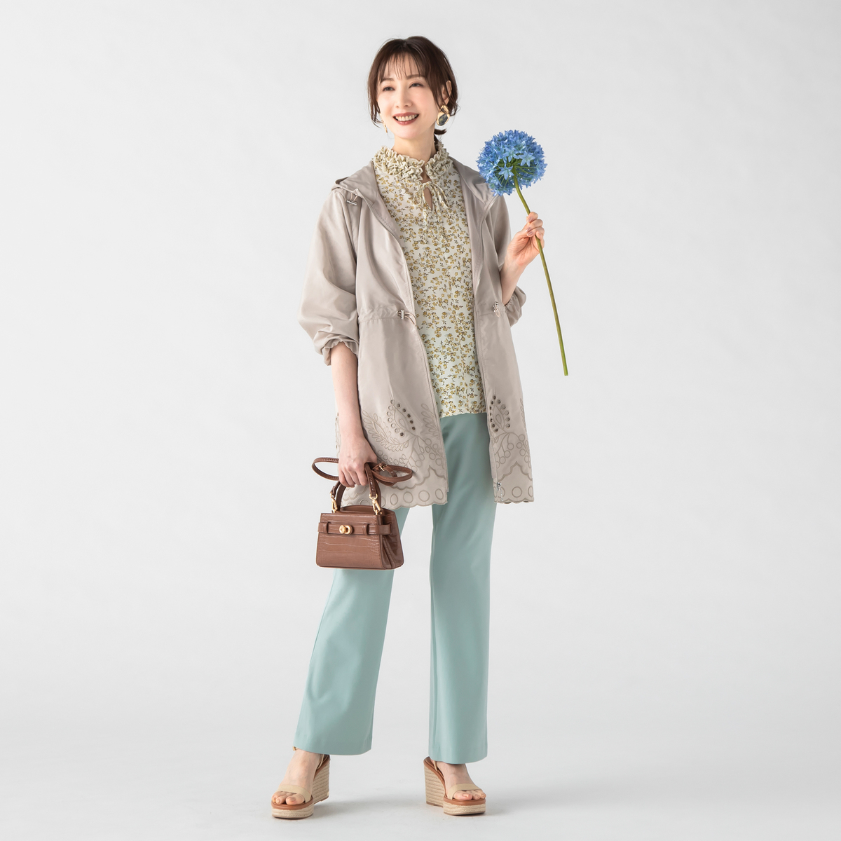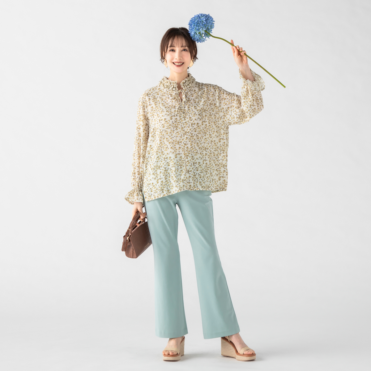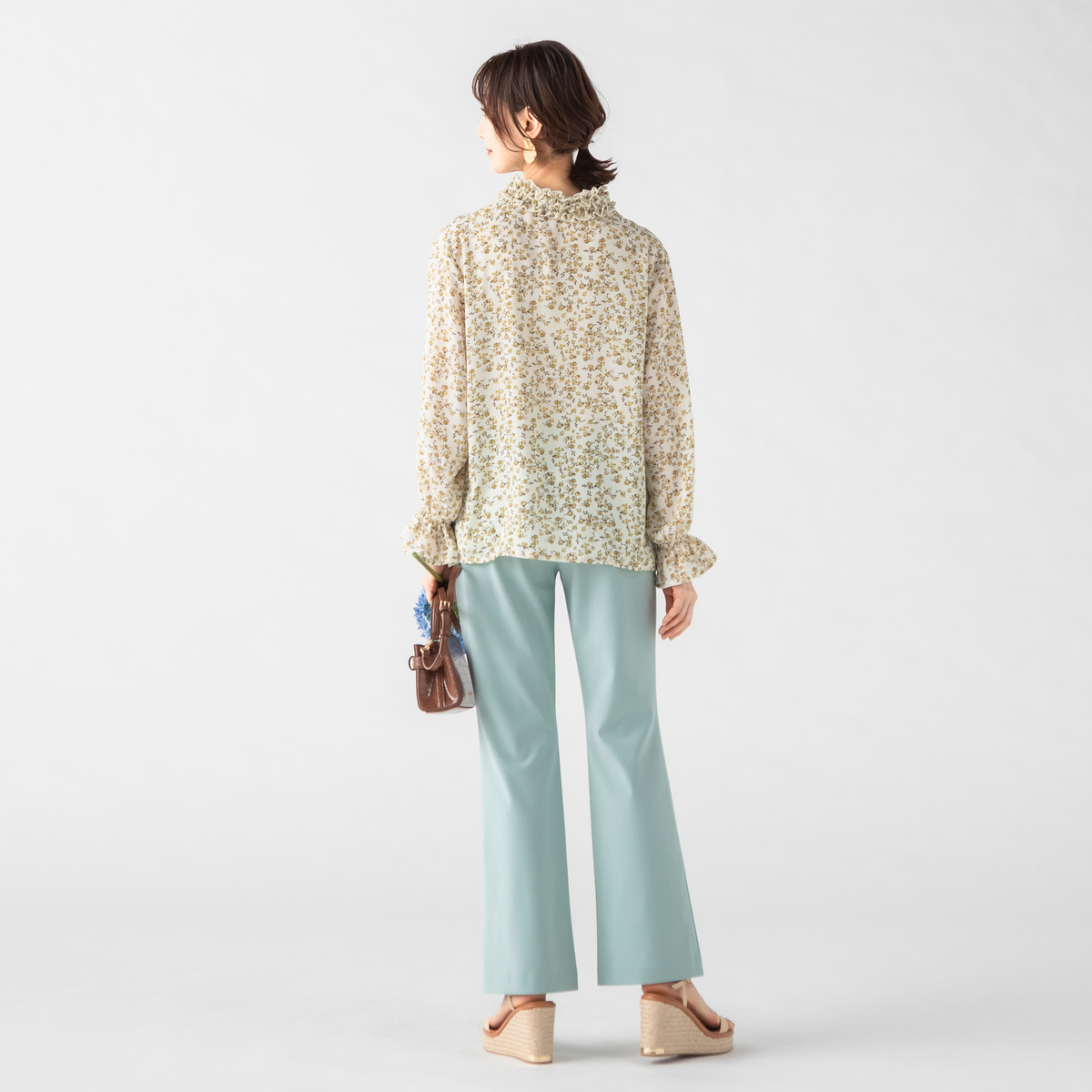 すっきりとスタイリッシュに見えるブーツカットシルエット。前はフェイク開きのステッチ入りできちんと感も。後ろはダーツで立体的なヒップを設計し、飾り片玉縁ポケットはヒップを高く見せる位置に。ウエストは総ゴム仕様の立体的な作りで、お腹周りをすっぽり包んでくれます