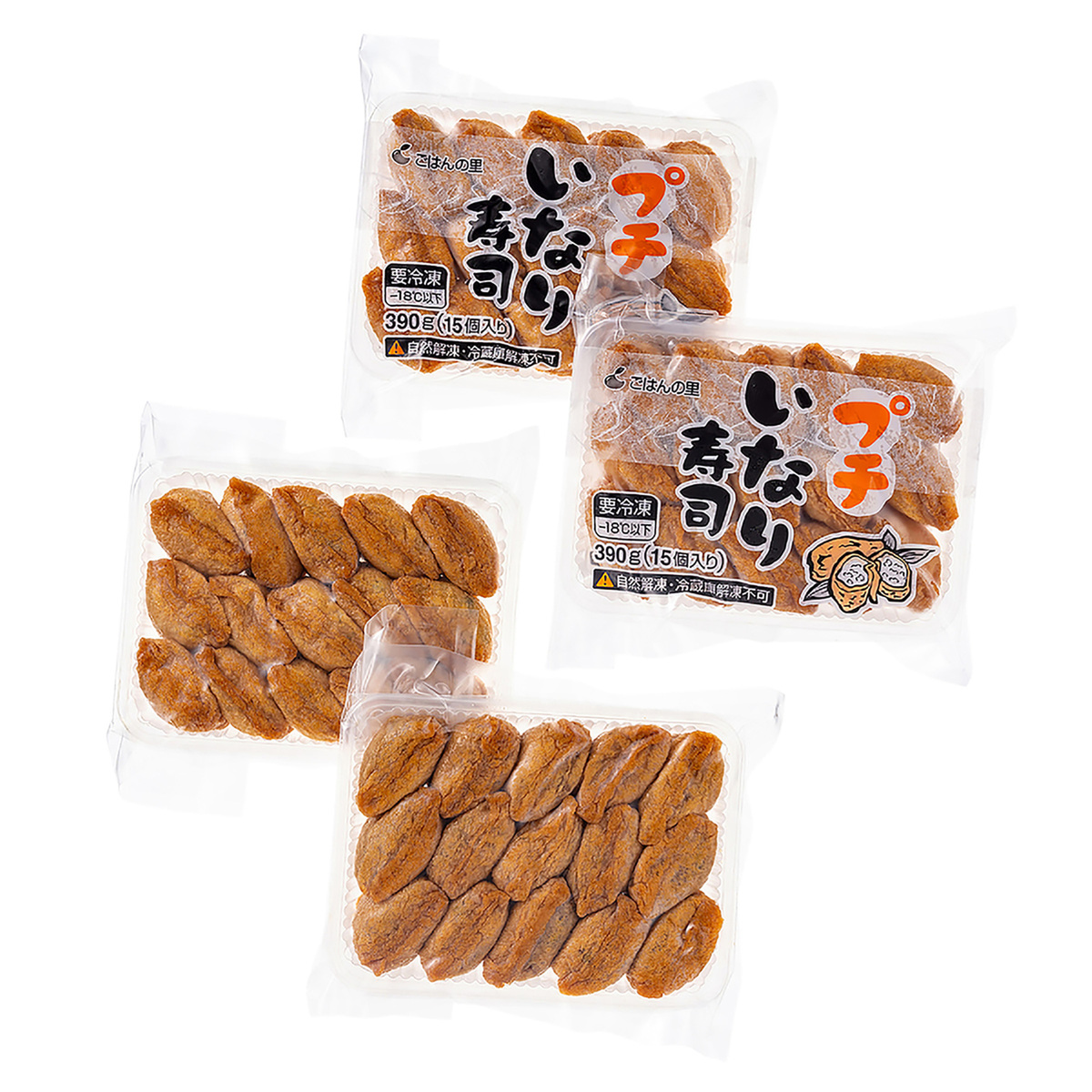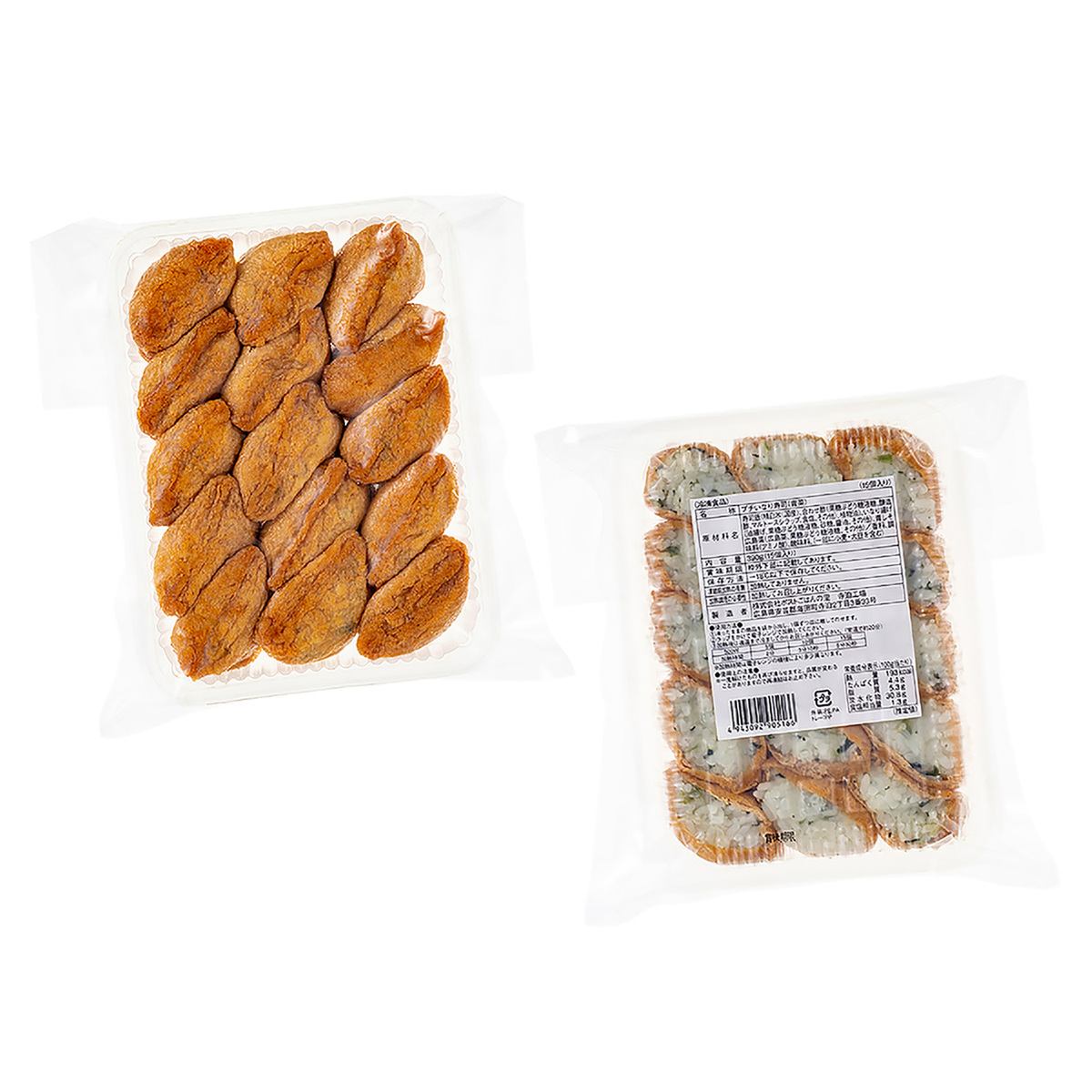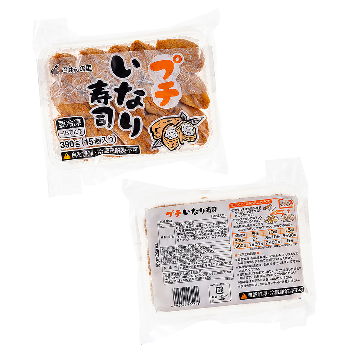 [アレルギー物質特定原材料8品目] 小麦 [セット内容] ・プレーン390g(15個入)×2パック ・黒米390g(15個入) ・青菜390g(15個入) [賞味期限] 出荷時点で賞味期限まで120日以上ある商品をお届けします [保存方法] 開封前:冷凍(ー18℃以下)で保存してください 開封後:解凍後はお早めにお召し上がりください [お召し上がり方] 電子レンジのお召し上がり方 1.凍ったままの商品を袋から出し、1個ずつ皿に離してのせます 2.ラップをかけて電子レンジで加熱してください 500Wの場合/5個:2分、10個:3分10秒、15個:5分30秒 600Wの場合/5個:1分50秒、10個:2分50秒、15個:5分 3.加熱後は適温まで冷ましてお召し上がりください(室温で約20分) ※自然解凍・冷蔵庫解凍不可 ※加熱時間はレンジの機種により多少異なります [注意事項] ※自然解凍、冷蔵庫解凍は、ごはんが白くなるなど、品質が劣化しますおで絶対にお止め下さい ※解凍後の再凍結は、品質が劣化しますので絶対にお止め下さい ※解凍後は、適温まで冷ましてからお召し上がりください ※調理の際には、やけど等に十分ご注意ください [原料原産地] プレーン、青菜:精白米(国産) 黒米:精白米(国産)、黒米(国産) [原産国] 日本 [原材料] ミニいなり寿司 プレーン:寿司飯(精白米(国産)、合わせ酢(果糖ぶどう糖液糖、醸造酢、マルトースシラップ、食塩、その他)、白ごま、植物油)、いなり揚げ(油揚げ、果糖ぶどう糖液糖、砂糖、醤油、その他)、(一部に小麦・大豆・ごまを含む) 黒米ミニいなり寿司:黒米入り寿司飯(精白米(国産)、合わせ酢(果糖ぶどう糖液糖、醸造酢、マルトースシラップ、食塩、その他)、黒米(国産)、植物油)、いなり揚げ(油揚げ、果糖ぶどう糖液糖、砂糖、醤油、その他)、(一部に小麦・大豆を含む) 青菜ミニいなり寿司:寿司飯(精白米(国産)、合わせ酢(果糖ぶどう糖液糖、醸造酢、マルトースシラップ、食塩、その他)、植物油)、いなり揚げ(油揚げ、果糖ぶどう糖液糖、砂糖、醤油、その他)、青しそ広島菜(広島菜、果糖ぶどう糖液糖、その他)/香料、調味料(アミノ酸)、酸味料、(一部に小麦・大豆を含む)