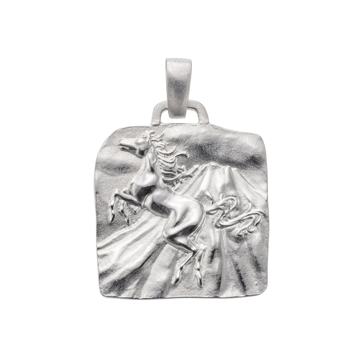 馬と富士山を施した繊細なデザインが魅力のペンダントヘッド。天に翔けていくような躍動感あふれる翔馬と、雄大な富士山を場面いっぱいにデザインしました