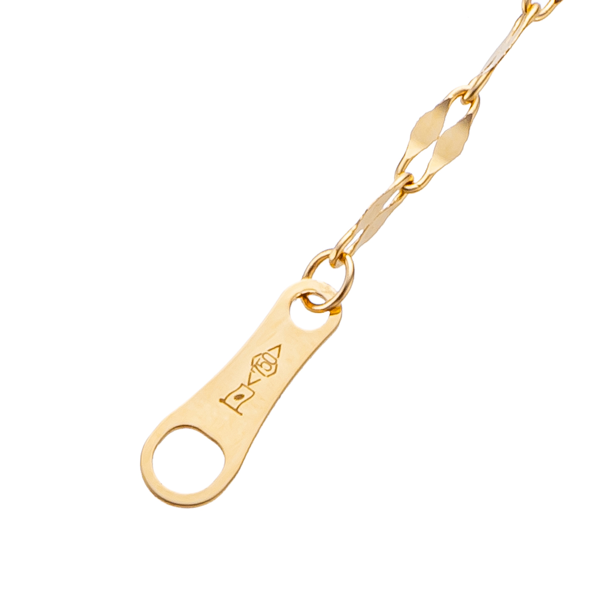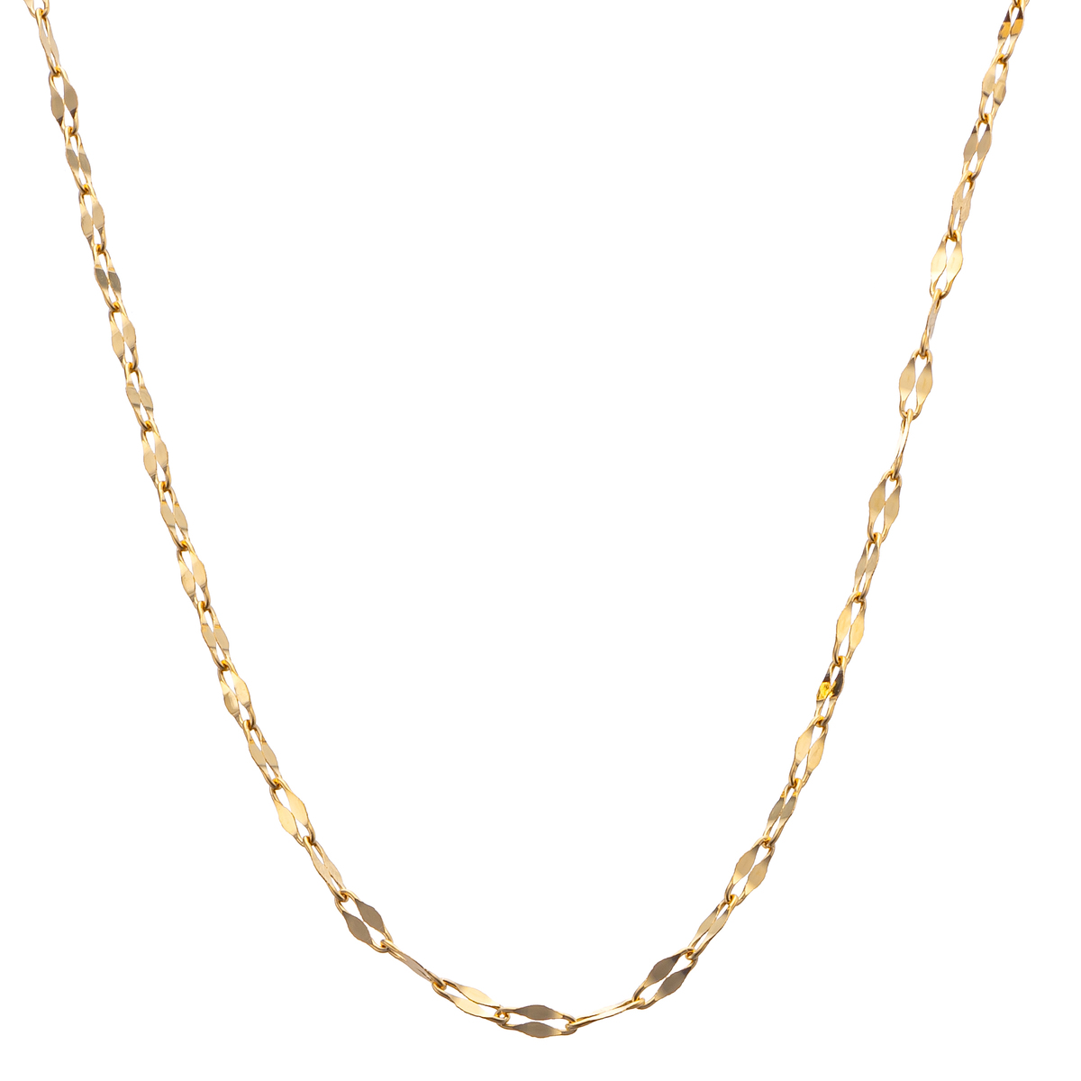 18Kイエローゴールドのペタルチェーンネックレス。花びらを連ねたような繊細なデザインが、光を受けて美しく輝きます。軽やかな着け心地で上品な印象を演出。スライド式アジャスター付きで、長さ調整も自在です