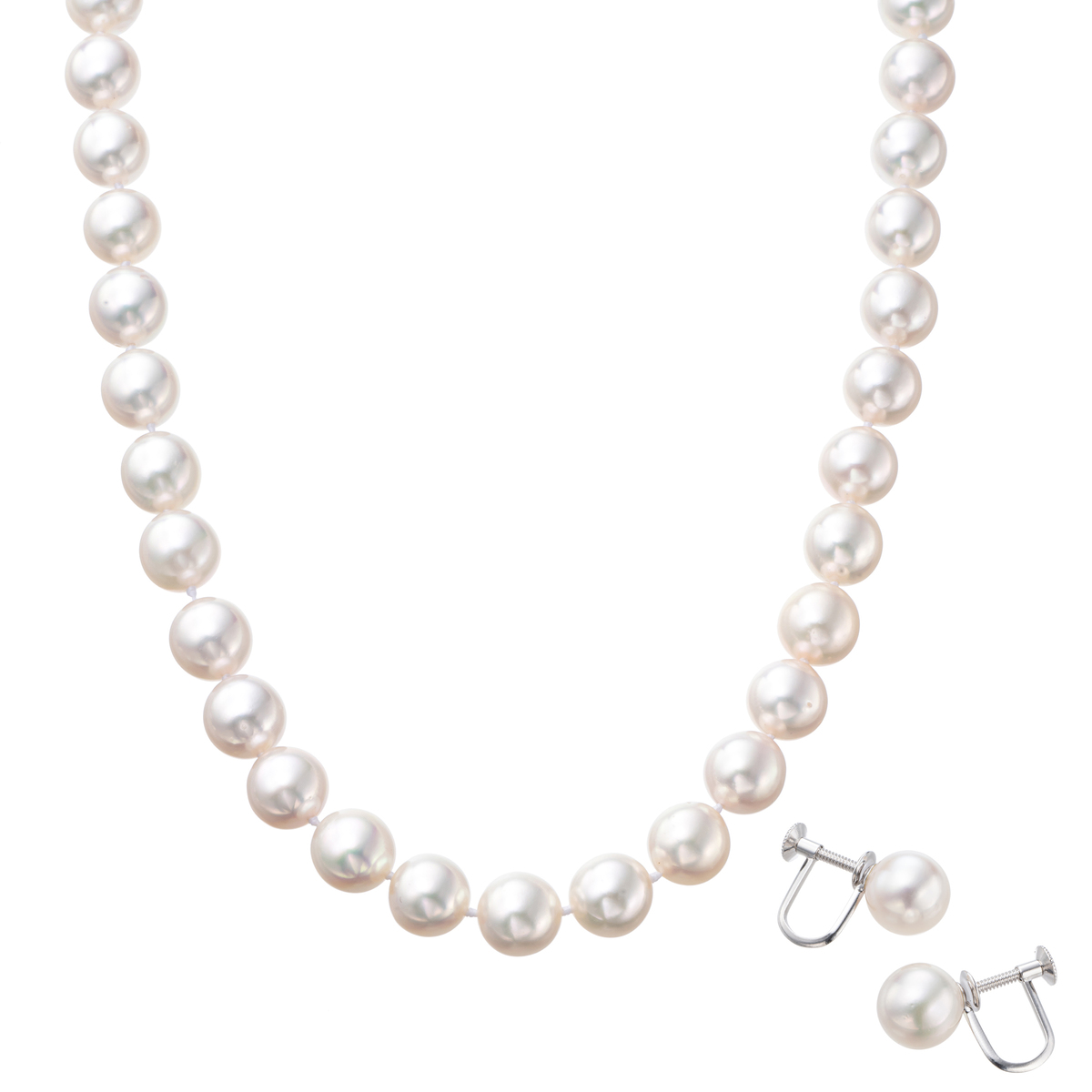 素材:<ネックレス> [アコヤ真珠] 9.0mmUP セミラウンド 貫通/オールノット <イヤリング・ピアス> [アコヤ真珠] 9.0mmUP ラウンド 芯立/接着 2珠 [地金] ネックレス:シルバー、真鍮、洋白 イヤリング:シルバー、洋白 ピアス:シルバー925 <ネックレス> 総重量(約) 45.0g 長さ(約) 45.0cm 幅(約) 9.0mm 留具の形状 差込式 アジャスターの有無 無 <イヤリング> 縦×横(約) 9.0×9.0mm(金具含まず) 総重量(約) 2.7g 留具の形状 スクリュー <ピアス> 縦×横(約) 9.0×9.0mm(金具含まず) 総重量(約) 2.3g 留具の形状 ポスト&キャッチ [メッキ] ロジウムメッキ [付属品] ケア用品、鑑別書 [ケア用品の内訳] てり畳紙/真珠リフレッシュクロス/真珠てりクロス ■素材の大きさ・形・色合い、製品のサイズは1点1点多少異なります 【日本製】