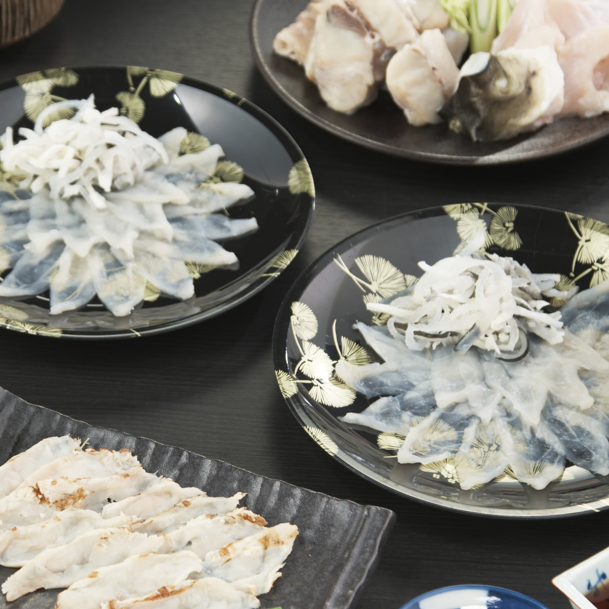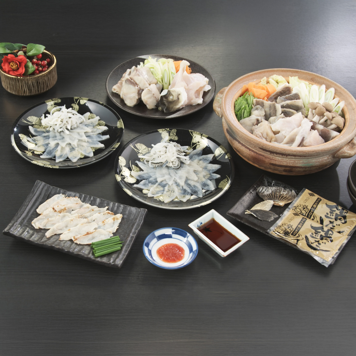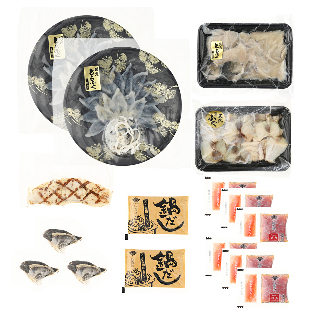 カット済み、だし付きで手間いらず。フグ刺し、炙り刺し、ちり鍋、皮刺し、ひれ酒までフルコースで。旨味が鍋に溶け出す相乗効果。アラから出るだしで鍋シメの雑炊までおいしく。ポン酢、もみじおろしも付いています