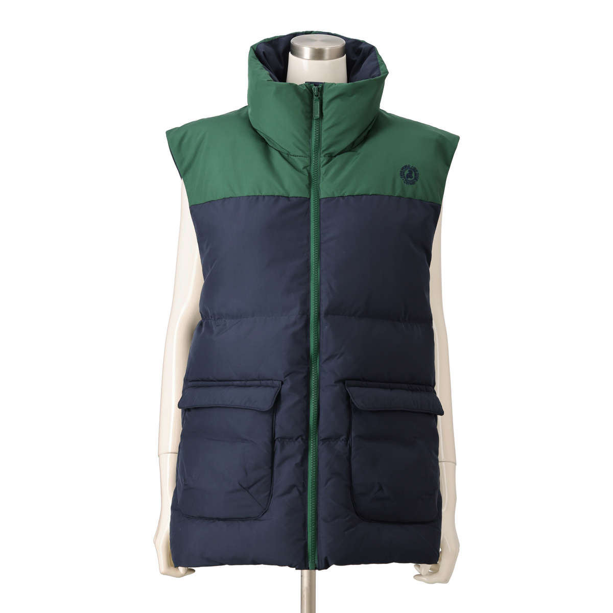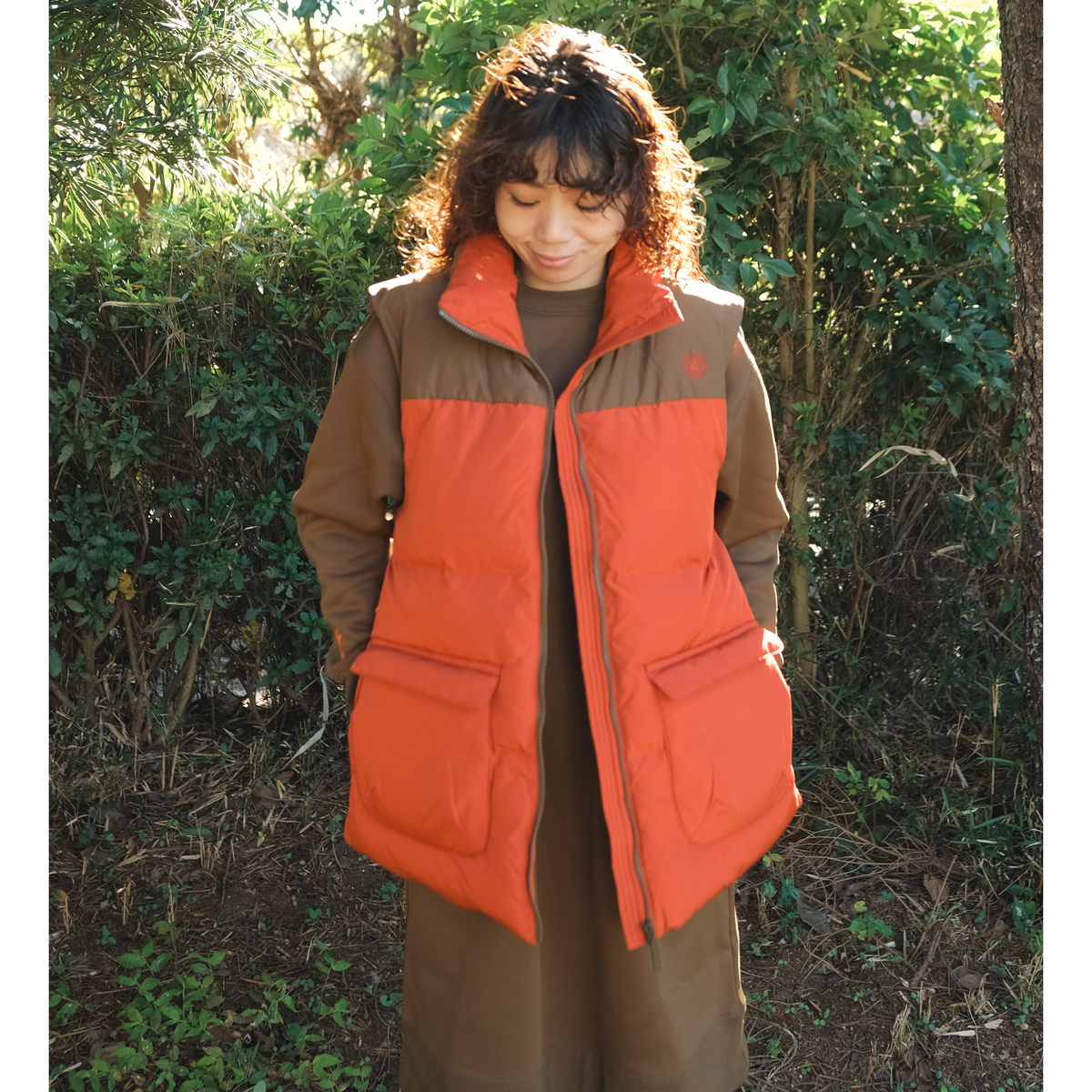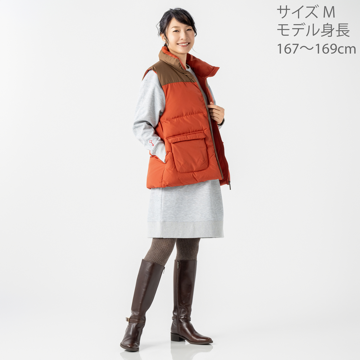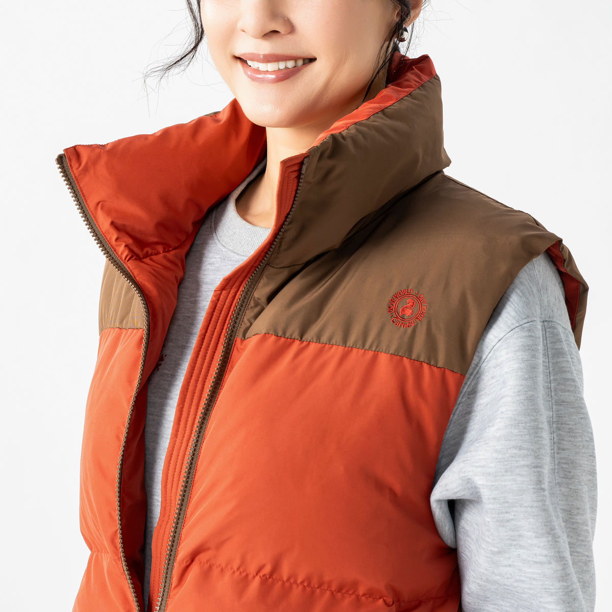 軽やかなポリエステルタフタと、保温機能のある中綿を使用したベストです。高めの衿が首元までしっかり包んで暖かく、ファスナーを開ければ小顔効果も期待できるデザイン。表衿と肩ヨークの配色デザインが、コーディネートに上品なアクセントを加えます