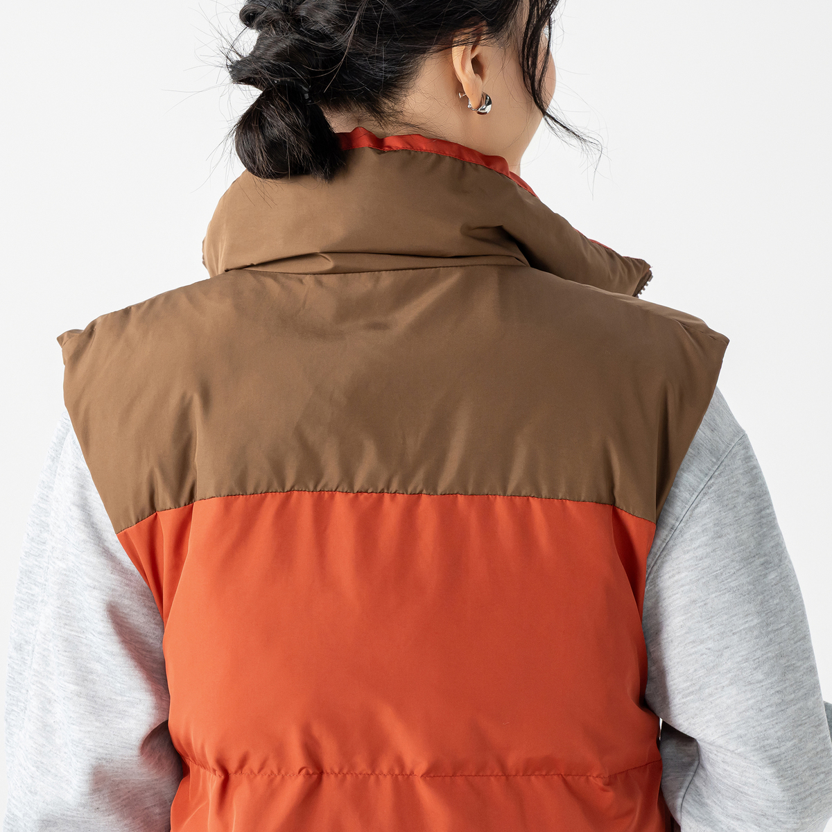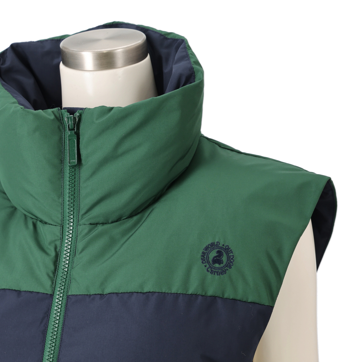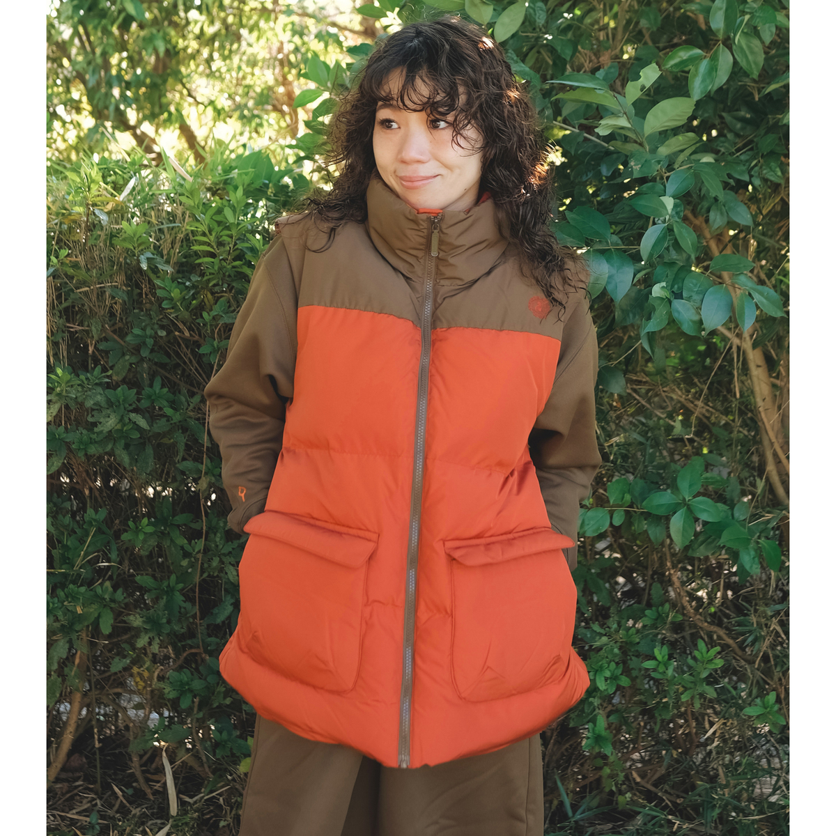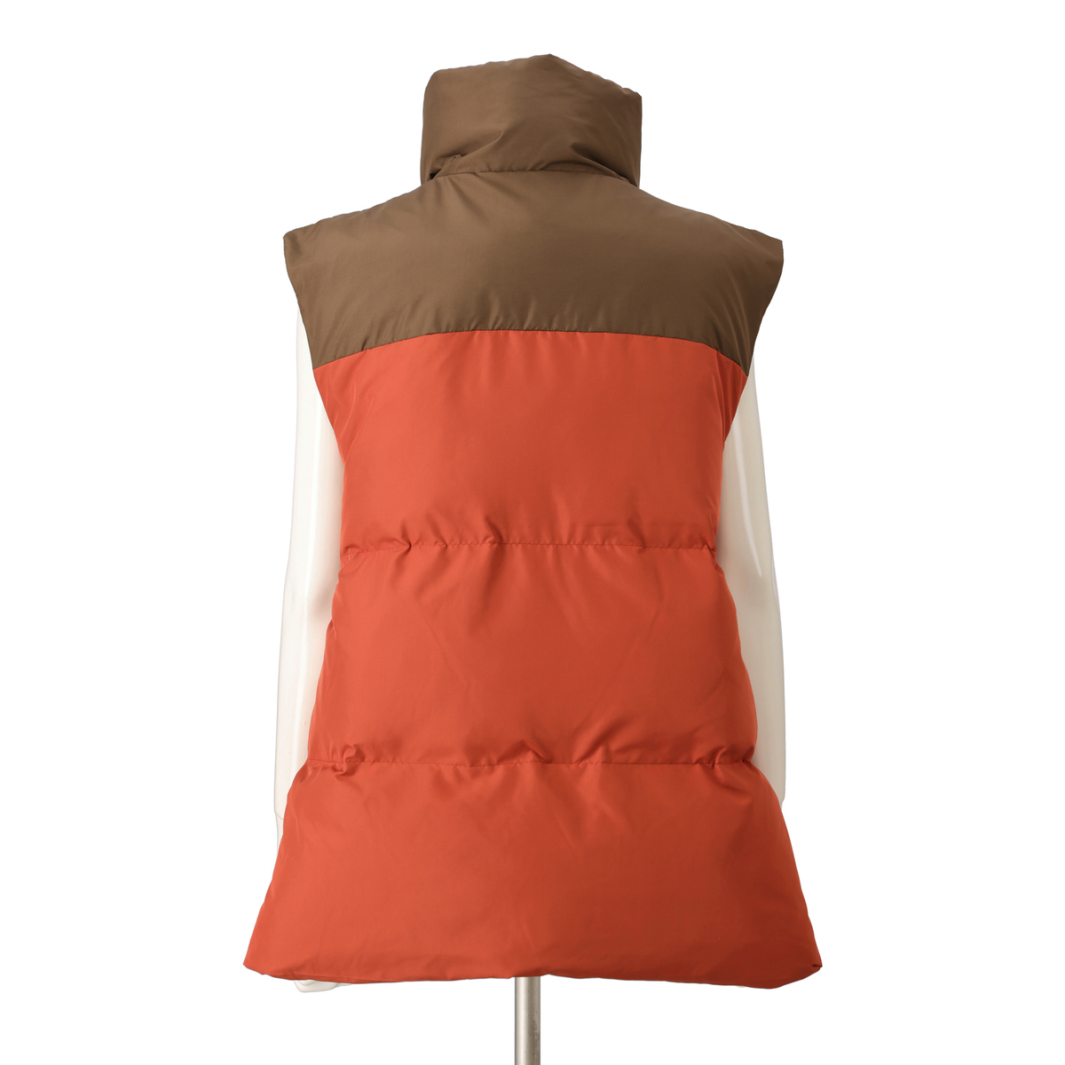 軽やかなポリエステルタフタと、保温機能のある中綿を使用したベストです。高めの衿が首元までしっかり包んで暖かく、ファスナーを開ければ小顔効果も期待できるデザイン。表衿と肩ヨークの配色デザインが、コーディネートに上品なアクセントを加えます