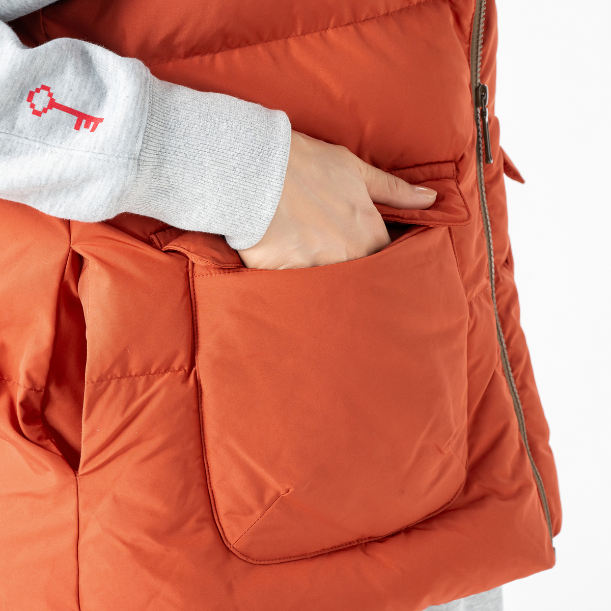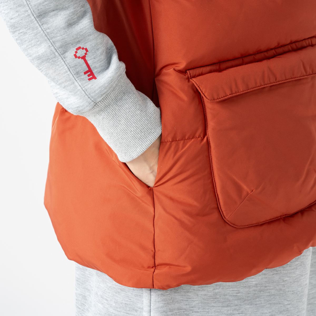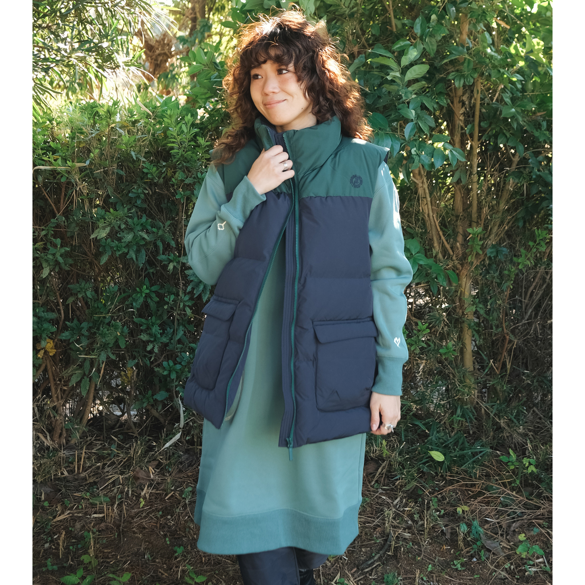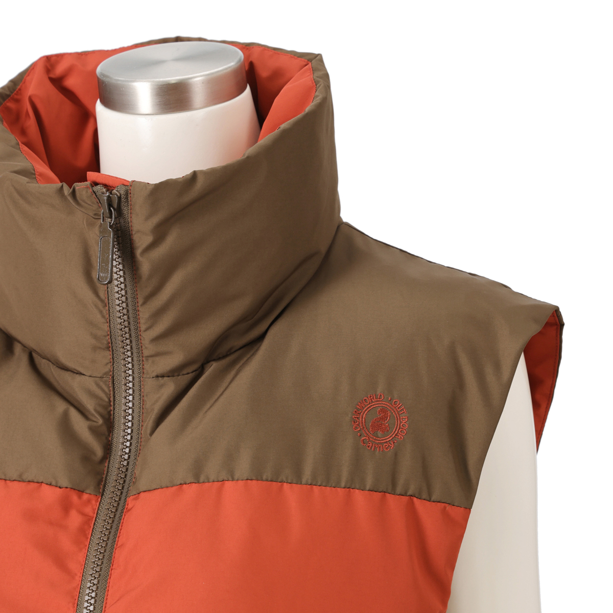 軽やかなポリエステルタフタと、保温機能のある中綿を使用したベストです。高めの衿が首元までしっかり包んで暖かく、ファスナーを開ければ小顔効果も期待できるデザイン。表衿と肩ヨークの配色デザインが、コーディネートに上品なアクセントを加えます