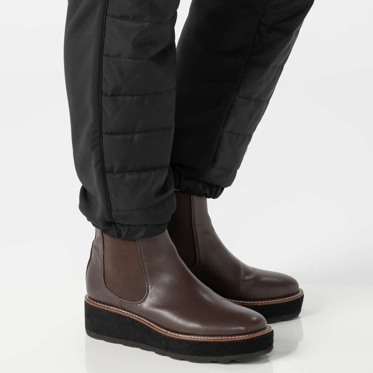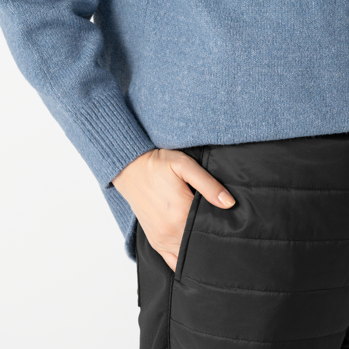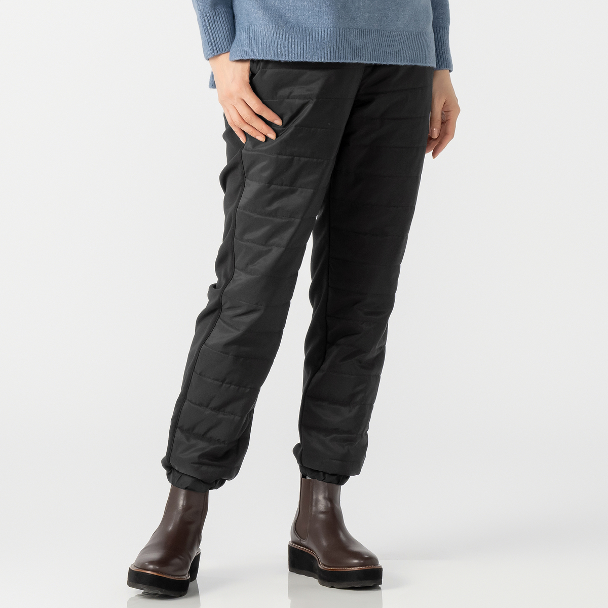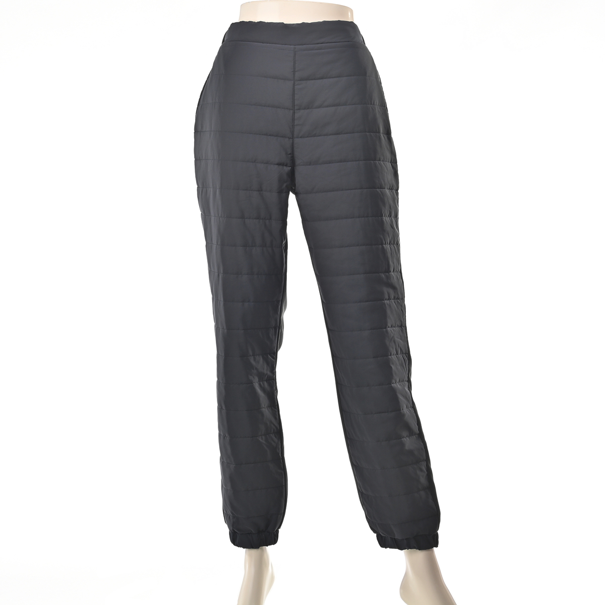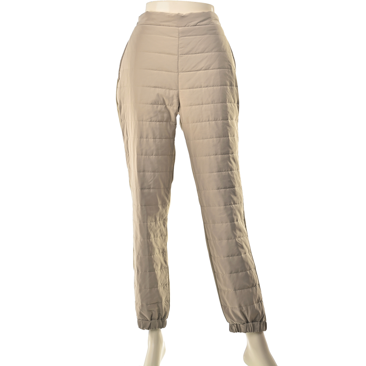 ポリエステルタフタに保温性のある薄中綿を抱かせ、横段キルトで仕上げたジョガーパンツです。キックバック性を備え、動きやすさと穿き心地を両立。シンプルなトップスとの組合せで、アクティブなスタイルに