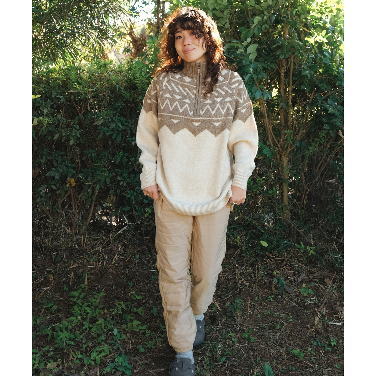 フロントは中綿入りポリエステルタフタに横段キルティング、後ろはキックバック性の高い裏起毛カットソーを採用。前後にポケットを備え、細身でもたつかず、収納力も高いパンツです