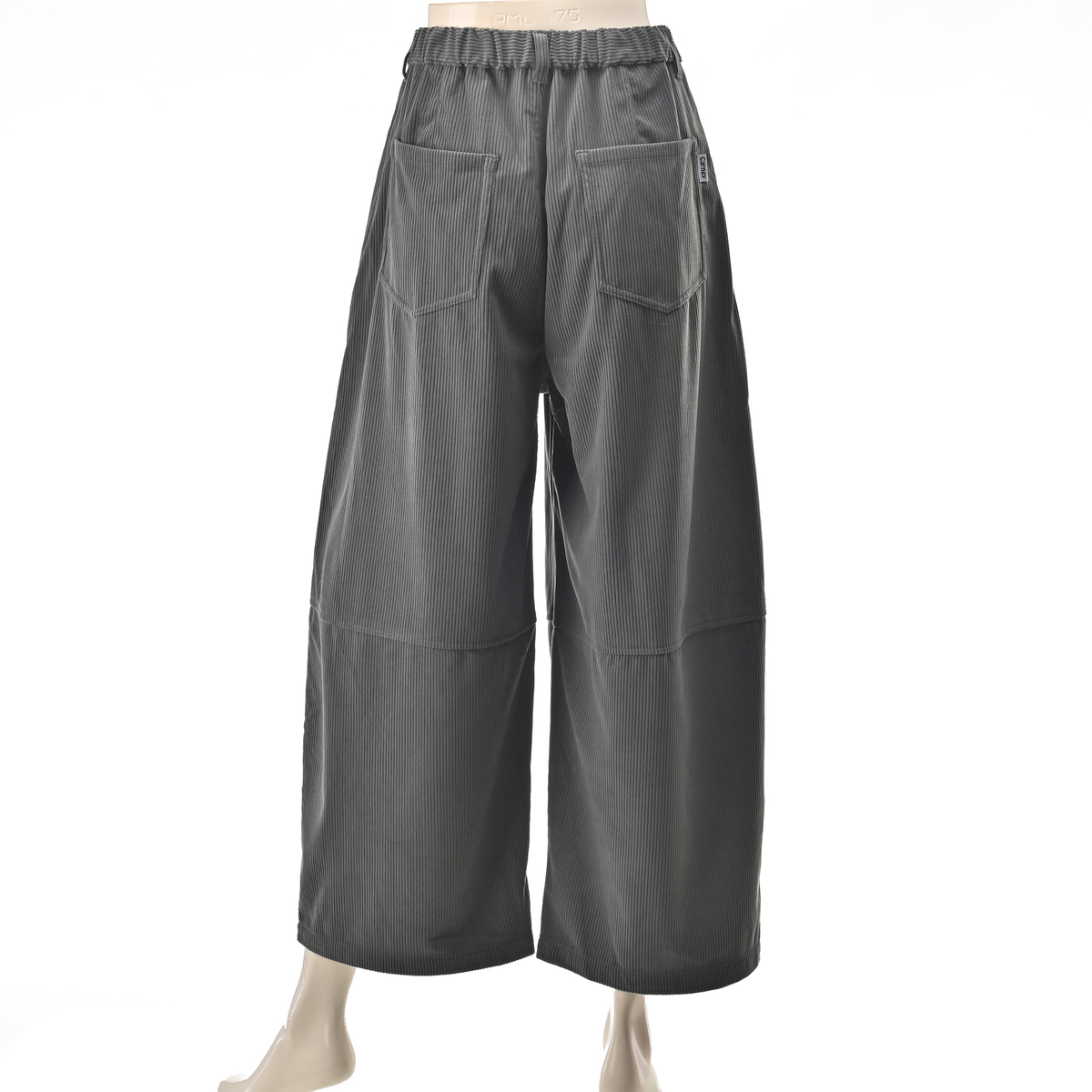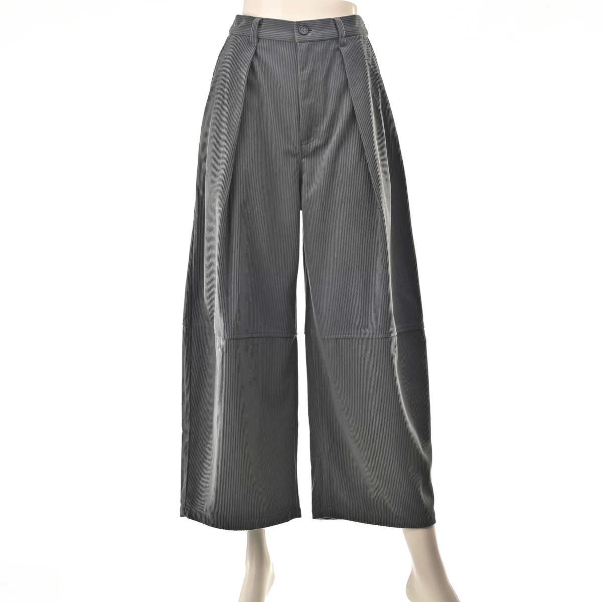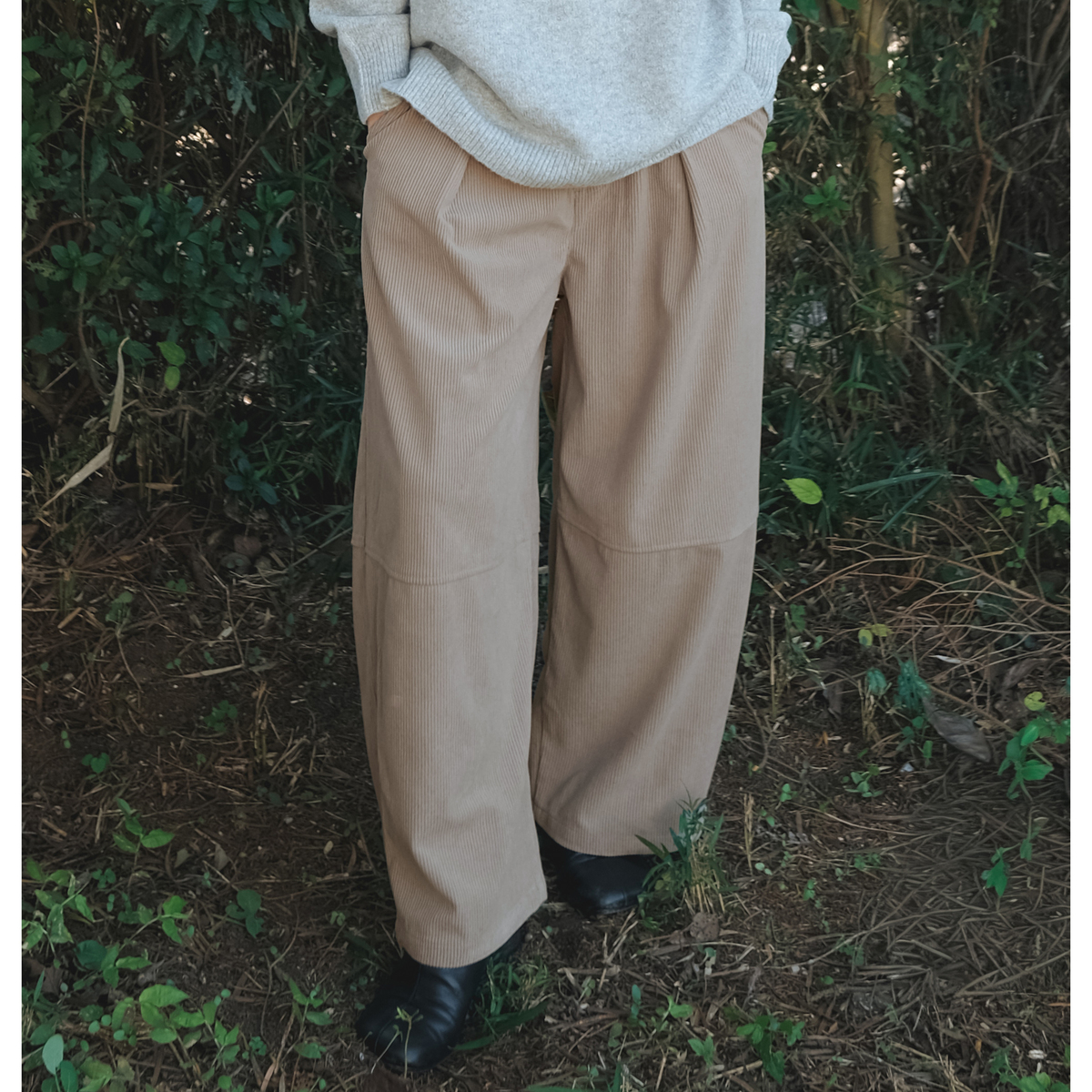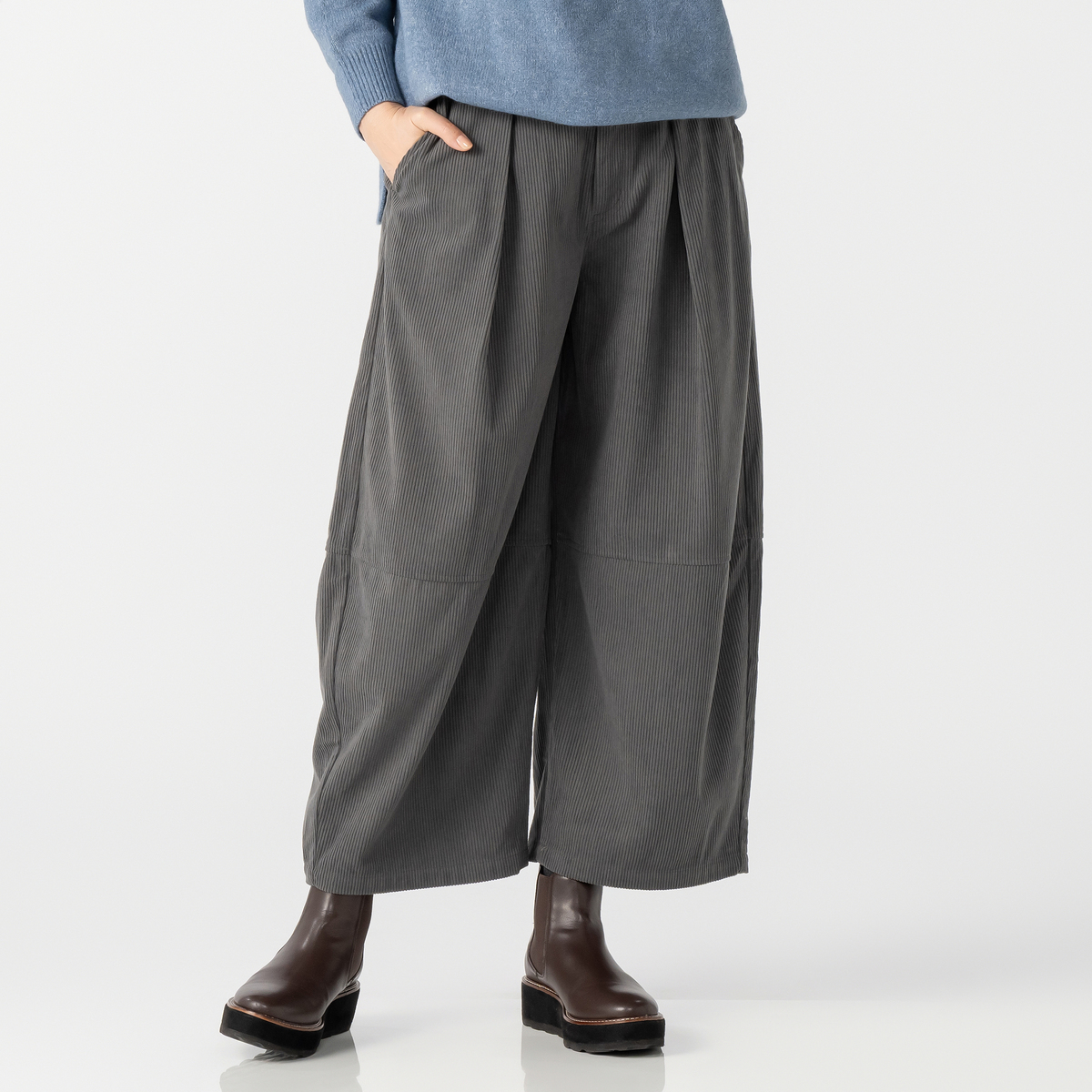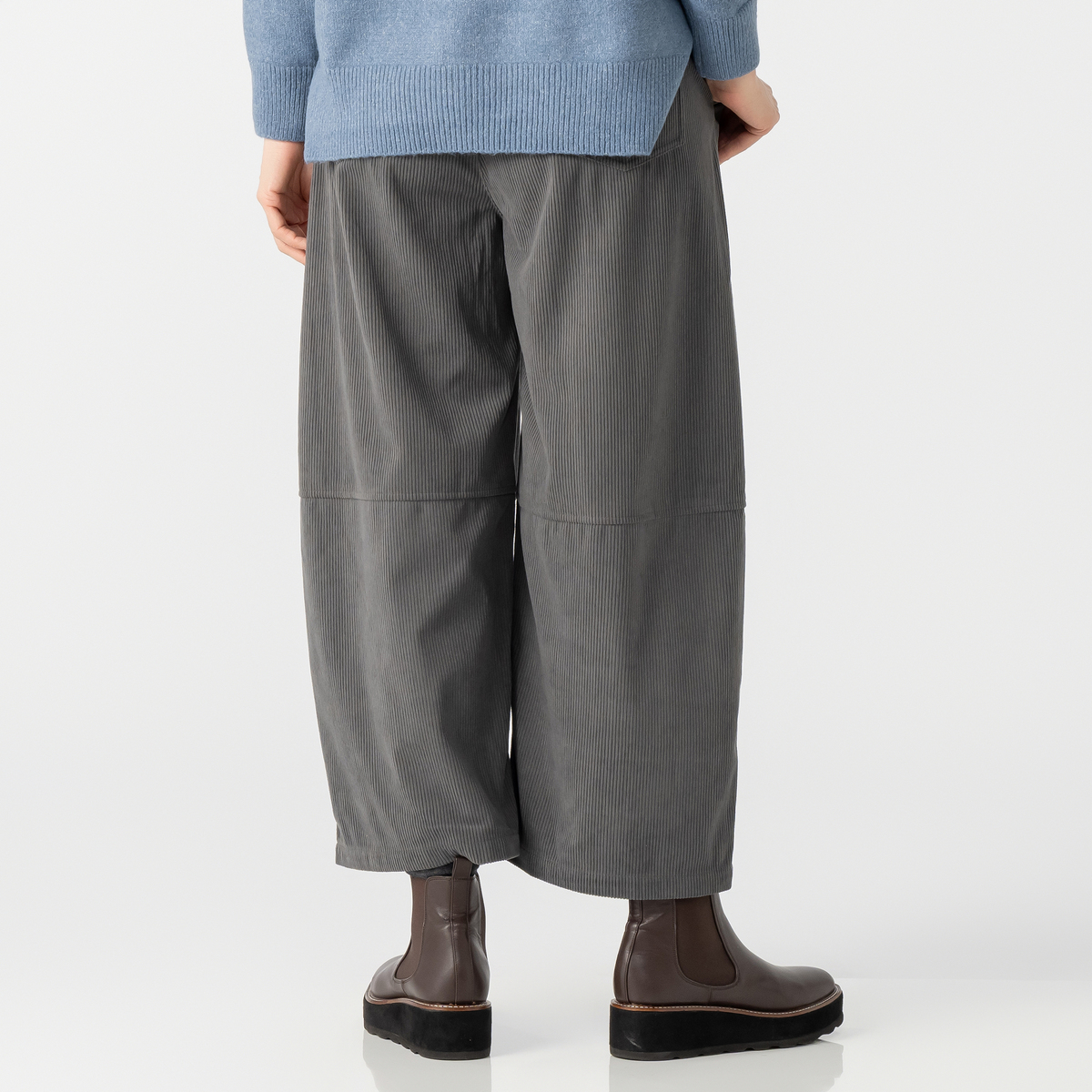 しっかりとした肉感のある、ポリエステルのニットコーデュロイを使用。適度に広めのヒップと渡りから延長したワイドシルエットを膝位置で切替え、緩やかに裾を絞った丸いシルエット。足首が見える長さのガウチョパンツを作りました